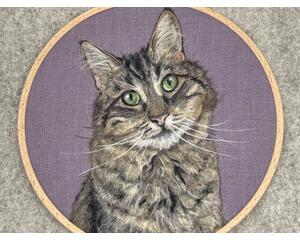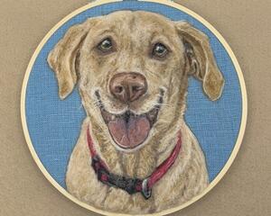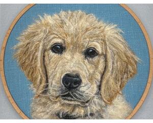 Needle felting is a very meditative art form. Using a barbed needle, small amounts of different color wool are poked into a background material. I use either linen or wool felt sheets. Layer upon layer colors are added to give depth and texture. Most of my work is pet portraits. I use a photo (pet owner’s choice) to create a wool rendition of their beloved pet.
