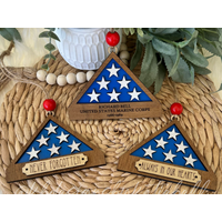 These are laser cut, stained, and completed with decorative beads, string and are hang ready!