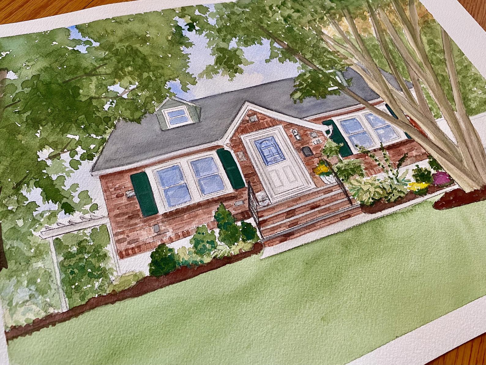 Custom Watercolor House Portrait: Hand-Painted Home Illustration Gift. 9 by 12 inch with matte and backing