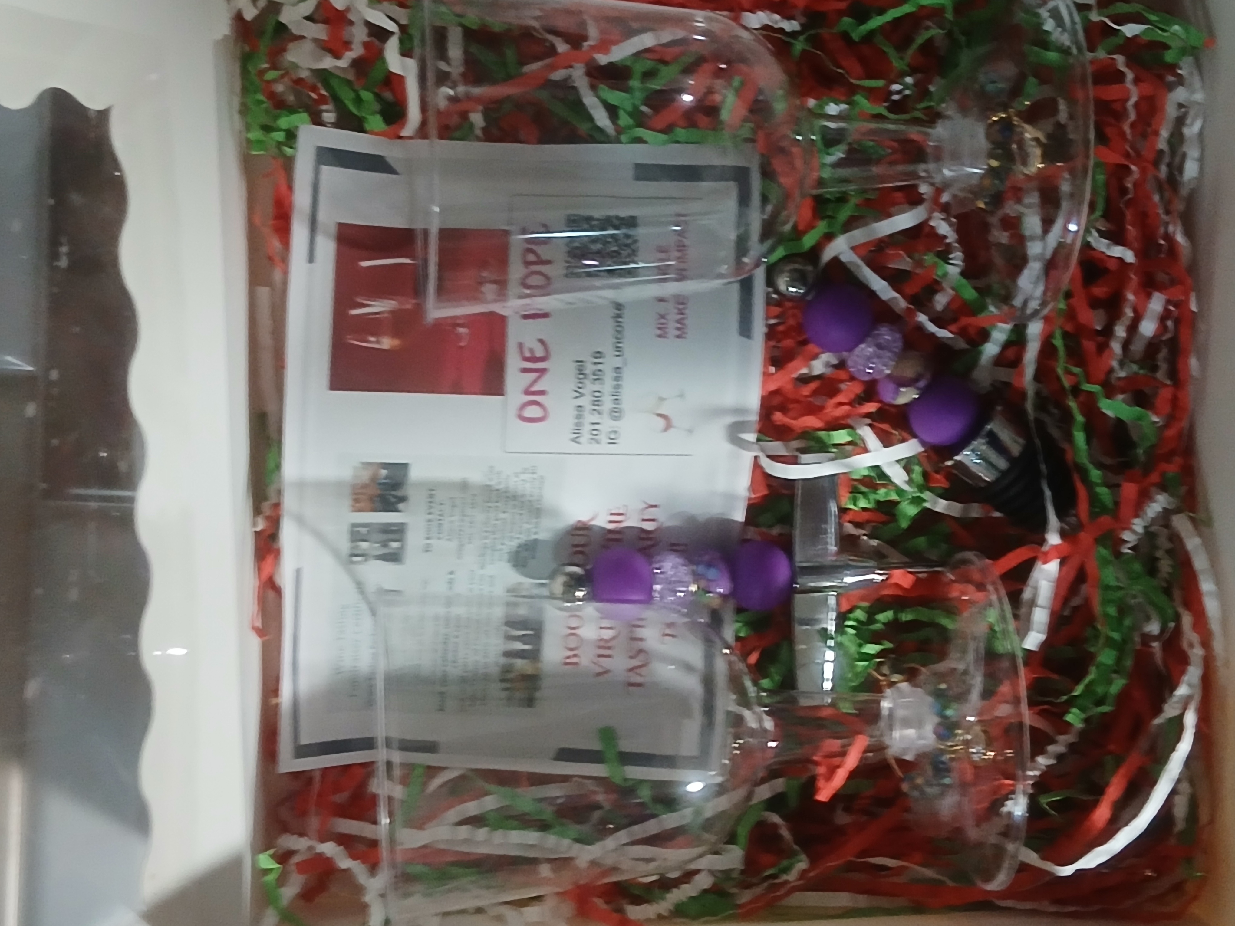Do you need a gift for someone that loves wine? Well this custom wine party in a box is just the thing for a hostess gift or just a gift. This includes a beaded cork screw wine bottle stopper and 2 plastic wine glasses with 2 hand made glass charms