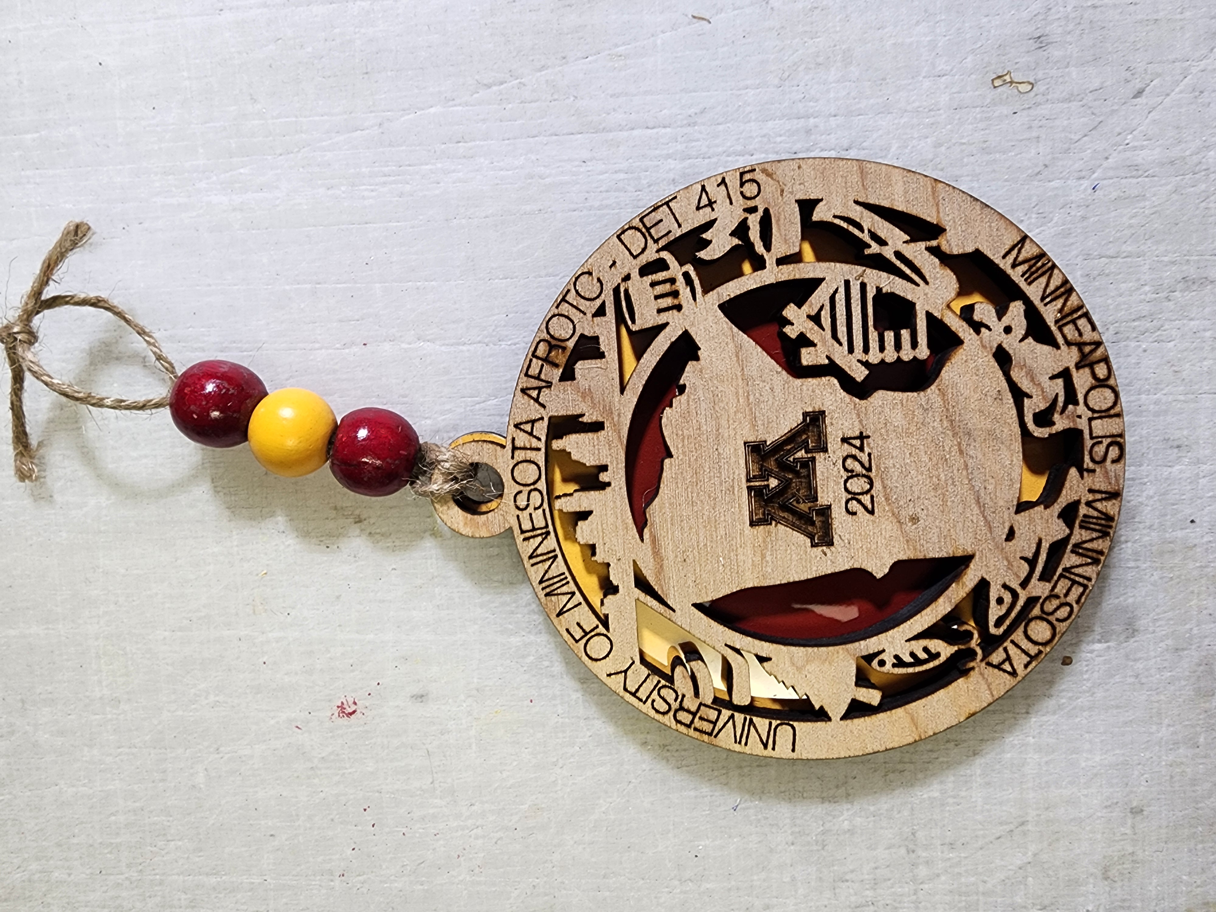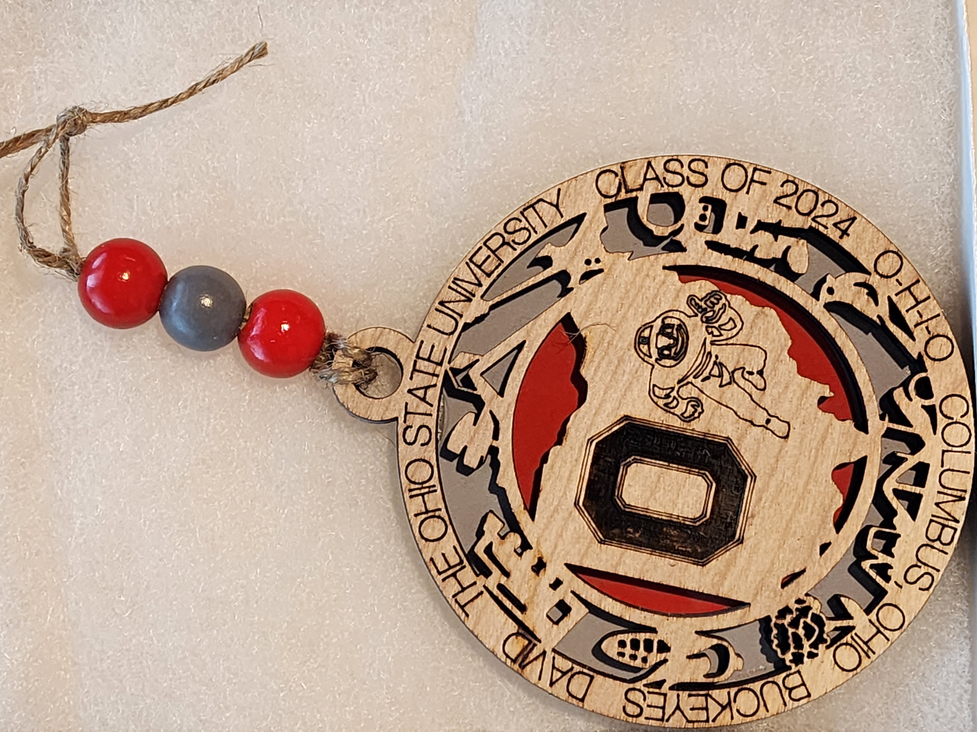 Designed by our design team, then top portion is cut out of natural wood (variations will occur), the bottom portion is cut out of sublimation mdf (which allows us to add the colors so they will not peel off), glued together, and then jute and beads are added. Each ornament will come in a gift box, so perfect for giving as a gift.