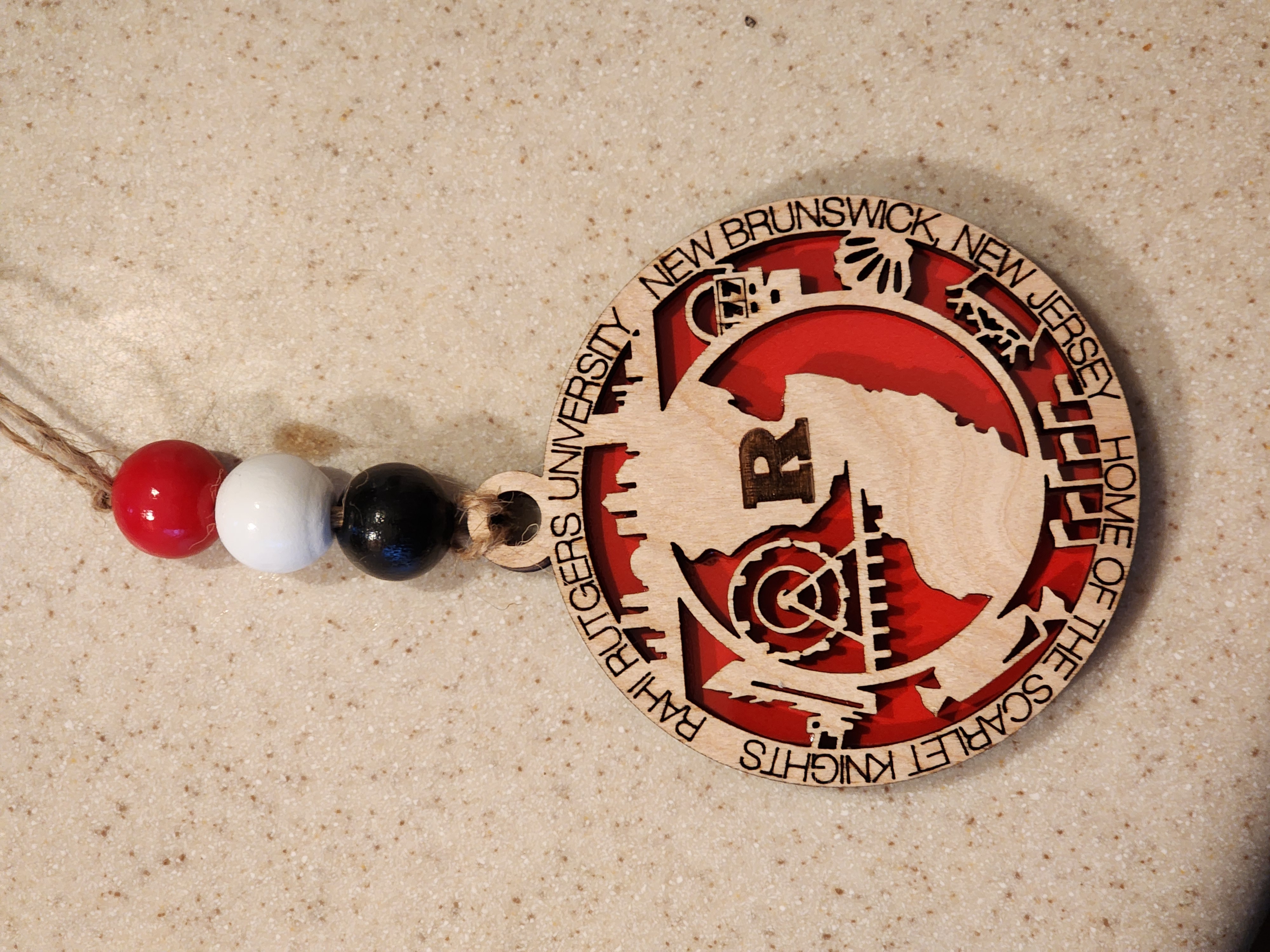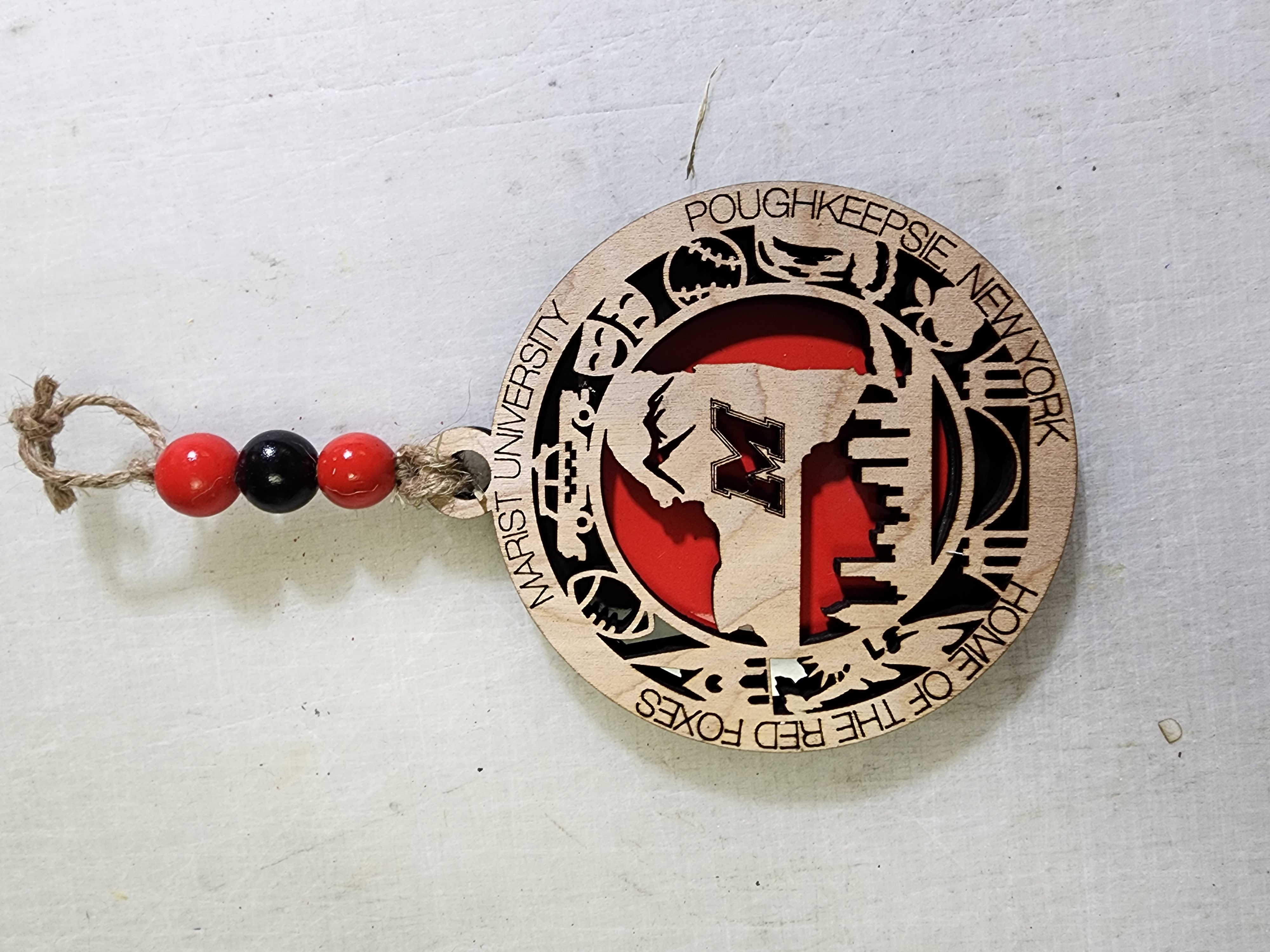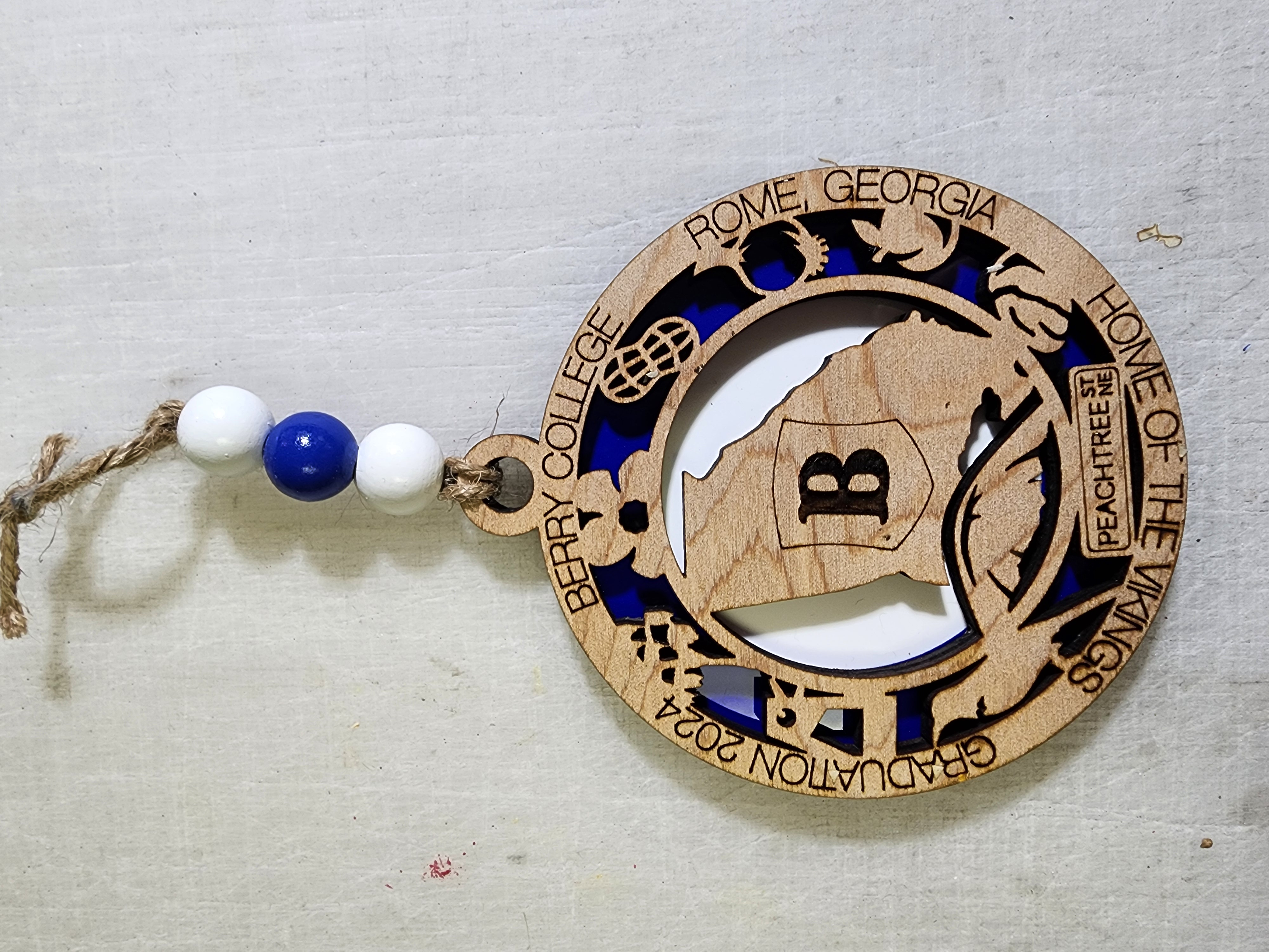 This is sure to be a conversation piece for years to come. Since each ornament is hand made, wood color may vary slightly, backer color will be the school's primary color. Each ornament comes with jute and beads (bead color to match the school colors as closely as possible). Approx. size is 4″ diameter…not just for Christmas.
