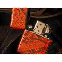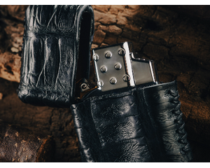 I use a wide arrangement of exotic animal hides to wrap my lighters as well as standard cow hides. Each hide or skin is different and no 2 are alike. These are 100% hand made and there is no standard to go by. I have to measure and carefully calculate each hide for these because some flex more then others. I use genuine Zippo lighters with a choice of fuel insert. Butane or standard lighter fluid. The butane insert is a more wind proof flame like a torch as opposed to the standard old school Zippo style insert which is a regular flame. They all don't line up exactly sometimes because they are all one off's basically.These are very unique and you won't fine too many people wrapping these lighters in these types of hides because they are expensive and rare sometimes.