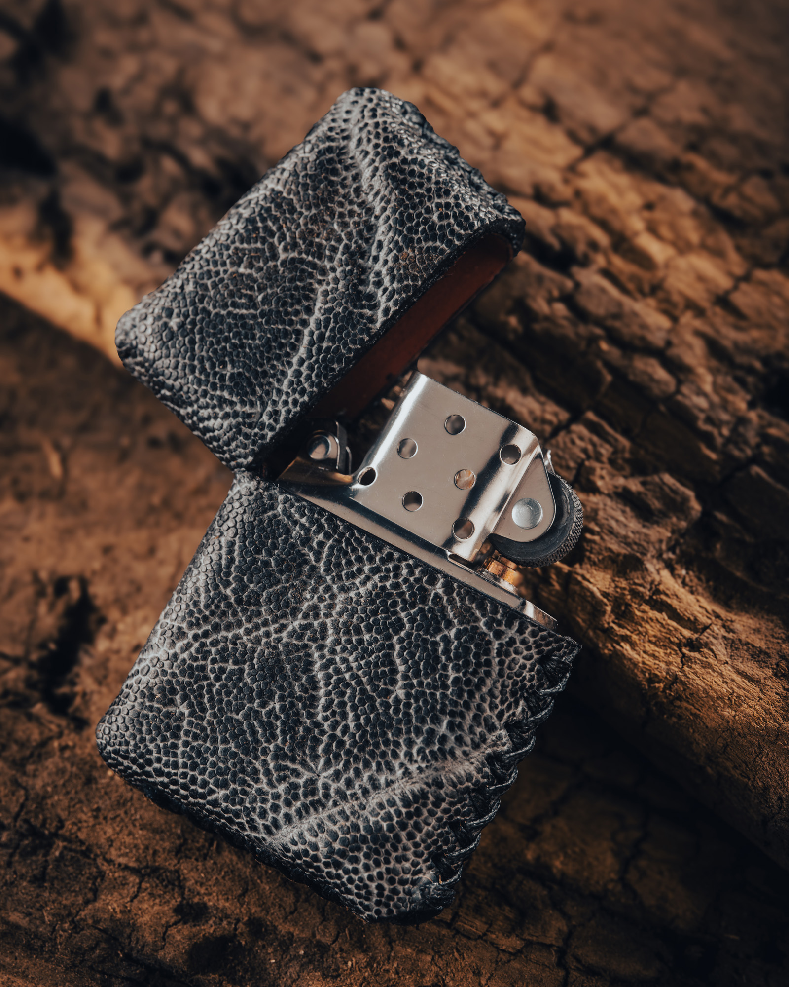I use a wide arrangement of exotic animal hides to wrap my lighters as well as standard cow hides. Each hide or skin is different and no 2 are alike. These are 100% hand made and there is no standard to go by. I have to measure and carefully calculate each hide for these because some flex more then others. I use genuine Zippo lighters with a choice of fuel insert. Butane or standard lighter fluid. The butane insert is a more wind proof flame like a torch as opposed to the standard old school Zippo style insert which is a regular flame. They all don't line up exactly sometimes because they are all one off's basically.These are very unique and you won't fine too many people wrapping these lighters in these types of hides because they are expensive and rare sometimes.