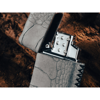I use a wide arrangement of exotic animal hides to wrap my lighters as well as standard cow hides. Each hide or skin is different and no 2 are alike. These are 100% hand made and there is no standard to go by. I have to measure and carefully calculate each hide for these because some flex more then others. I use genuine Zippo lighters with a choice of fuel insert. Butane or standard lighter fluid. The butane insert is a more wind proof flame like a torch as opposed to the standard old school Zippo style insert which is a regular flame. They all don't line up exactly sometimes because they are all one off's basically.These are very unique and you won't fine too many people wrapping these lighters in these types of hides because they are expensive and rare sometimes.
