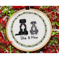 Each portrait is hand stitched on 14 count Aida fabric using DMC floss, and include the following: Full body pet rendition, Name, Floral Border.