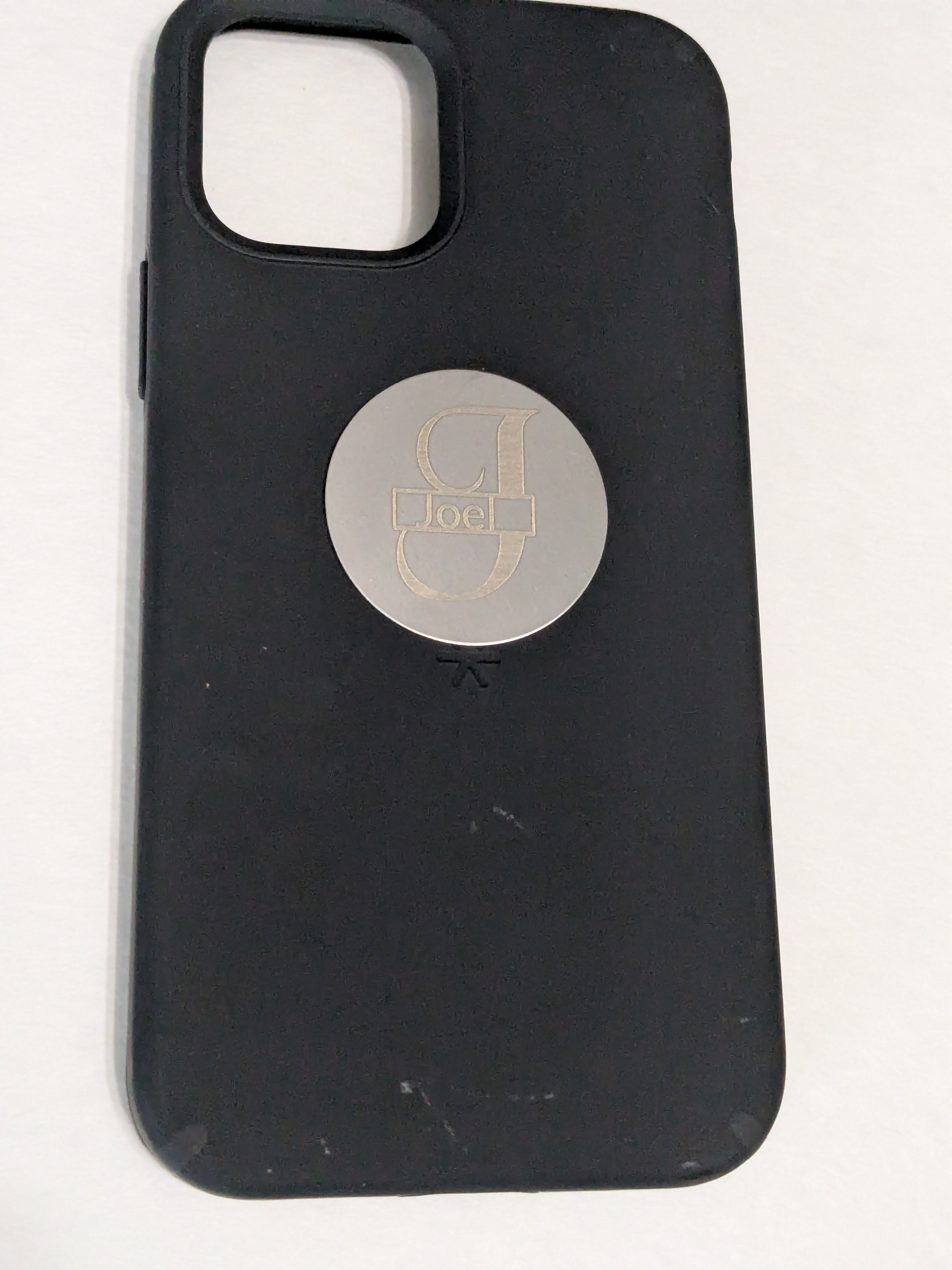 These plates are made of polished iron. They use 3m adhesive to stick to your pre-existing phone case. They are stylish and functional. They work with a wide variety of magnetic car dash cell phone holder. We will be happy to engrave these with the picture shown or me can do your monograms.