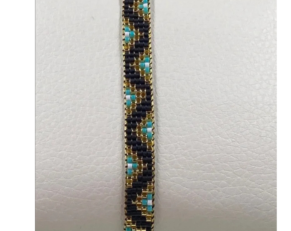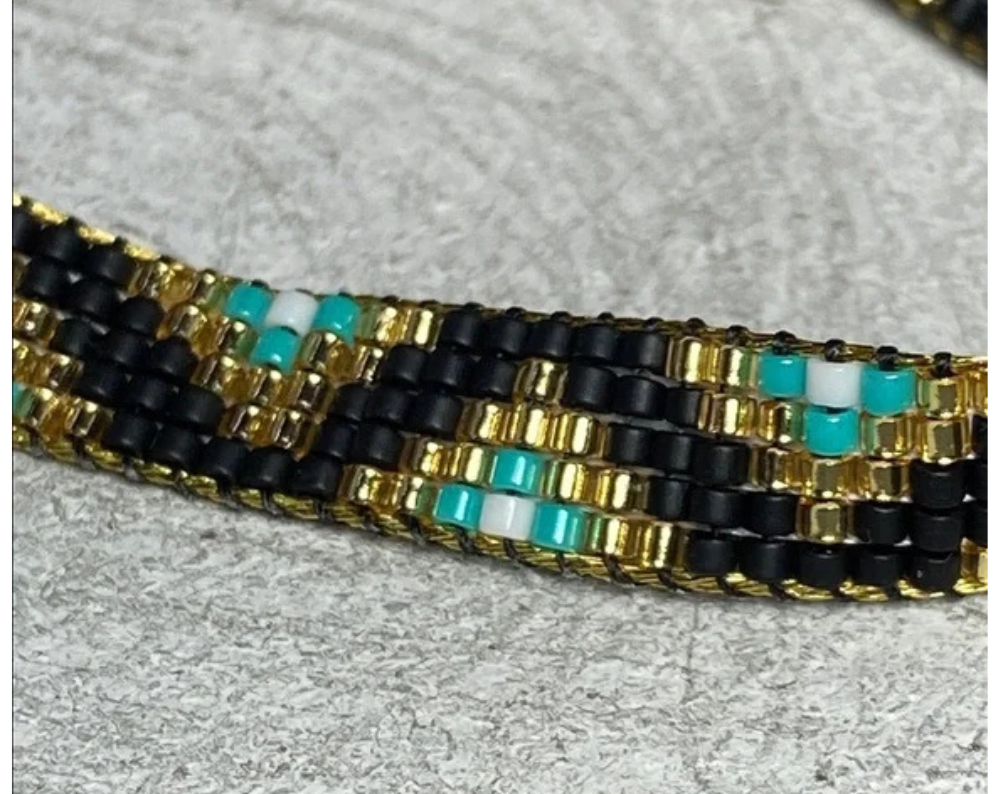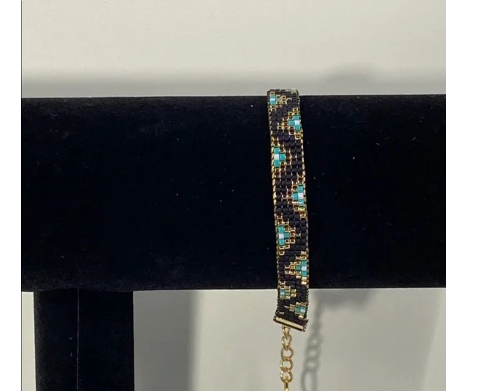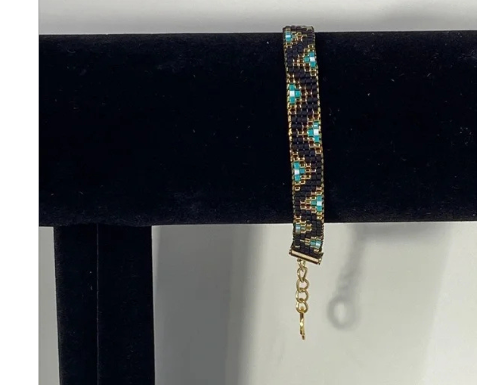 Perfect for adding a touch of sophistication to any outfit. Chic bracelet featuring intricate gold , Black and turquoise beadwork. Stylish and versatile accessory.