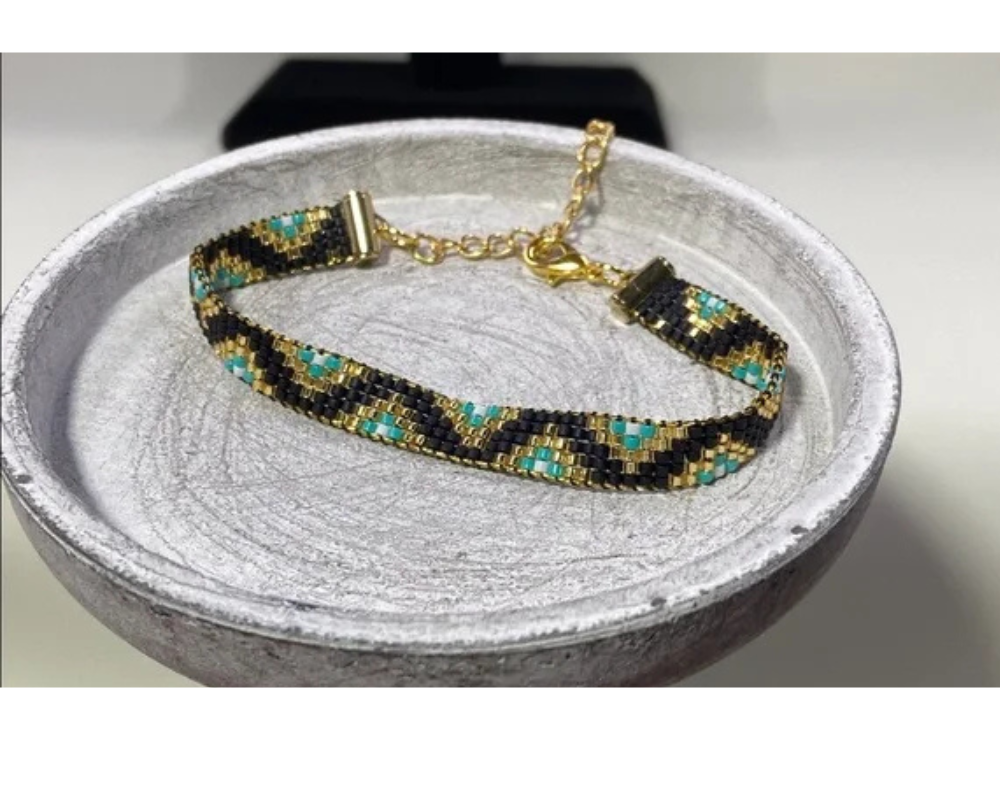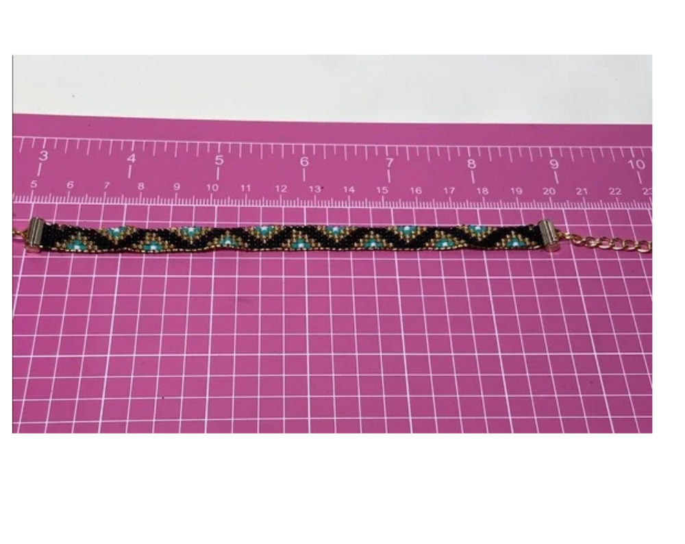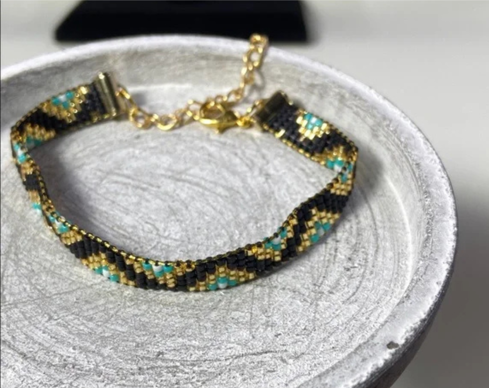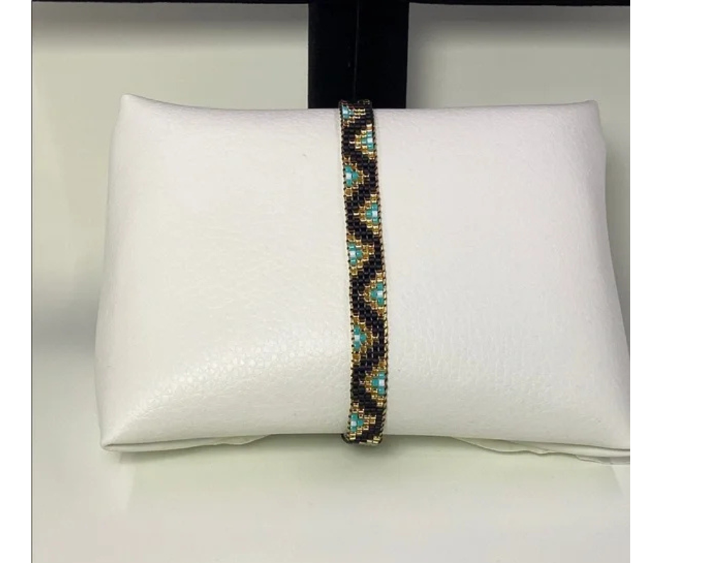 Perfect for adding a touch of sophistication to any outfit. Chic bracelet featuring intricate gold , Black and turquoise beadwork. Stylish and versatile accessory.
