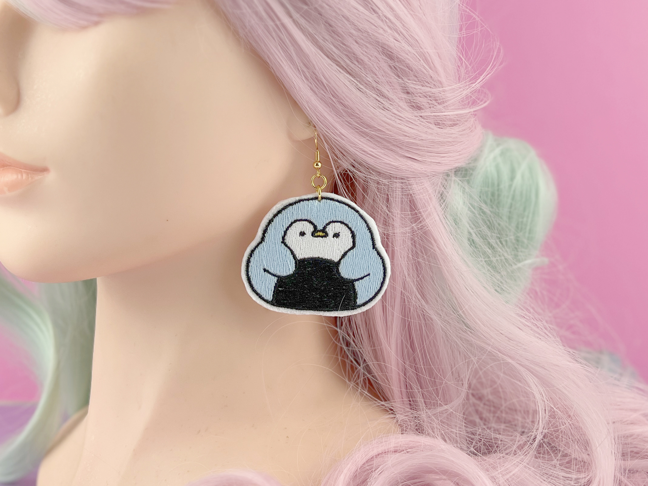 These cute kawaii penguin onigiri earrings are an adorable and unique addition to your jewelry collection. Each earring features a super cute light blue penguin designed to resemble a Japanese onigiri rice ball, bringing a playful and charming touch to any outfit. Made from high-quality fabrics and detailed machine embroidery, these earrings showcase exceptional craftsmanship and creativity.