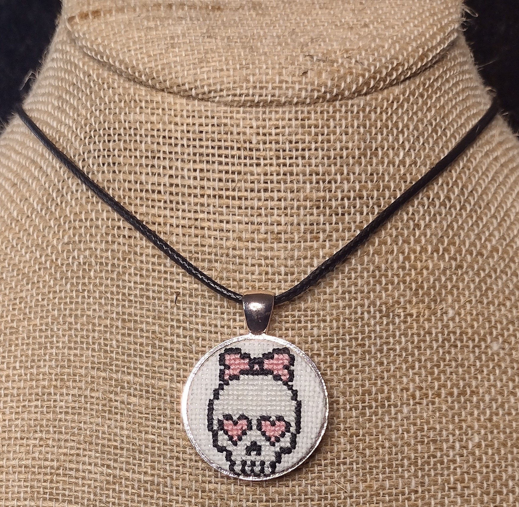 Who says love is dead? This is a stylized skull with a big pink ribbon on top of it's head and pink heart-eyes. It is hand-stitched on white canvas, set in a silver-colored pendant tray. It comes with a 20-inch black waxed-cord necklace.