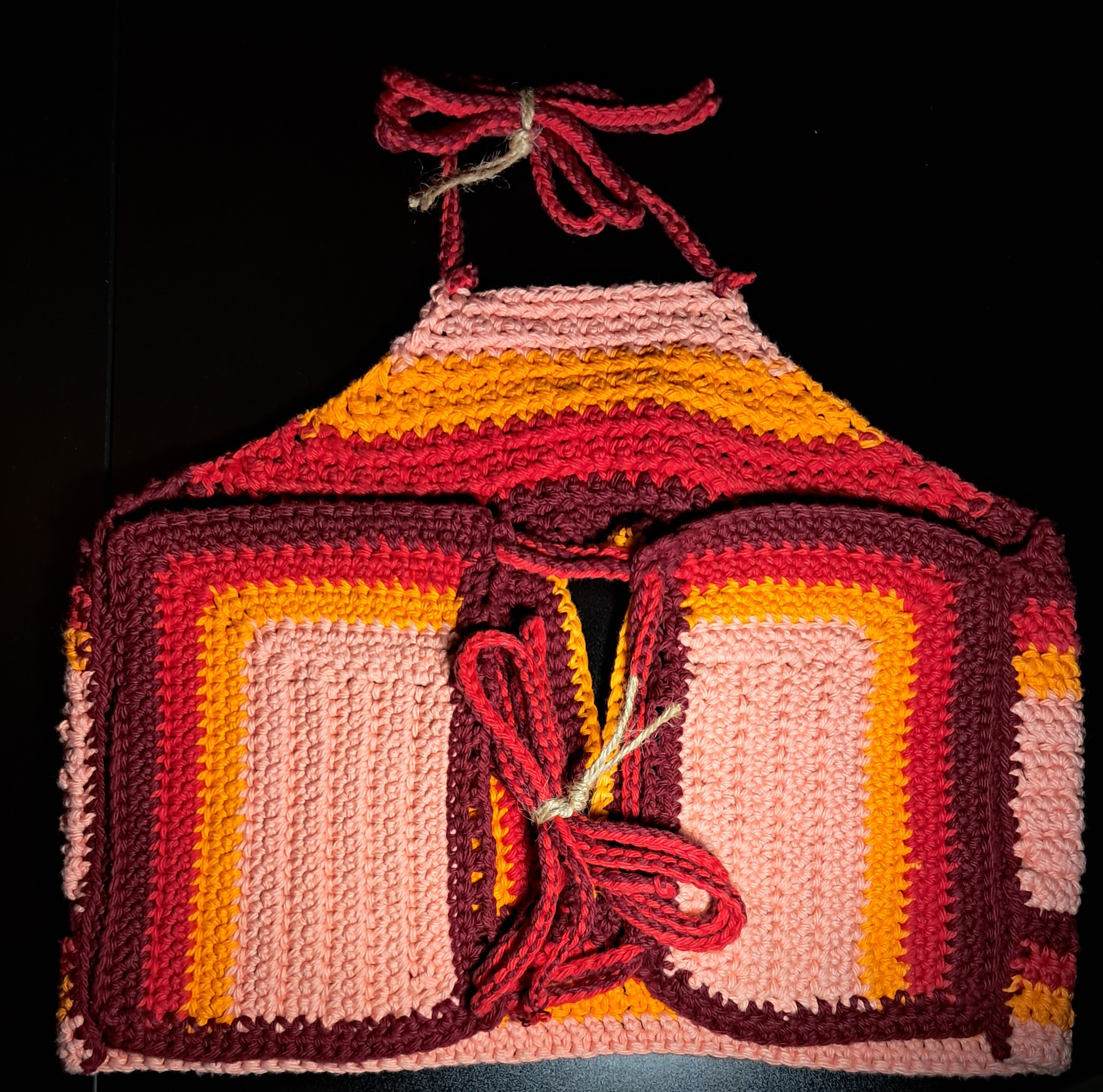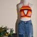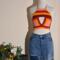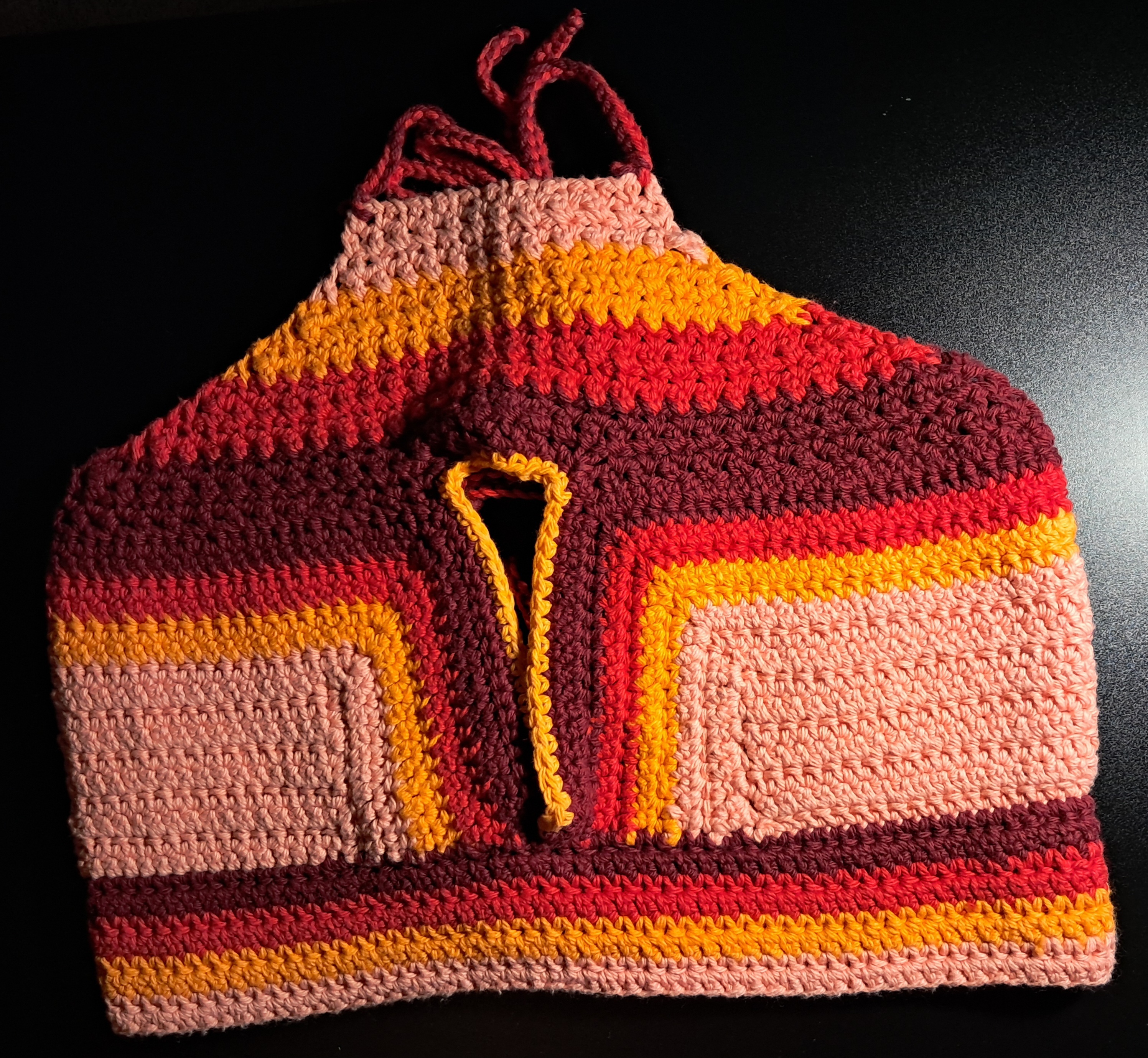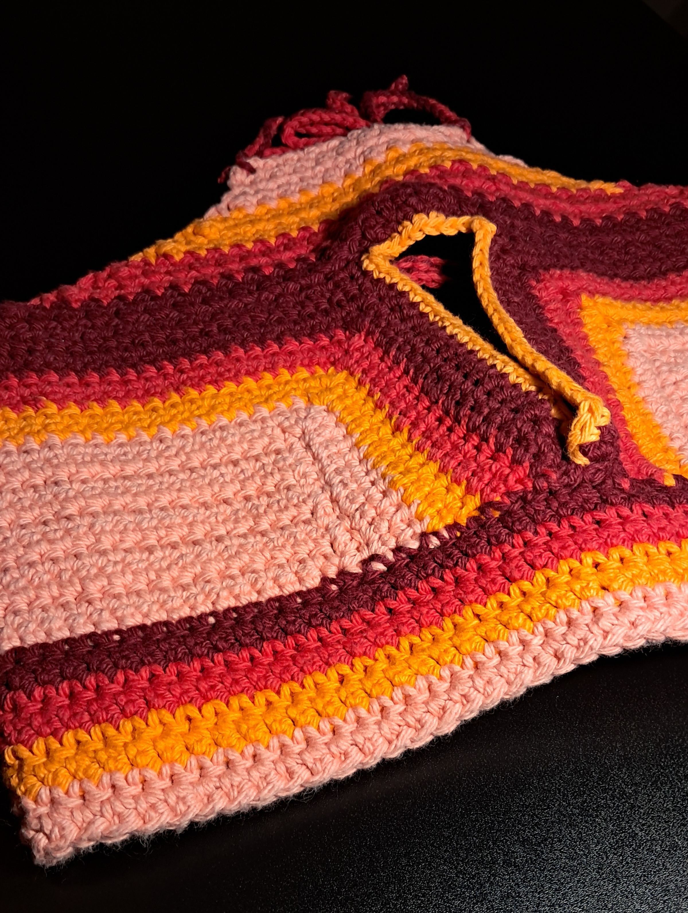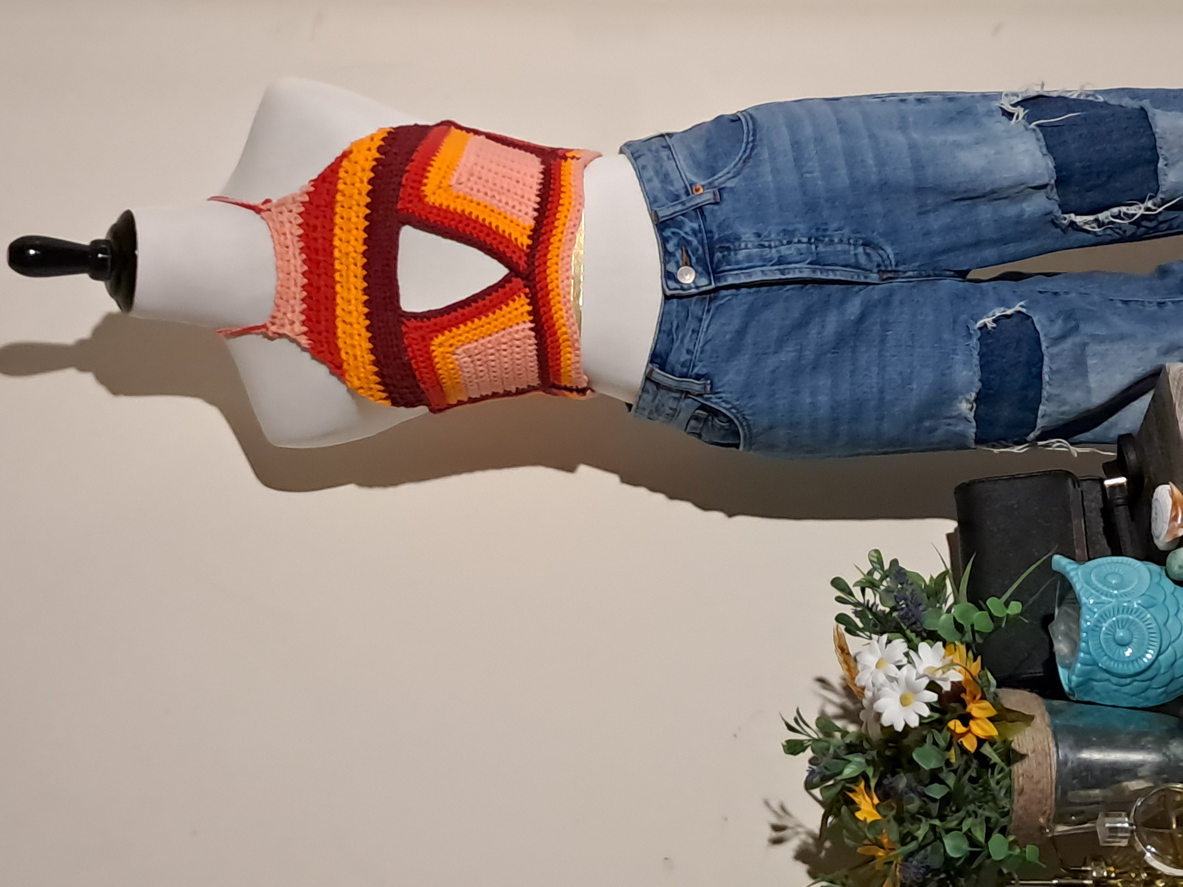This is a crochet knitwear halter, stitched by hand, using 100% cotton yarn in category sport weight. Has a color block pattern with a cutout featured on the bust. Will soften with frequent wash and wear. Please handwash/line dry or delicate machine cycle/low to moderate heat dry