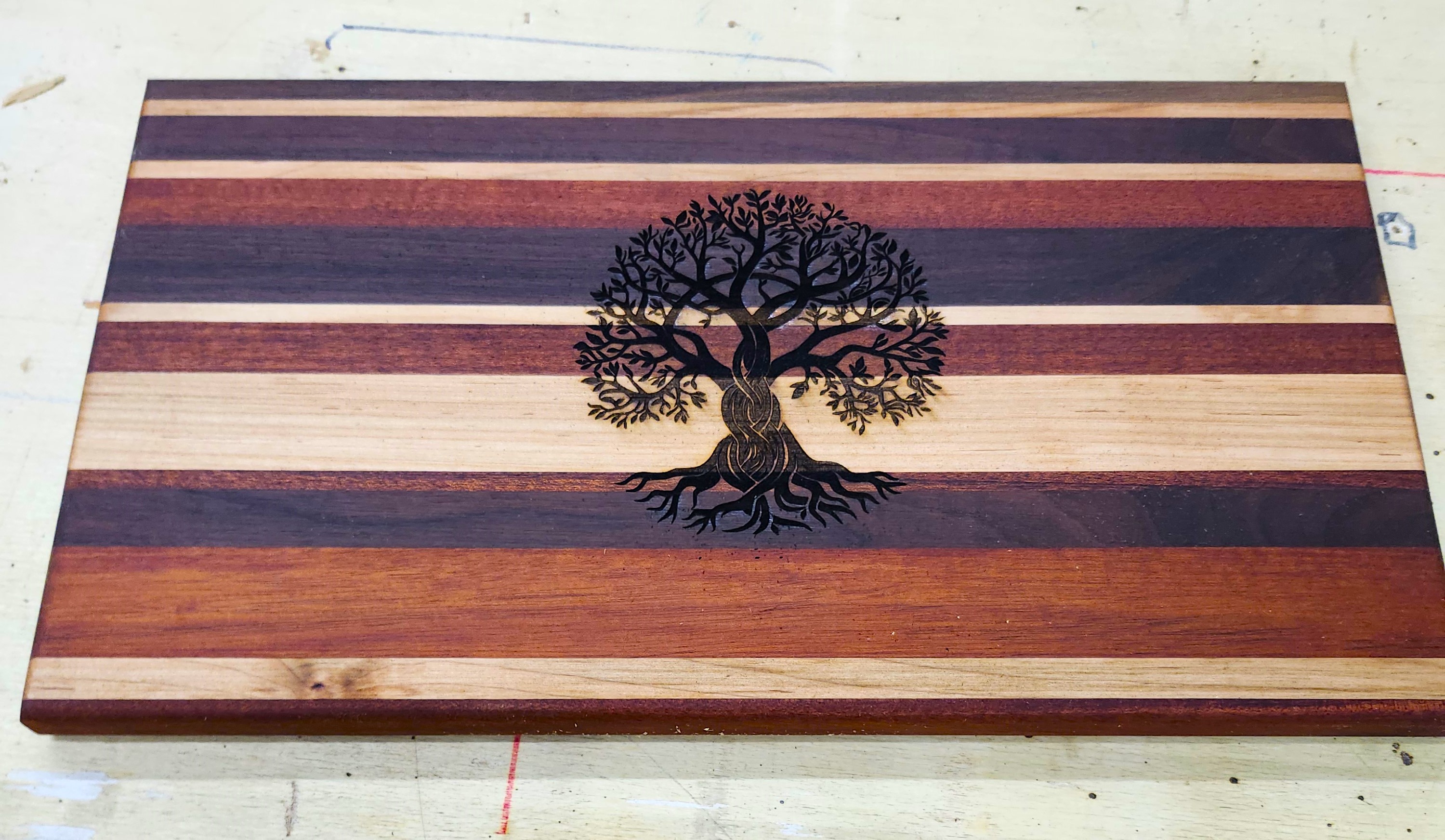 These are wooden cutting/charcuterie/bread boards, made from varying solid hardwood strips, with the "tree of life" laser engraved on the top.