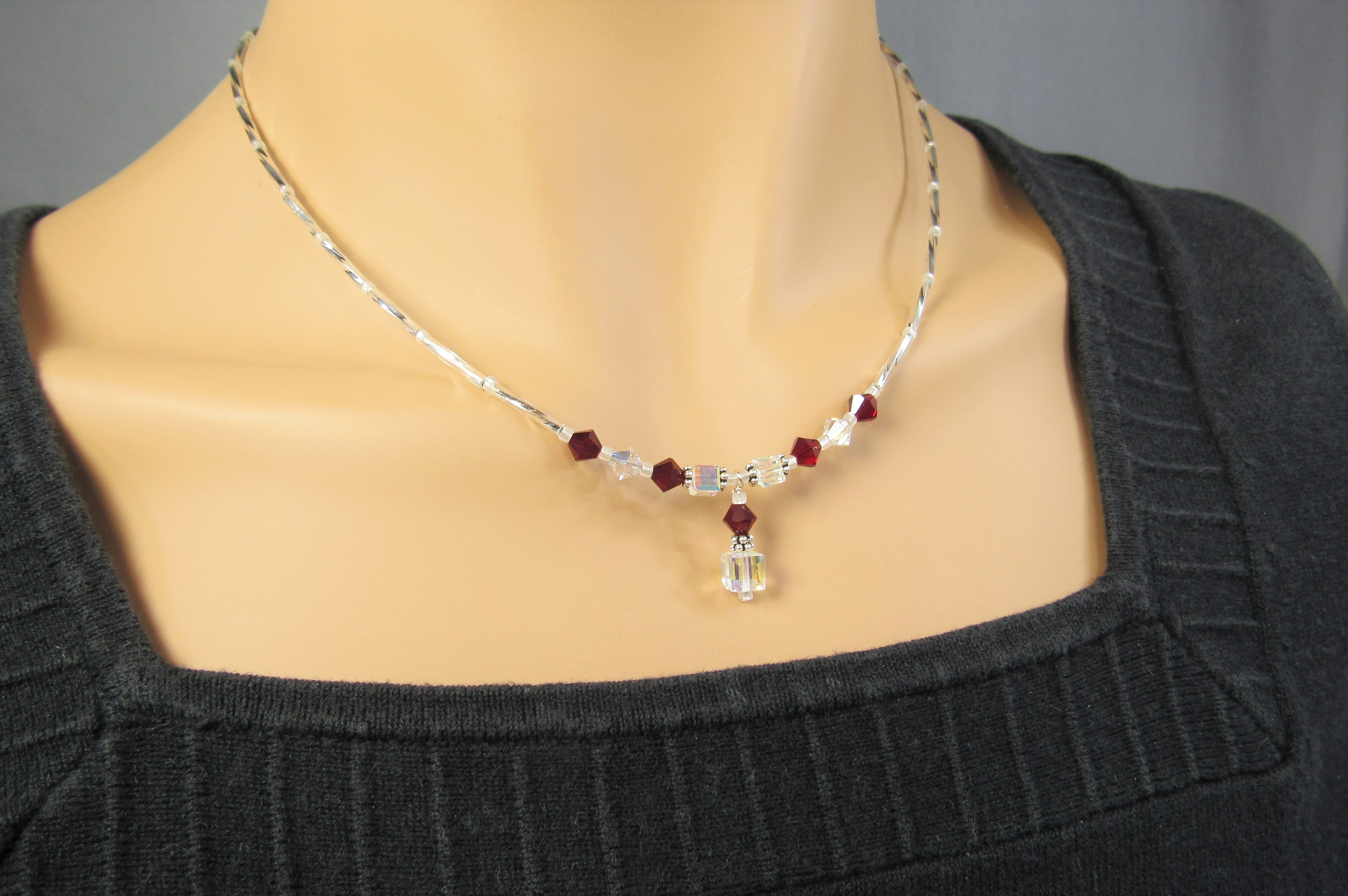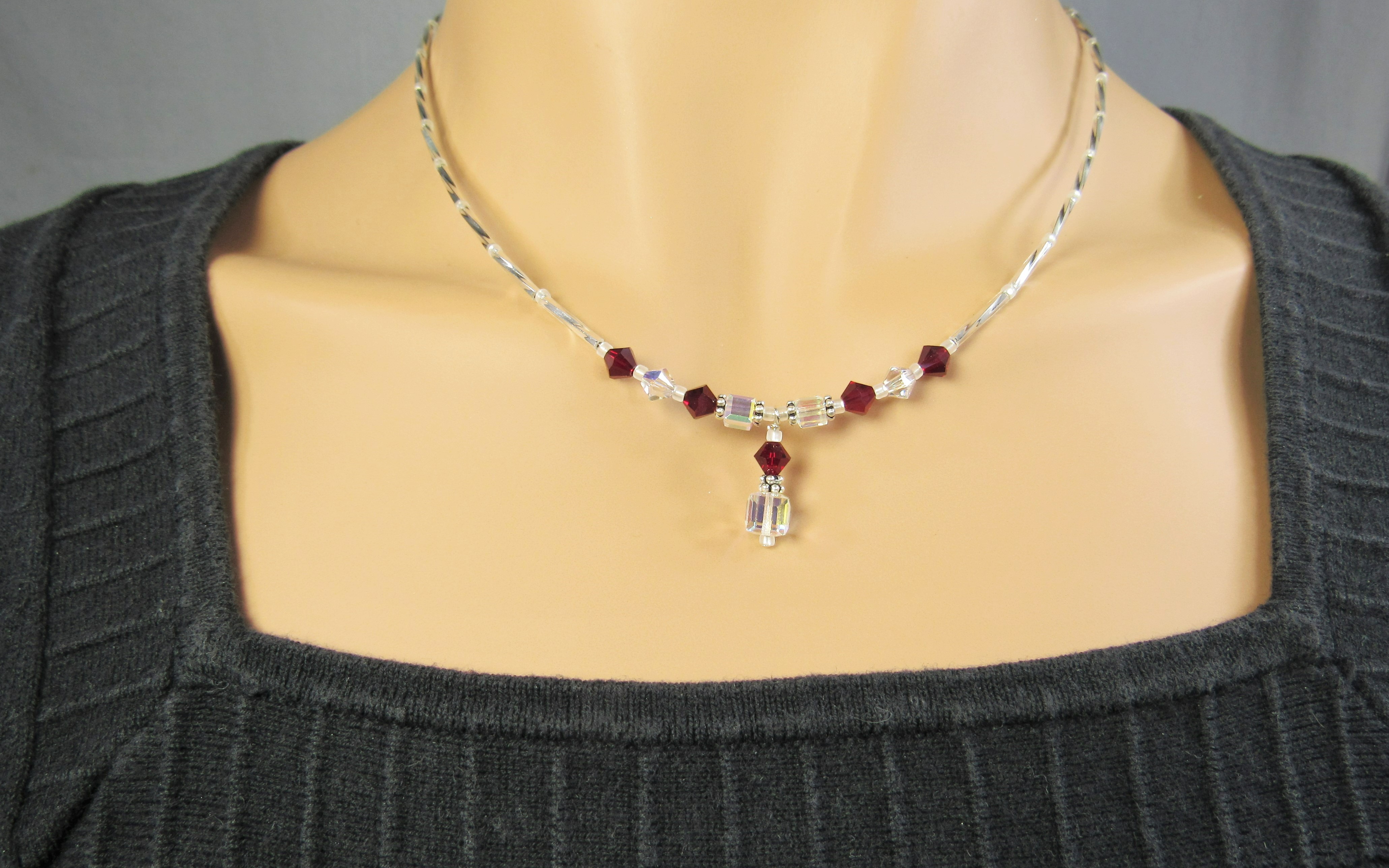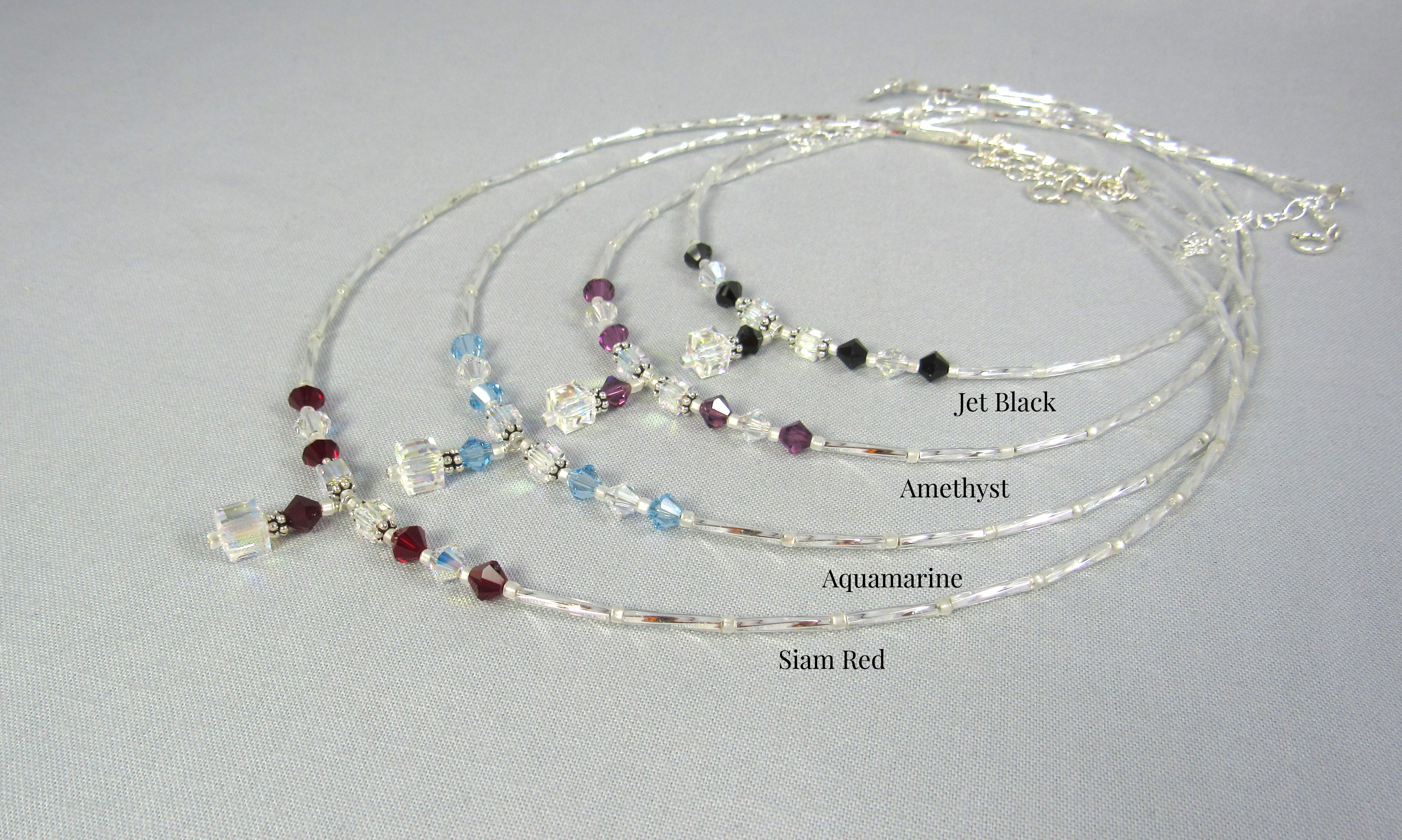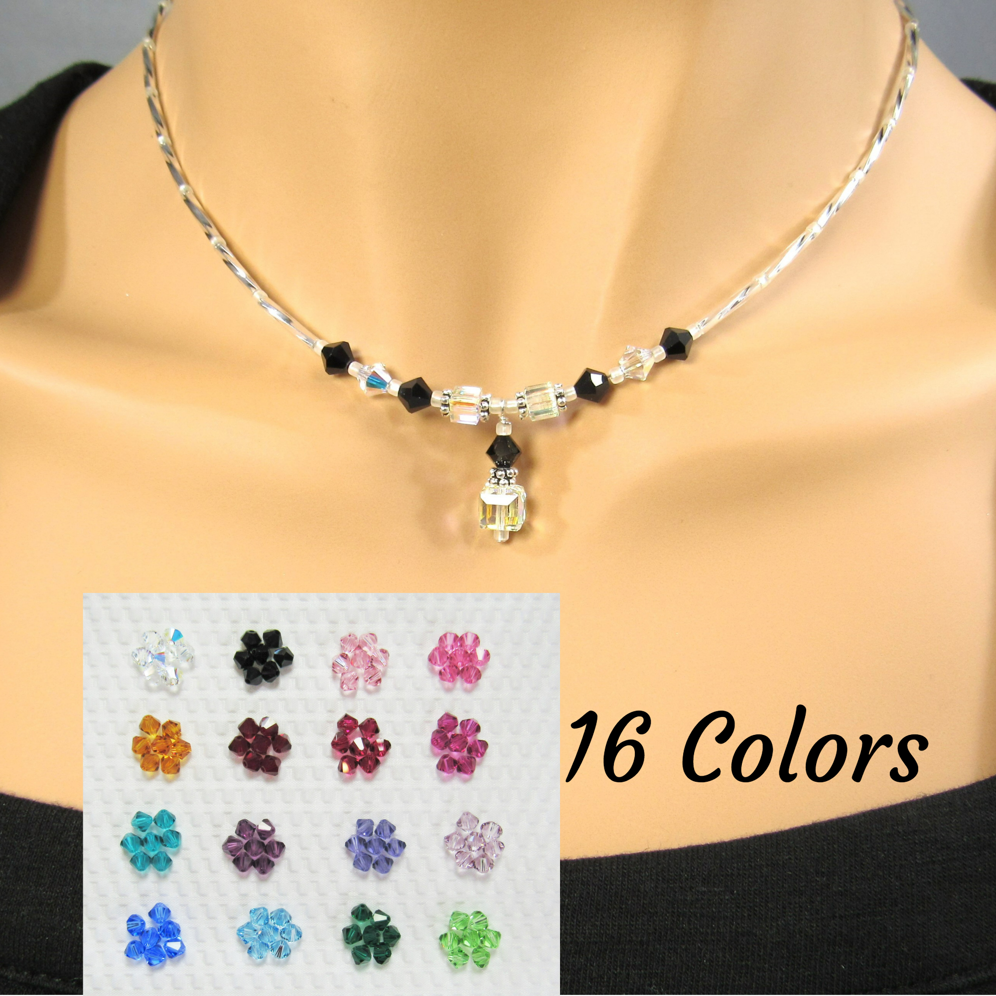 Simple yet elegant, this dainty Swarovski crystal pendant necklace makes a beautiful daily-wear piece! Petite Swarovski beads sparkle alongside the twist tube glass beads for a gorgeous choker to collar necklace -- perfect for any occasion! Personalize it with your choice of 16 colors. You can get all aurora borealis for an iridescent clear necklace or choose a different accent color to fit your style. Or pick a birthstone color for a lovely gift. The necklaces shown have jet black, siam red, and aquamarine accent colors.