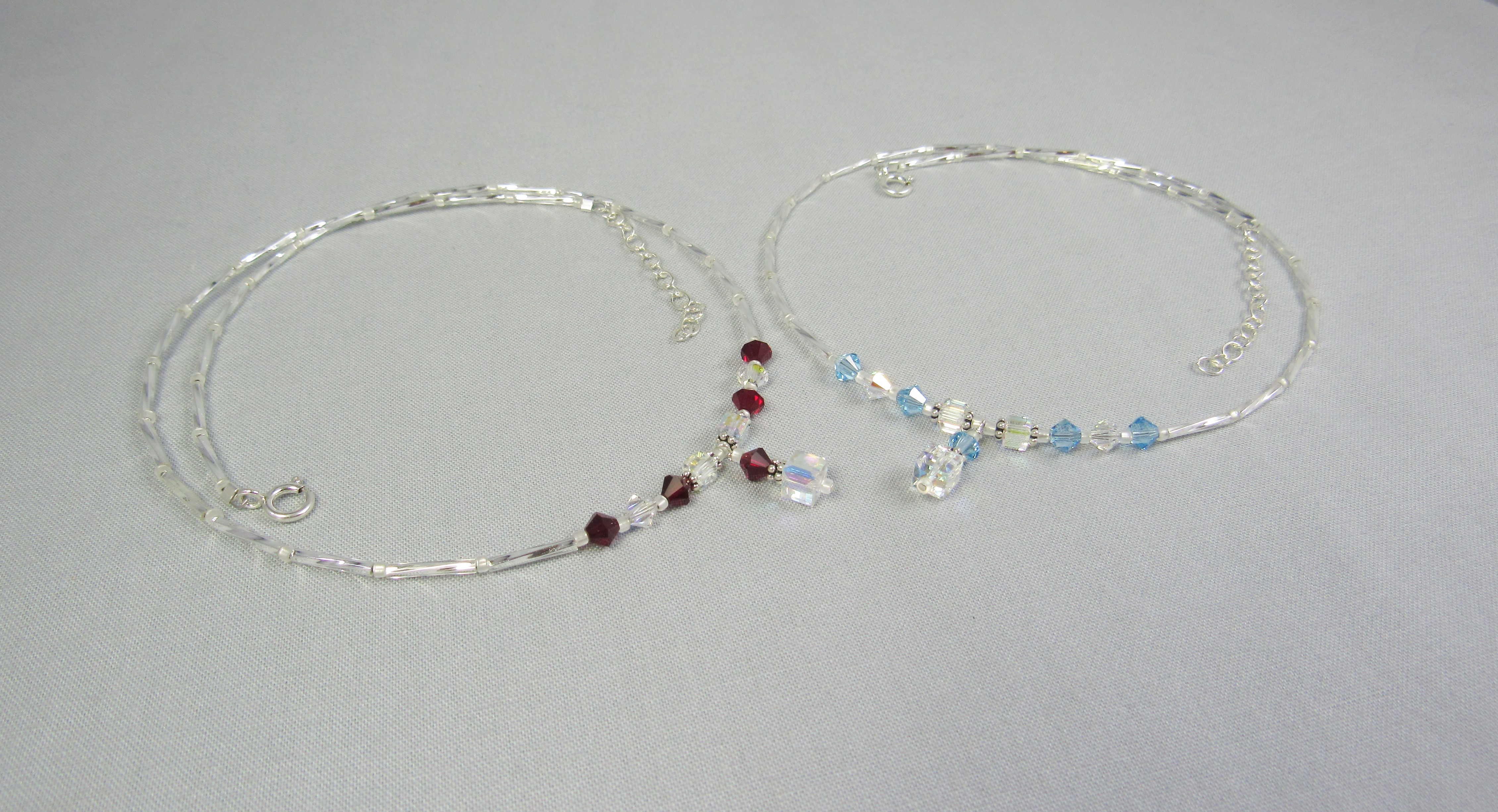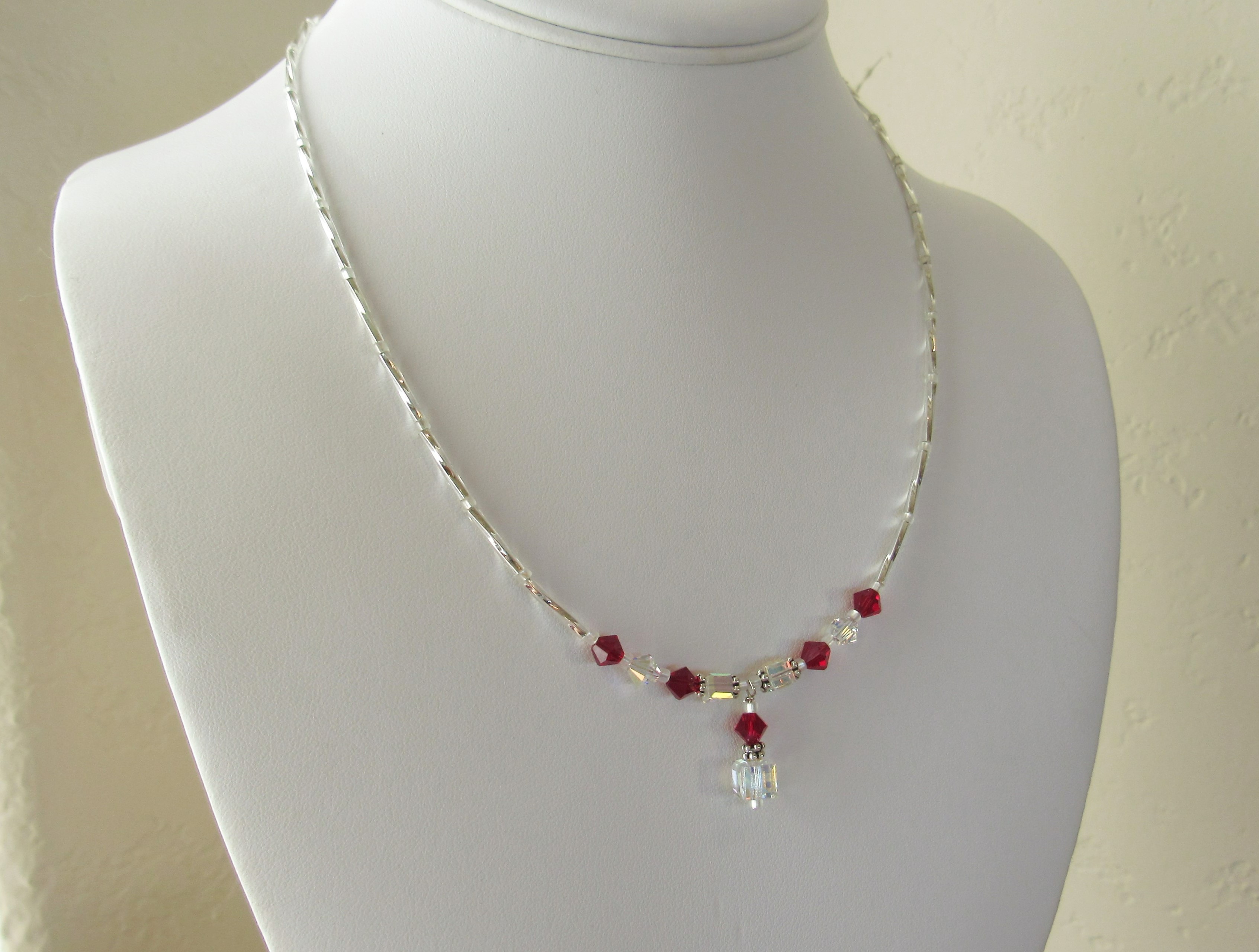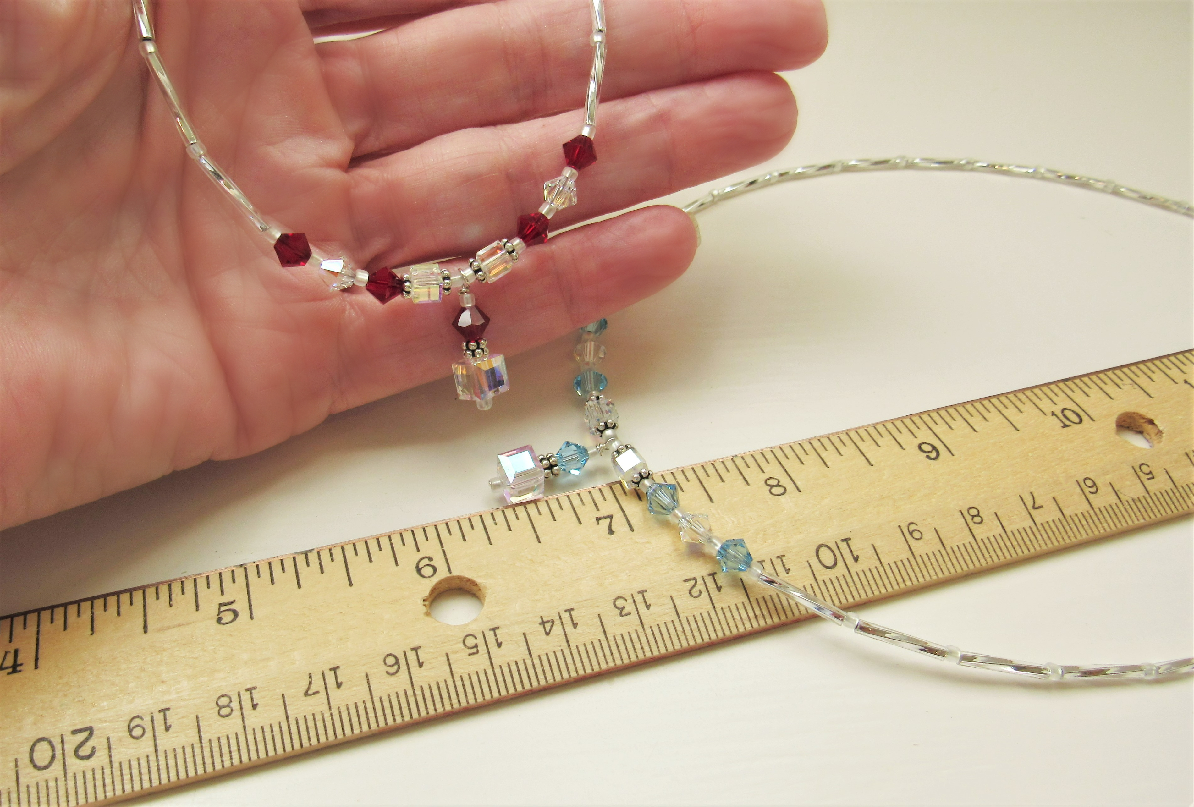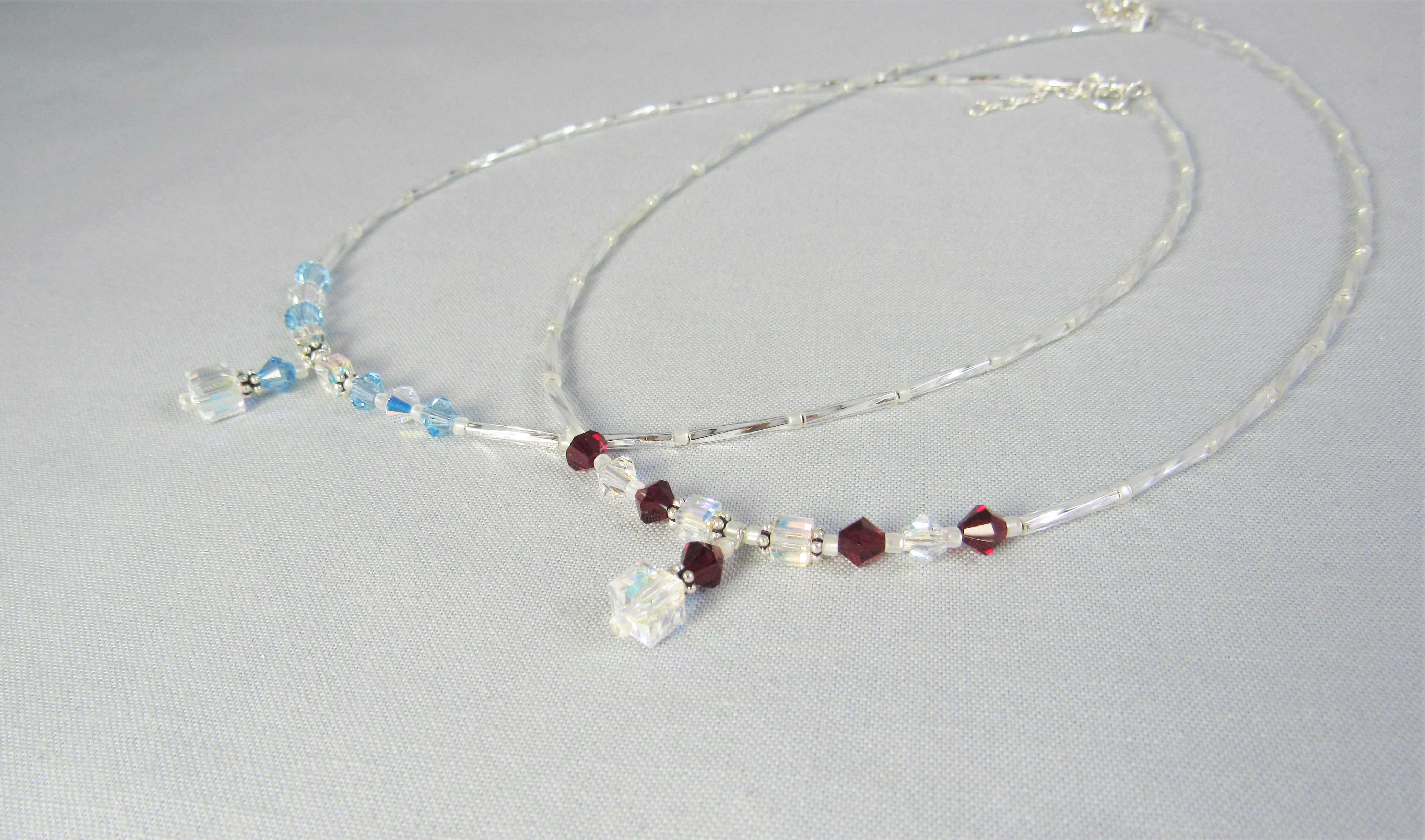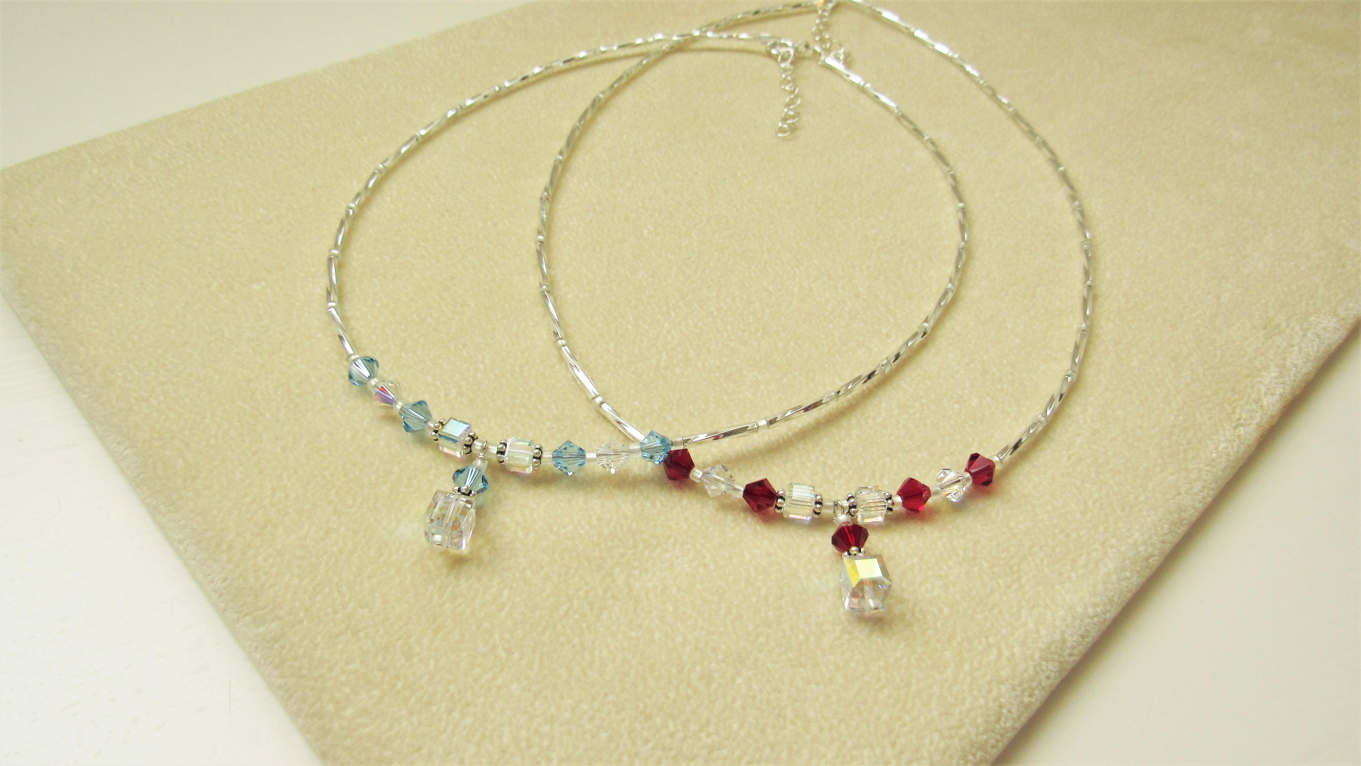 Simple yet elegant, this dainty Swarovski crystal pendant necklace makes a beautiful daily-wear piece! Petite Swarovski beads sparkle alongside the twist tube glass beads for a gorgeous choker to collar necklace -- perfect for any occasion! Personalize it with your choice of 16 colors. You can get all aurora borealis for an iridescent clear necklace or choose a different accent color to fit your style. Or pick a birthstone color for a lovely gift. The necklaces shown have jet black, siam red, and aquamarine accent colors.