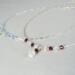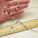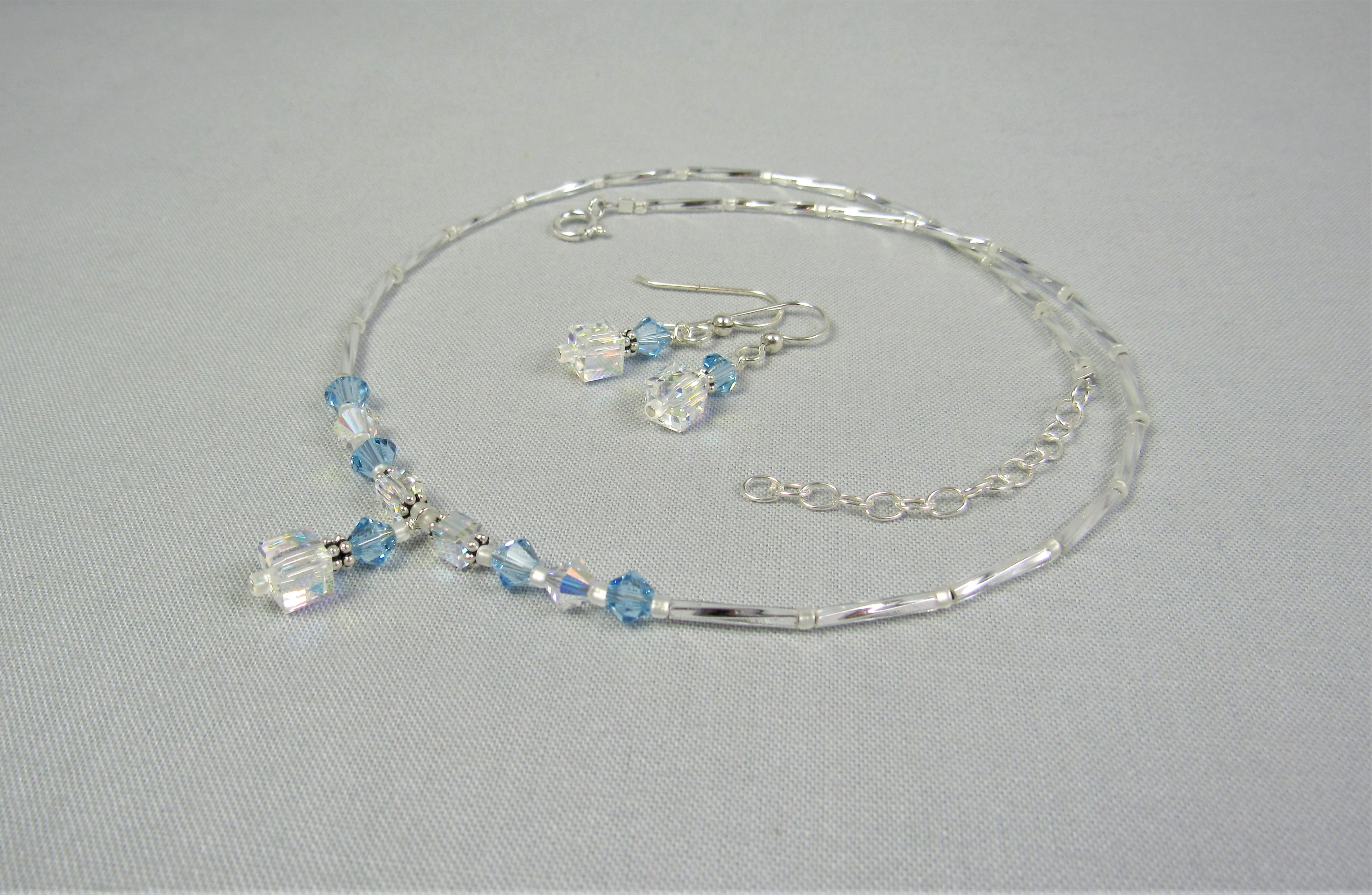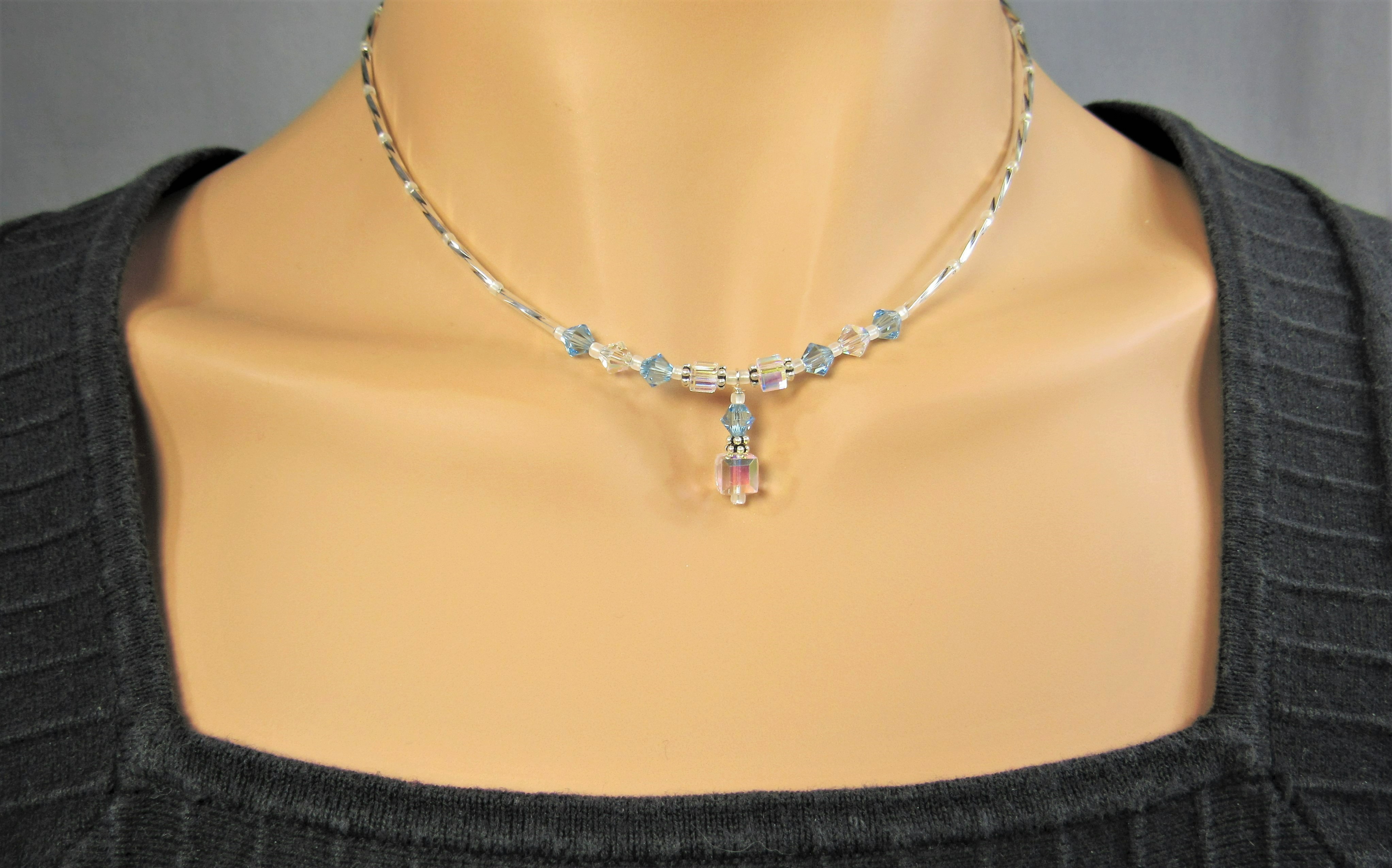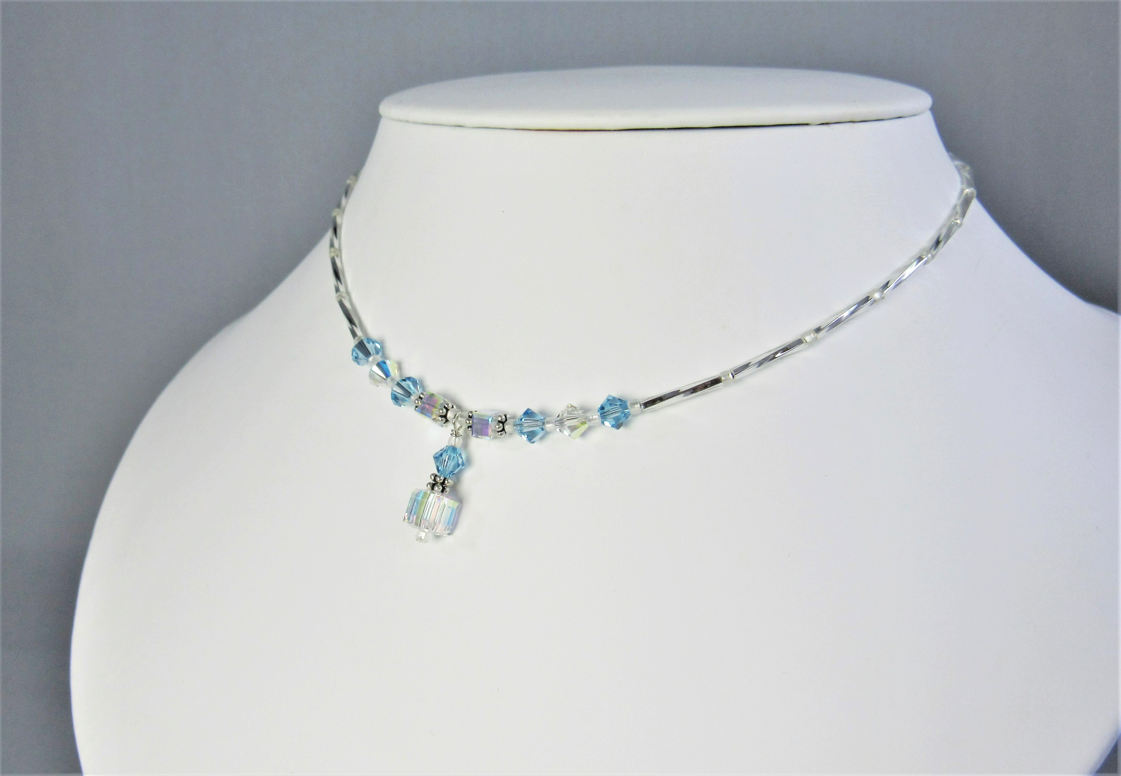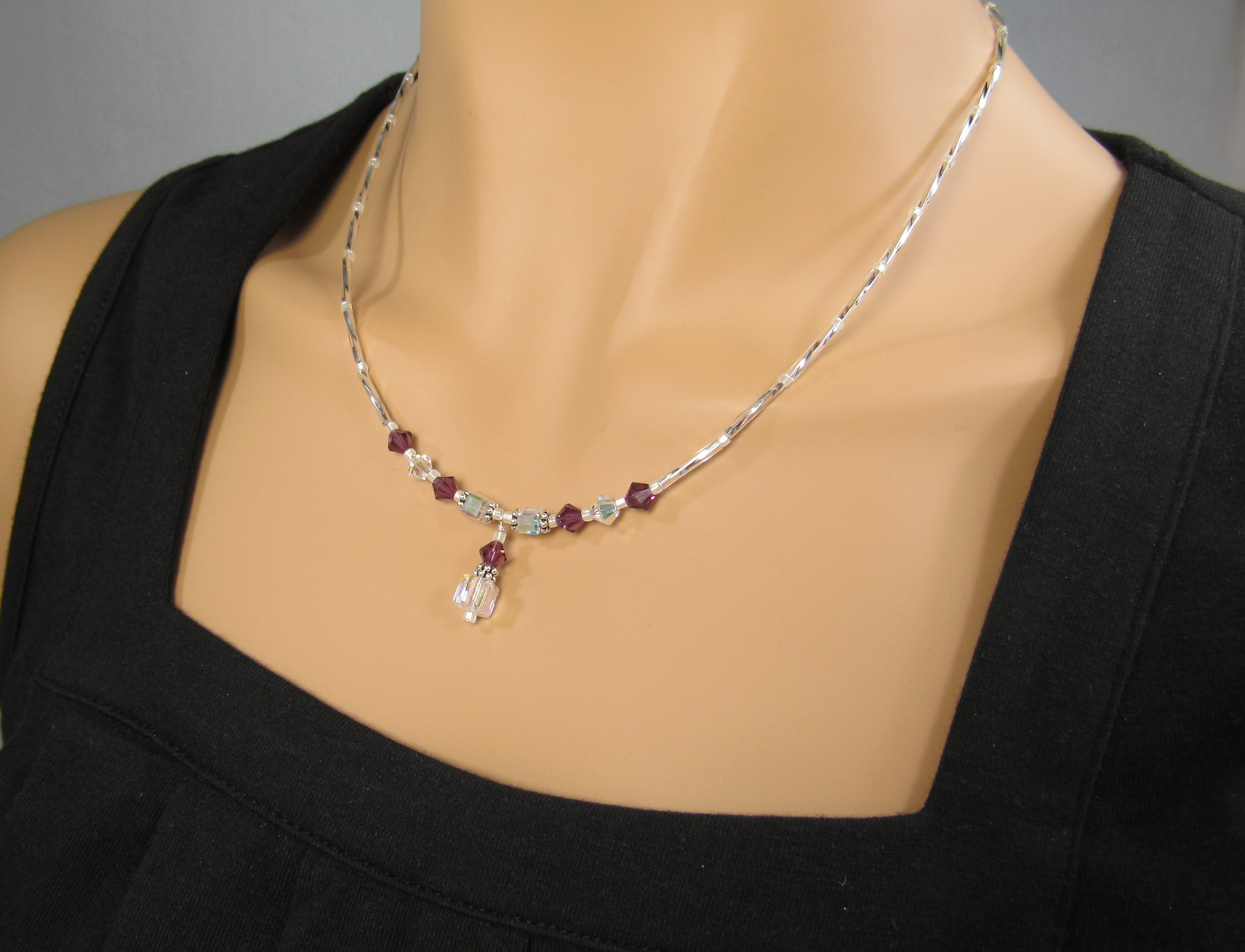 The drop is created with a small 6mm aurora borealis cube topped with a 5mm bicone and sterling silver spacer beads. The necklace also has Swarovski crystals for a focal point in the center and sparkling glass beads along the sides. It is finished with a sterling silver spring ring closure and attached 2" sterling adjustable chain.