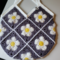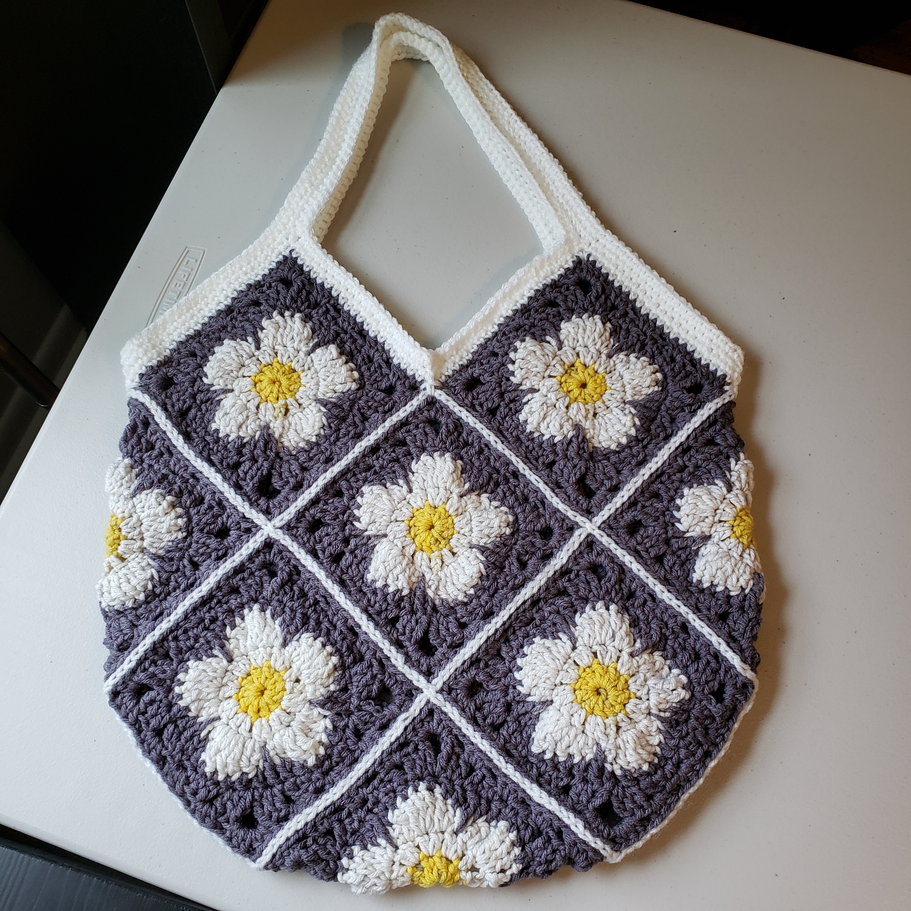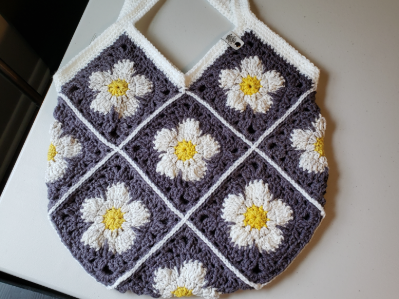 This is my handmade crochet tote bag. The bag is unlined and made with 100% acrylic yarn. The bag comes in many colorways, but this one is made with a yarn called All In One Flower Power in the colorway Daisy Do. Includes faux leather Hooked By Ronald tag.