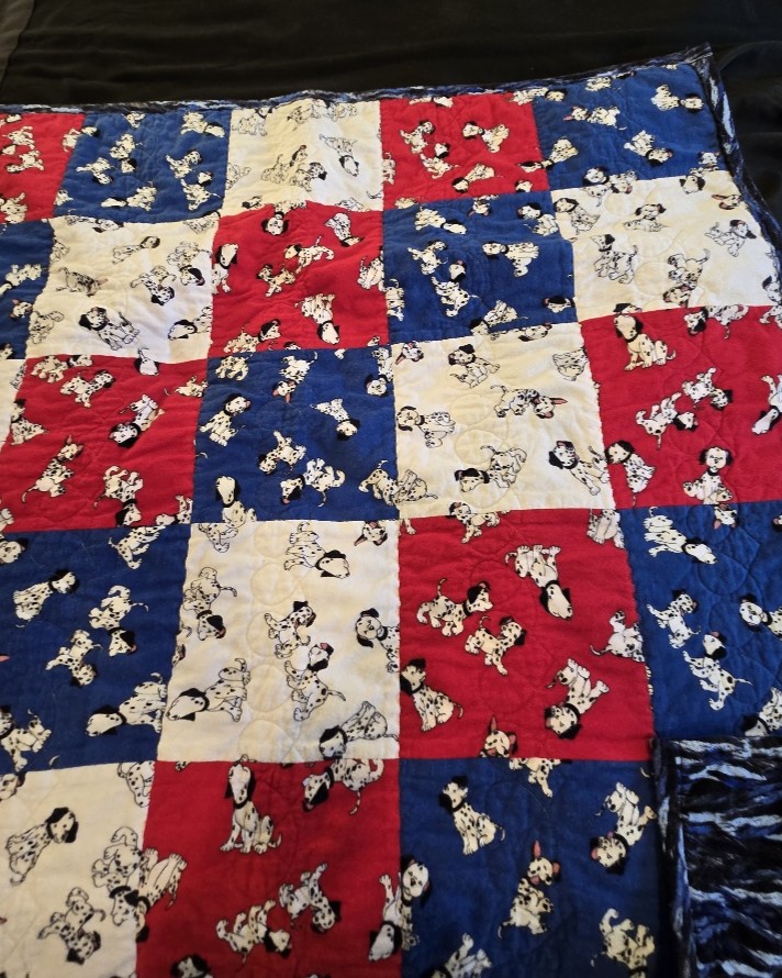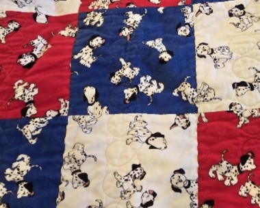 Baby quilt 36"X 36" featuring Dalmatian theme. The back has blue wavy background. The quilting is done in a heart design.