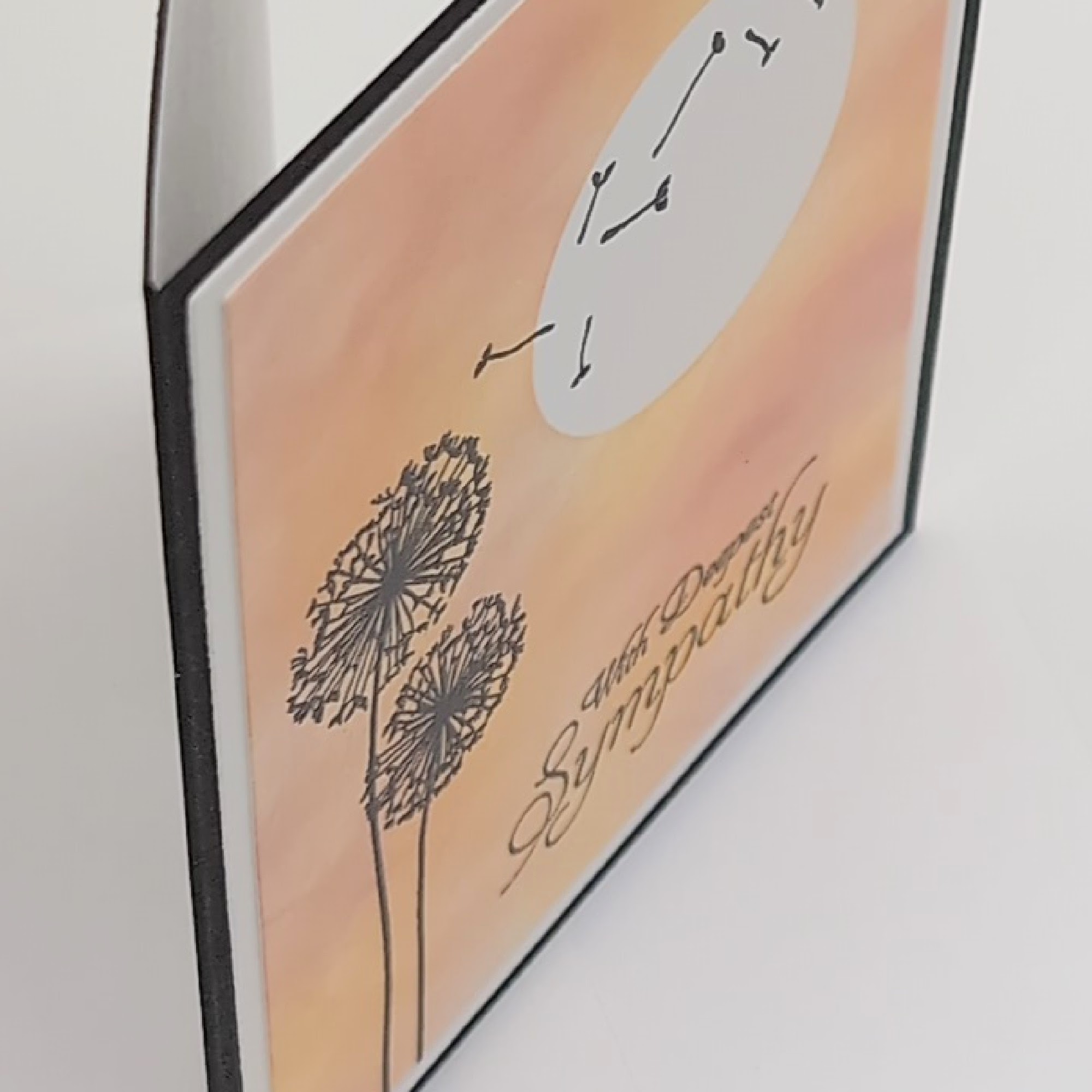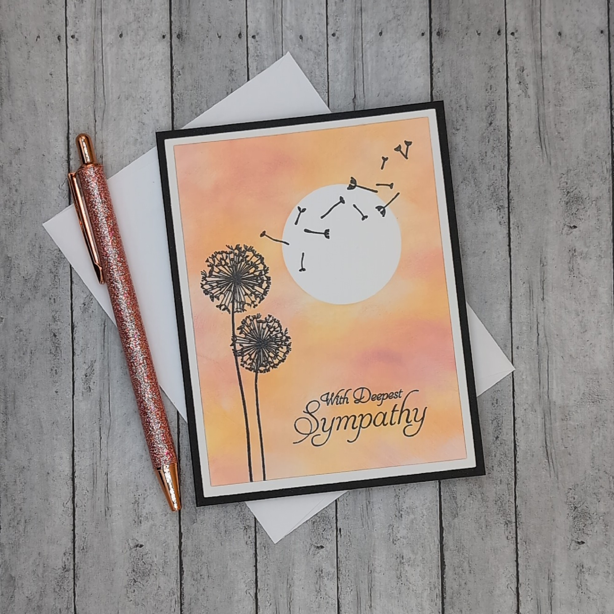 This handmade sympathy card blends soft painterly hues—sunset pinks, golden light, and gentle orange—with delicate dandelion seeds drifting into the breeze. Symbolizing release and remembrance, the design offers quiet comfort during times of loss. Blank inside for your personal message, it's a thoughtful way to express care and support. Ideal for bereavement, memorials, or simply letting someone know you're holding them in your heart.