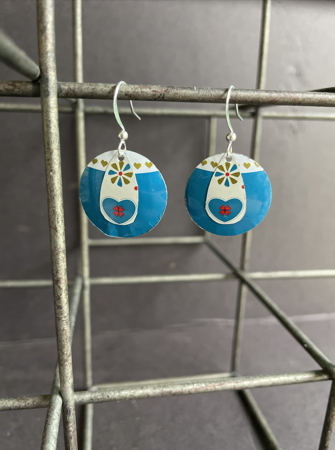 Tins are very light making them ideal for earrings as they don't weigh down your ears as the day goes on. Did you know the proper term for working with tin is "tinkering"? That made me really happy. I literally tinker in my art studio! I use old cookie tins, tea tins, and the like, break them down, and hand cut them into shapes and hand-hammer them into the 3-D shape I want them to be, finish and polish them, before putting them together like any other jewelry.