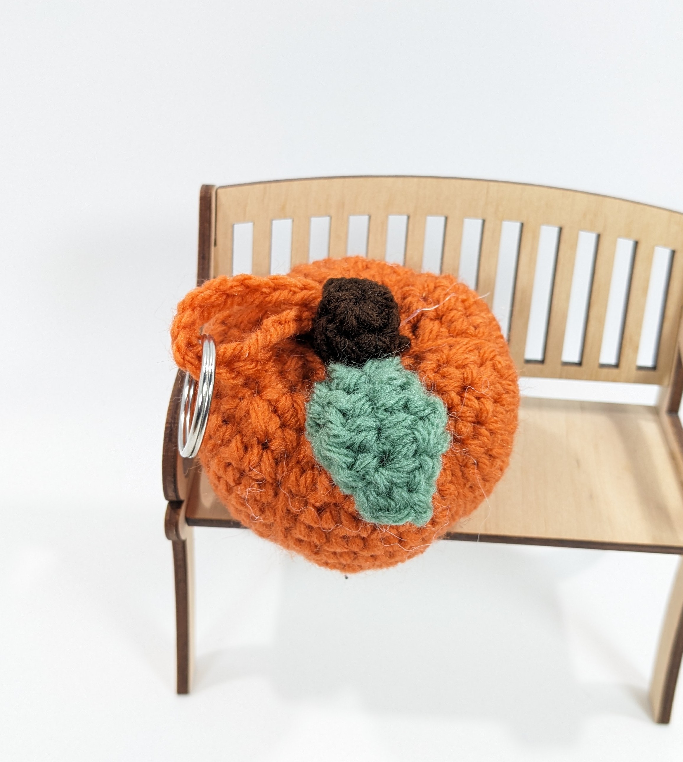 Also this cute Dark-Orange Pumpkin Plush Keyring is crochet with acrylic yarn and filled with a small amount of fiberfill. His mouth and eyes are made of felt and glued on.