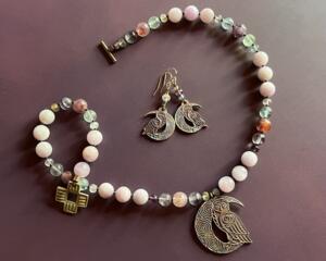 Necklace set | Artisan bronze owl pendants, kunzite rounds, f...