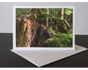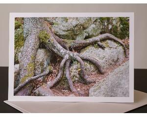 Greeting card of forest roots navigating boulders