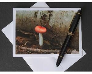 Greeting card of red mushroom and white birch tree