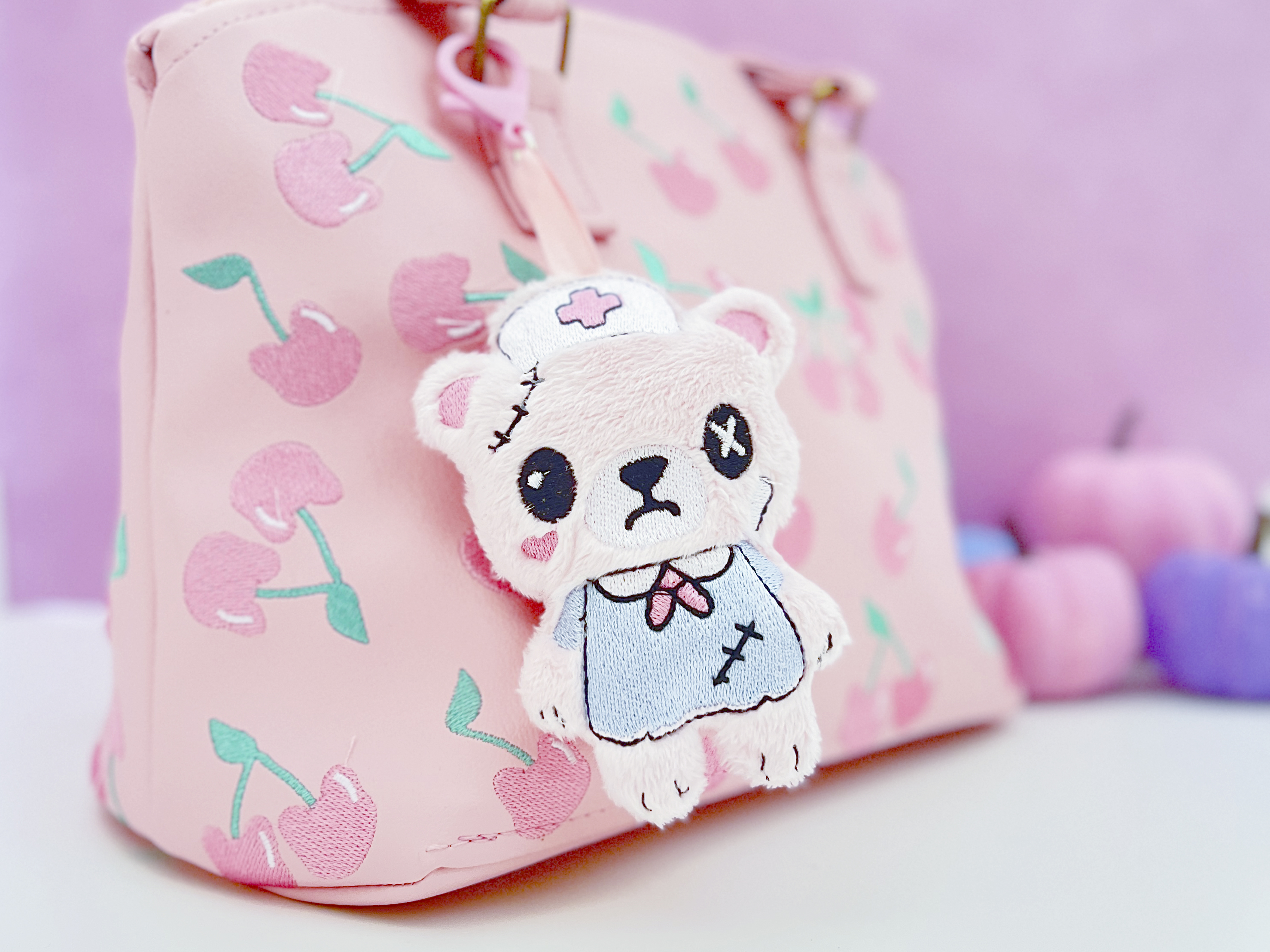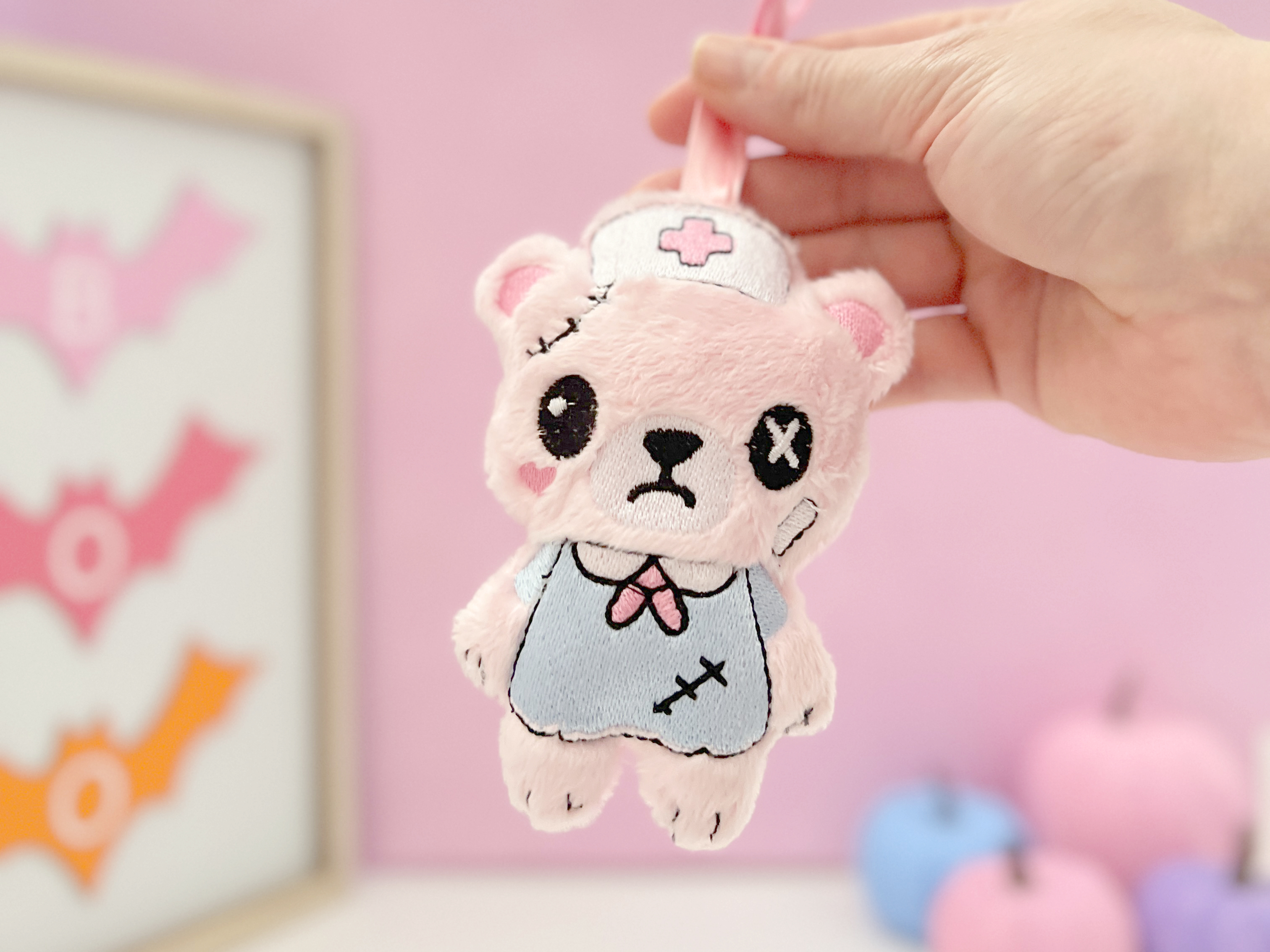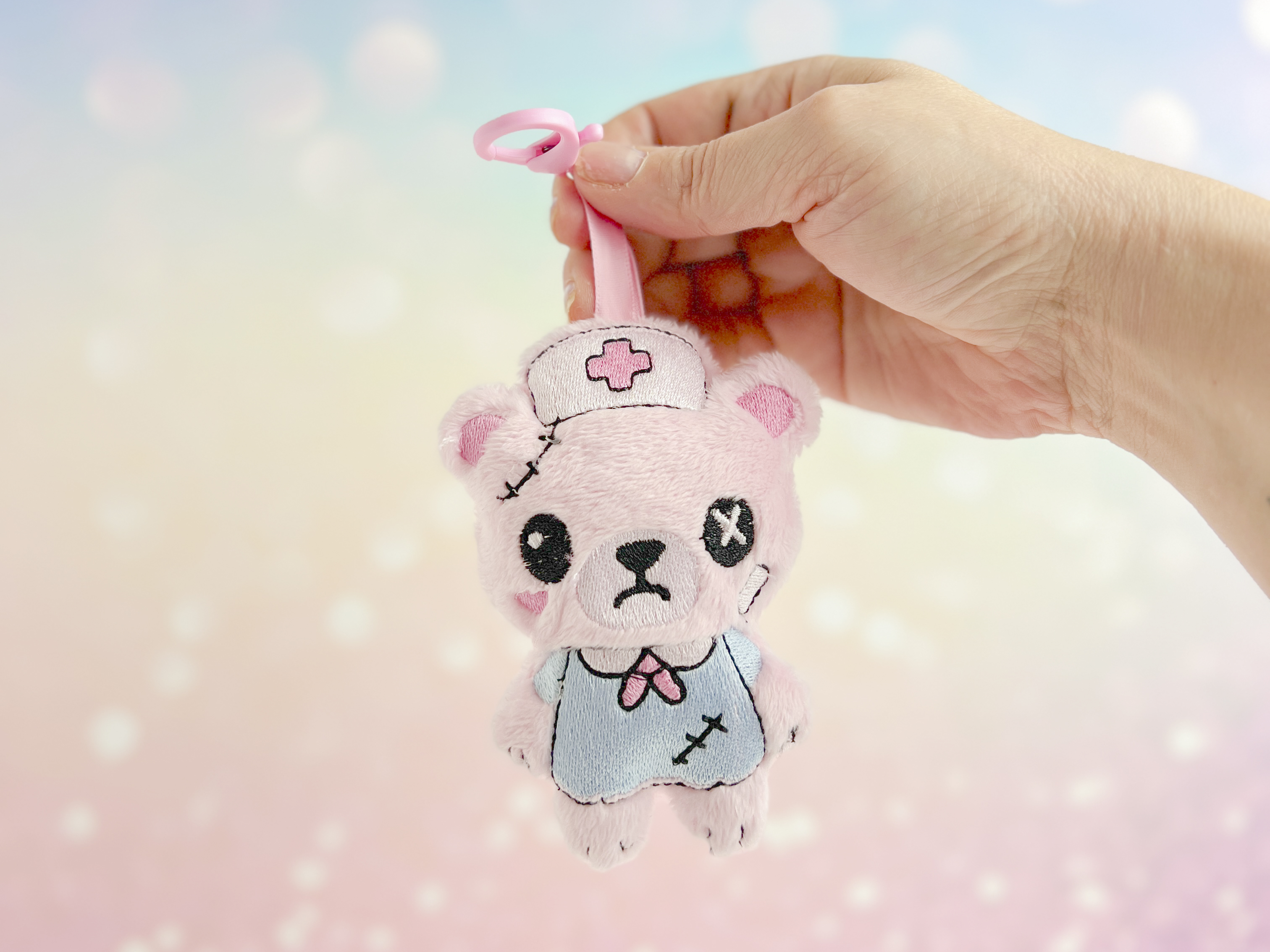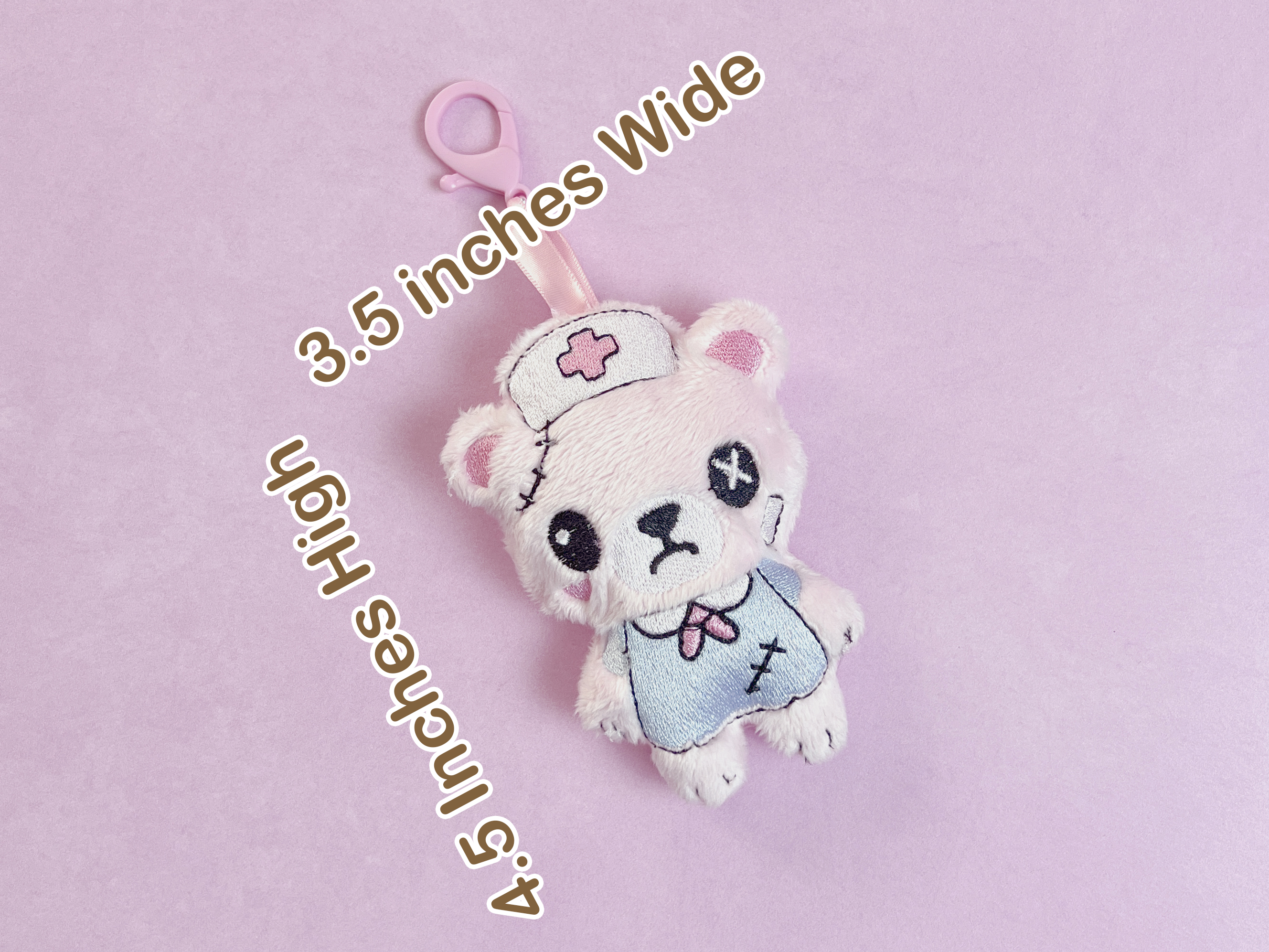 Add a dose of spooky sweetness to your bag or keys with this Dead Nurse Bear Plush Bag Charm! Handmade from soft pastel pink minky fabric, this creepy cute bear features intricate embroidered details, including a white nurse hat with a red cross, a baby blue nurse dress, and a sweet yet slightly eerie kawaii face. It’s the perfect mix of adorable and undead, bringing pastel goth and creepy cute vibes to any outfit or accessory.