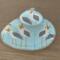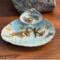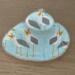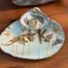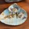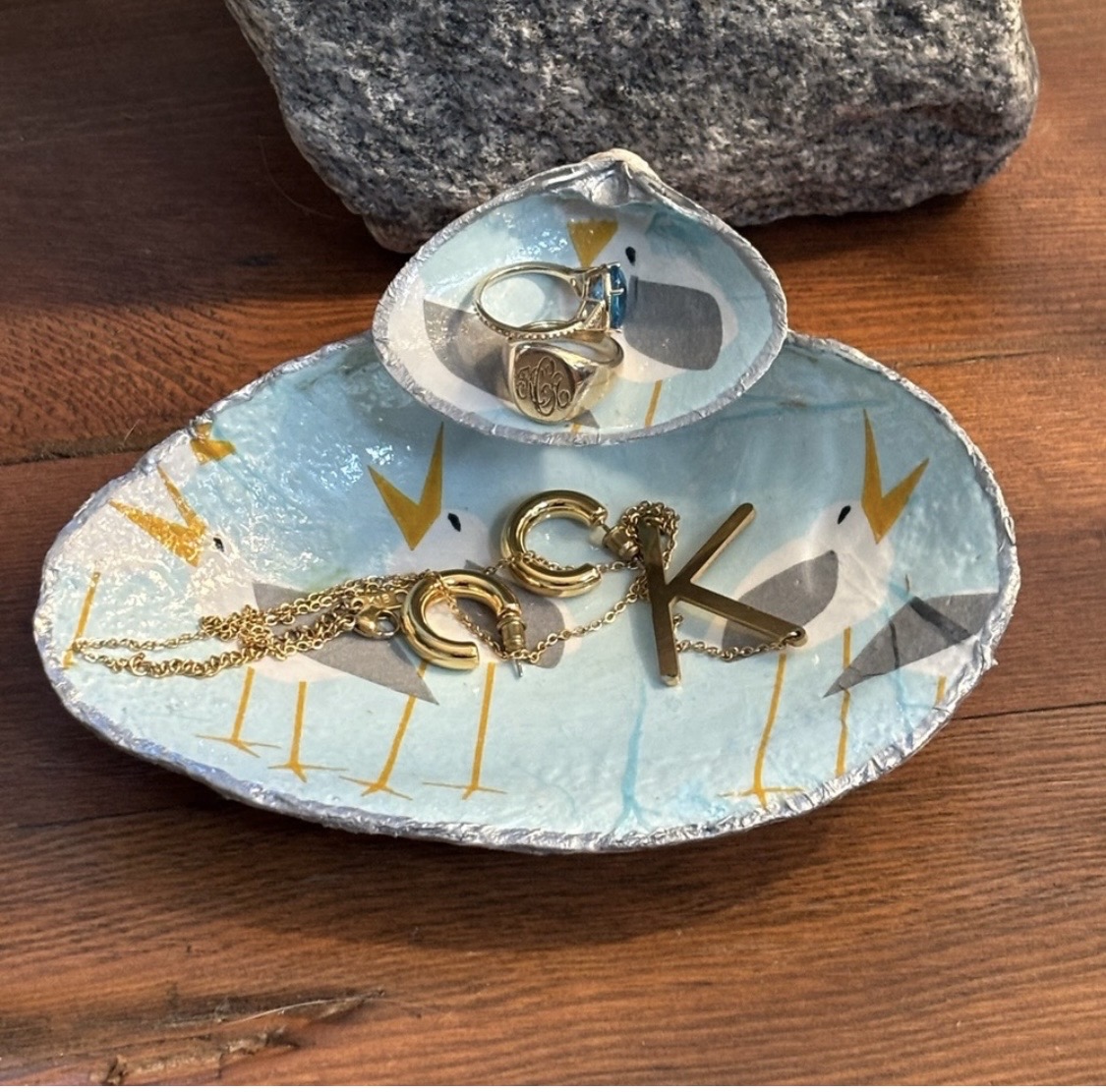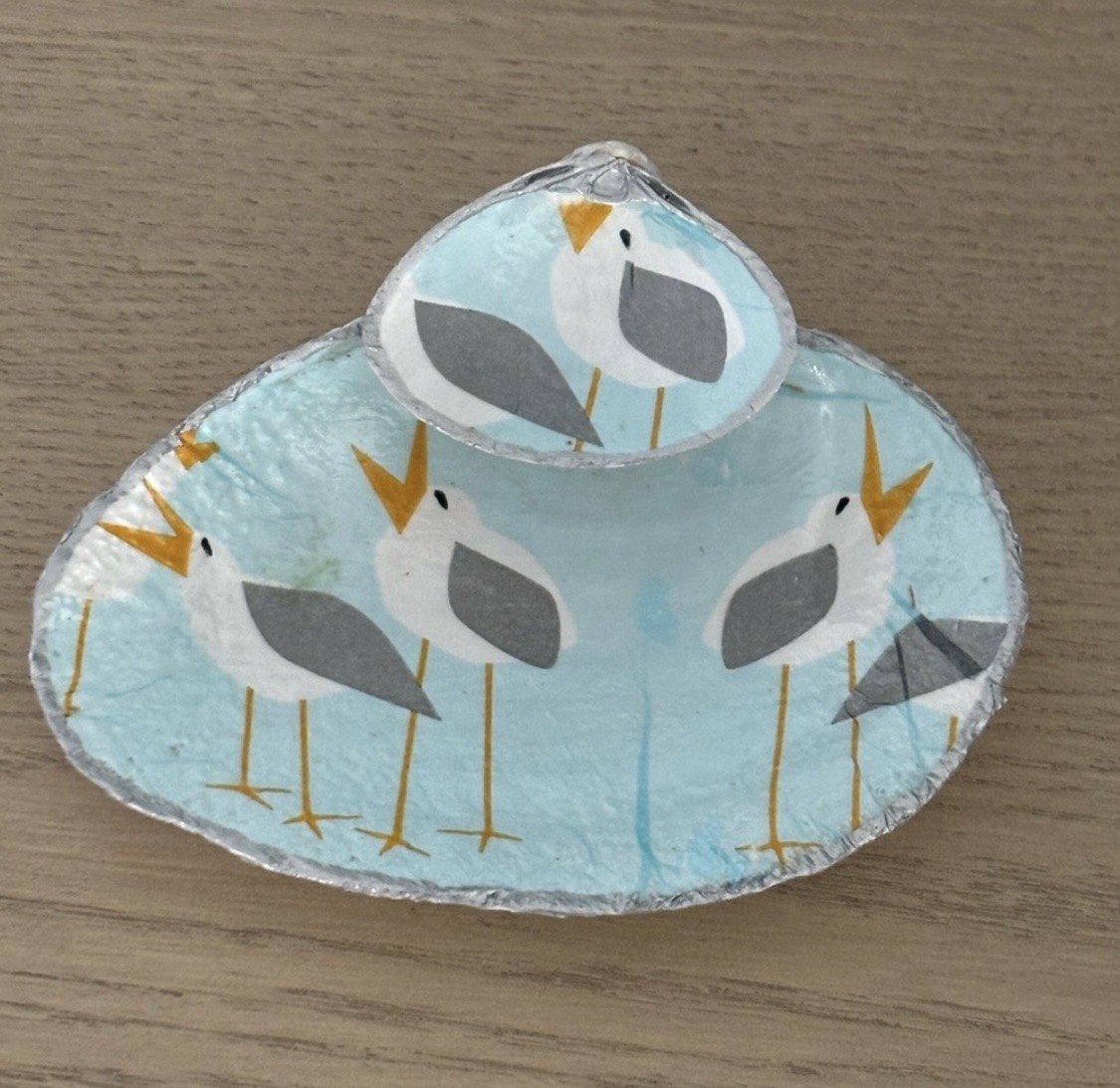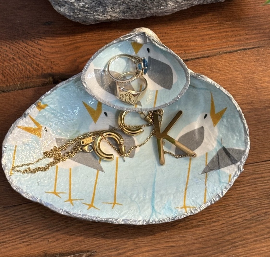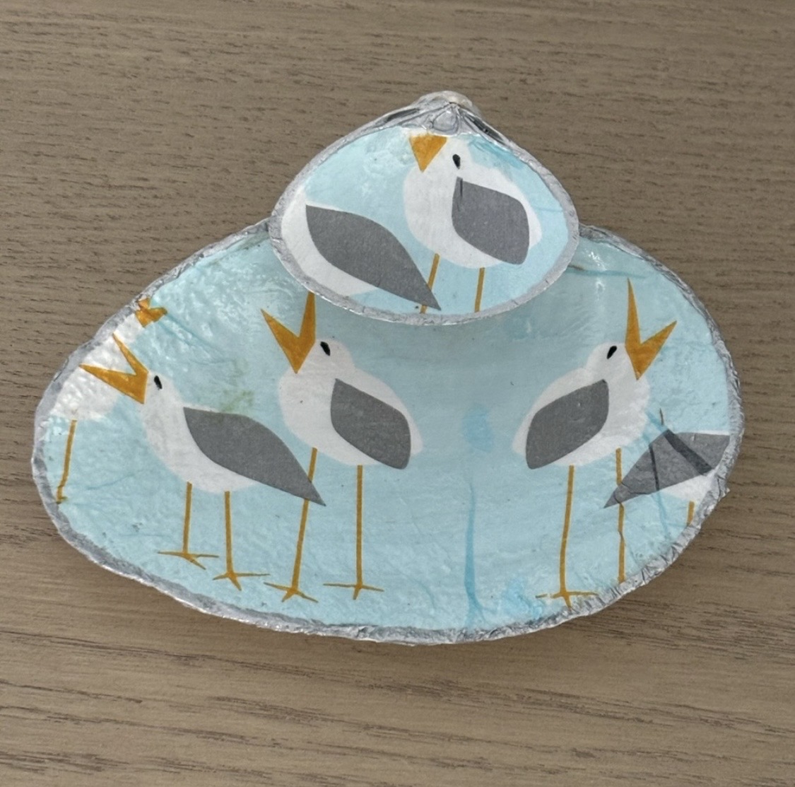This clamshell is estimated to be from a 10 year old clam, a very special shell with lots of natural texture. It is decorated with a whimsical Kate Nelligan seagull motif and is 2-tiered-great for holding jewelry . Measuring approximately 4”x7”x3”