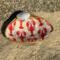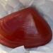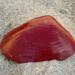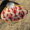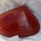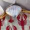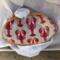 This clamshell is decorated with a lobster motif and a bold deep red background. Measuring approximately 4”x6”