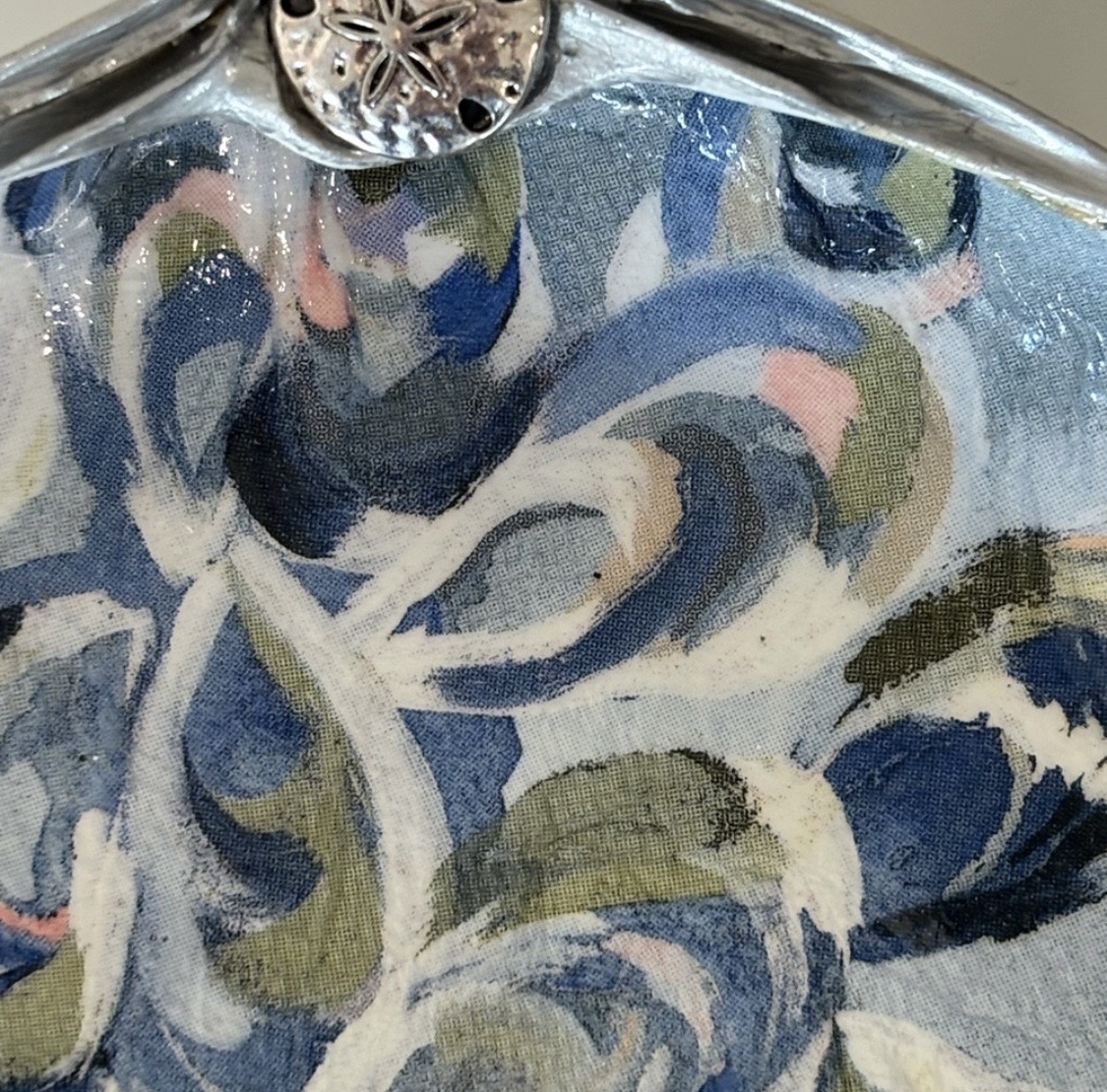 This clamshell is decorated with an abstract oyster motif and a pearlescent background. Measuring approximately 4”x6”