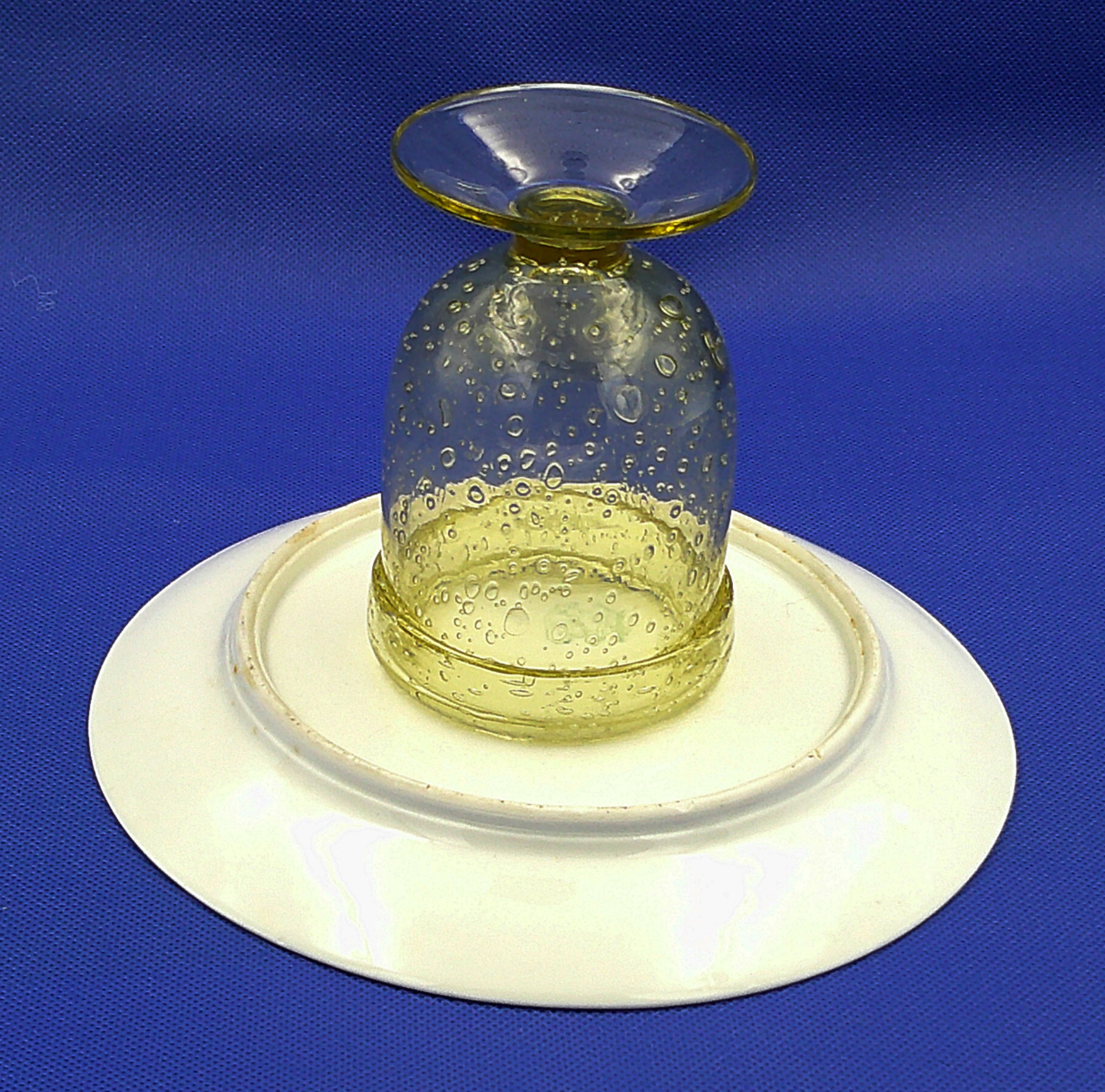 This is one of the simple designs I have. The plate and the glass are both unique. By pairing them together, they become a unique piece. The glass has the bubbles as part of its look, which really sets off the plate. They can be purchased separately, or you can buy 2 or 3 to have for serving at a tea party or luncheon.