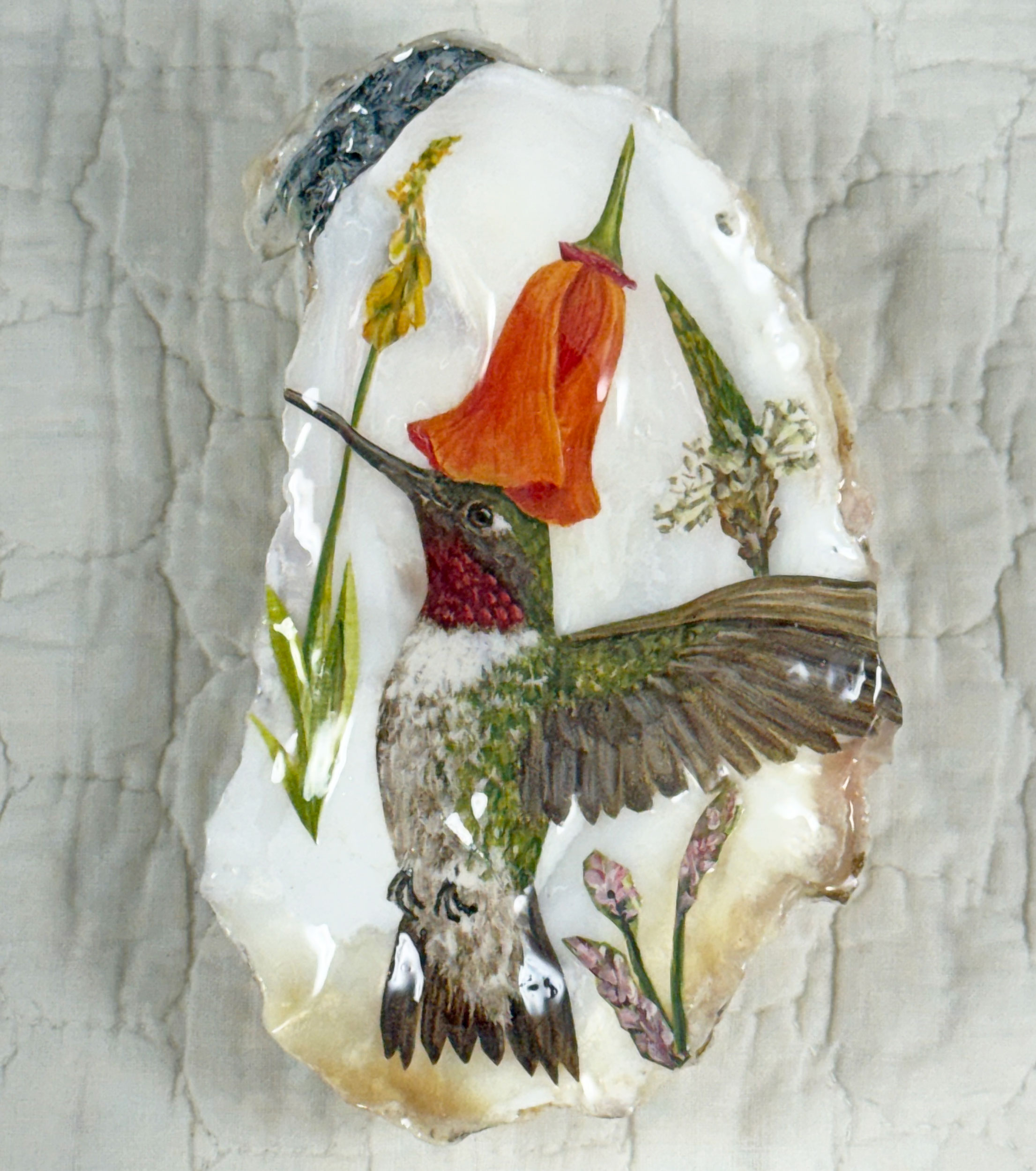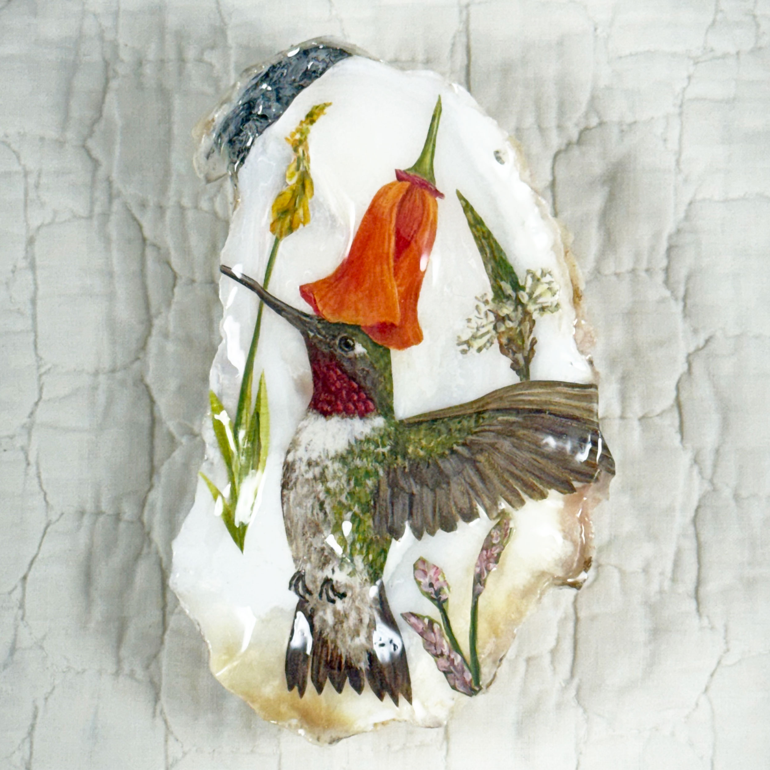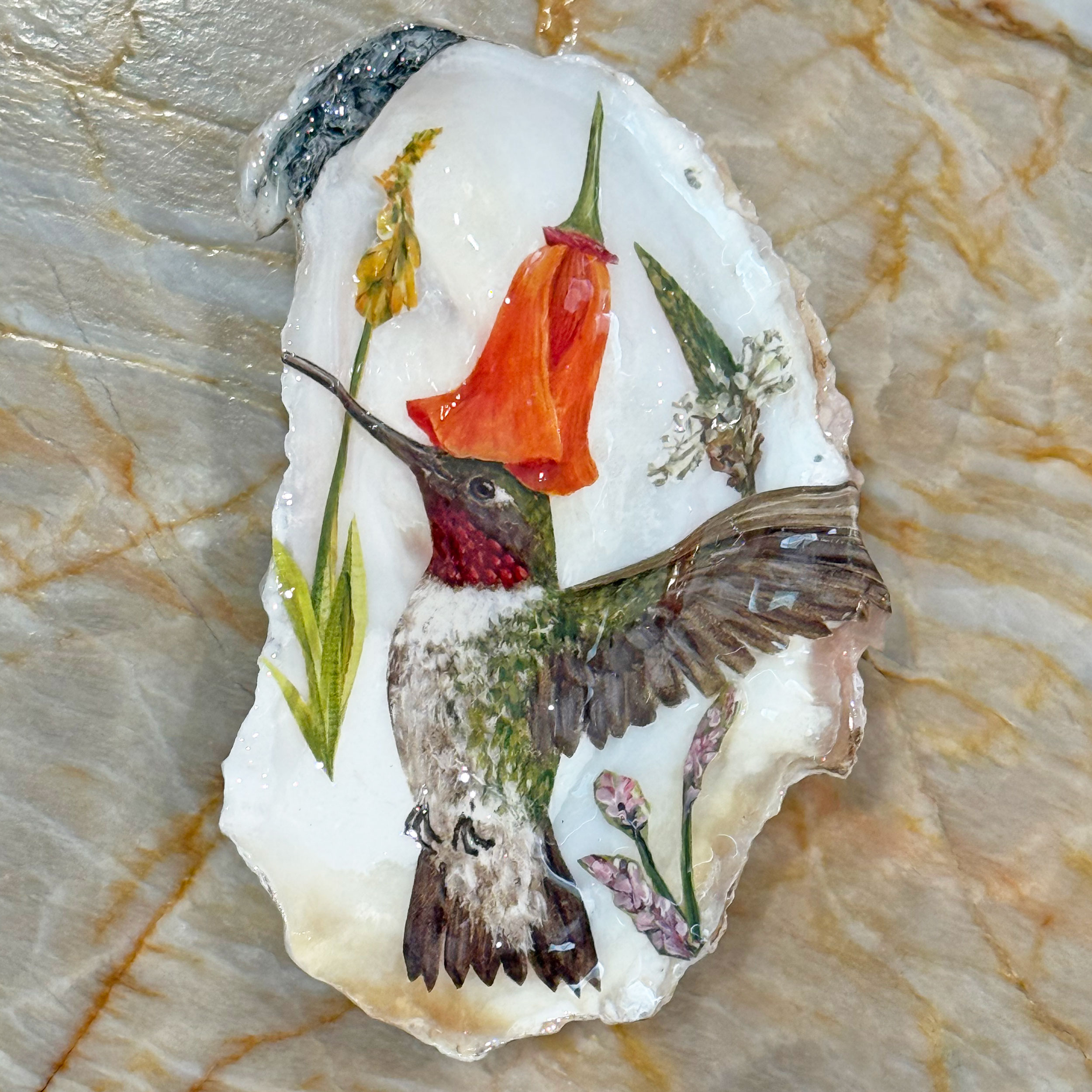 This oyster shell jewelry dish is both functional and decorative, featuring a hand-cut decoupage hummingbird and floral design. The natural oyster shell shimmers beneath layers of high-gloss resin, making each piece a one-of-a-kind work of coastal art.