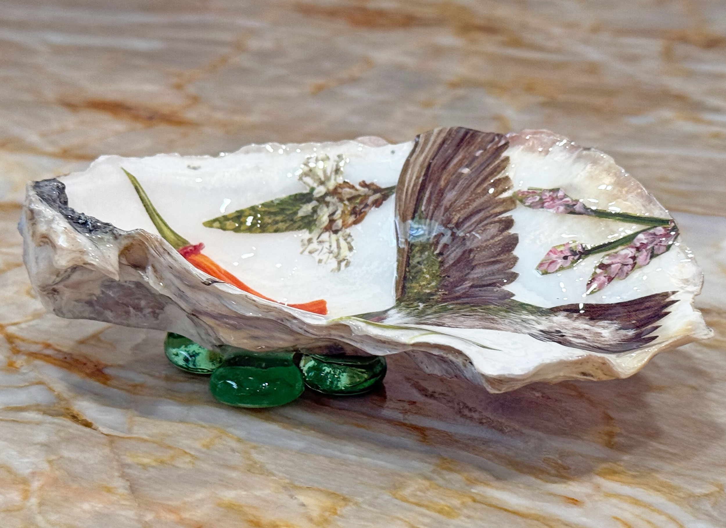 Decoupage Oyster Shell Jewelry Dish – Hummingbird and Flowers