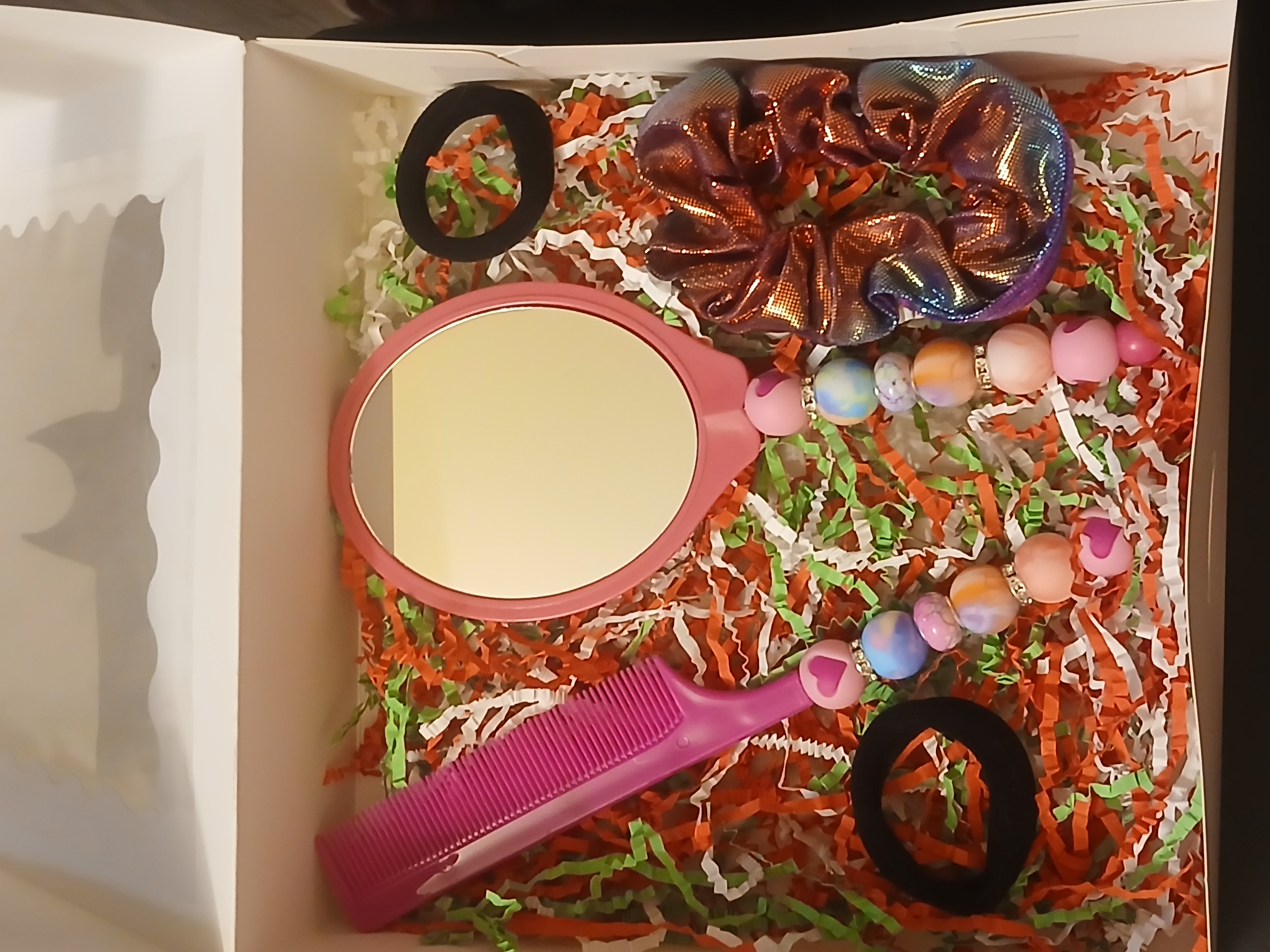This pink beaded hand mirror and comb set ha a rainbow metallic scrunchie and 2 black hair ties for accessories and all in a box ready for giving as a gift or keep for yourself