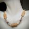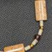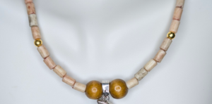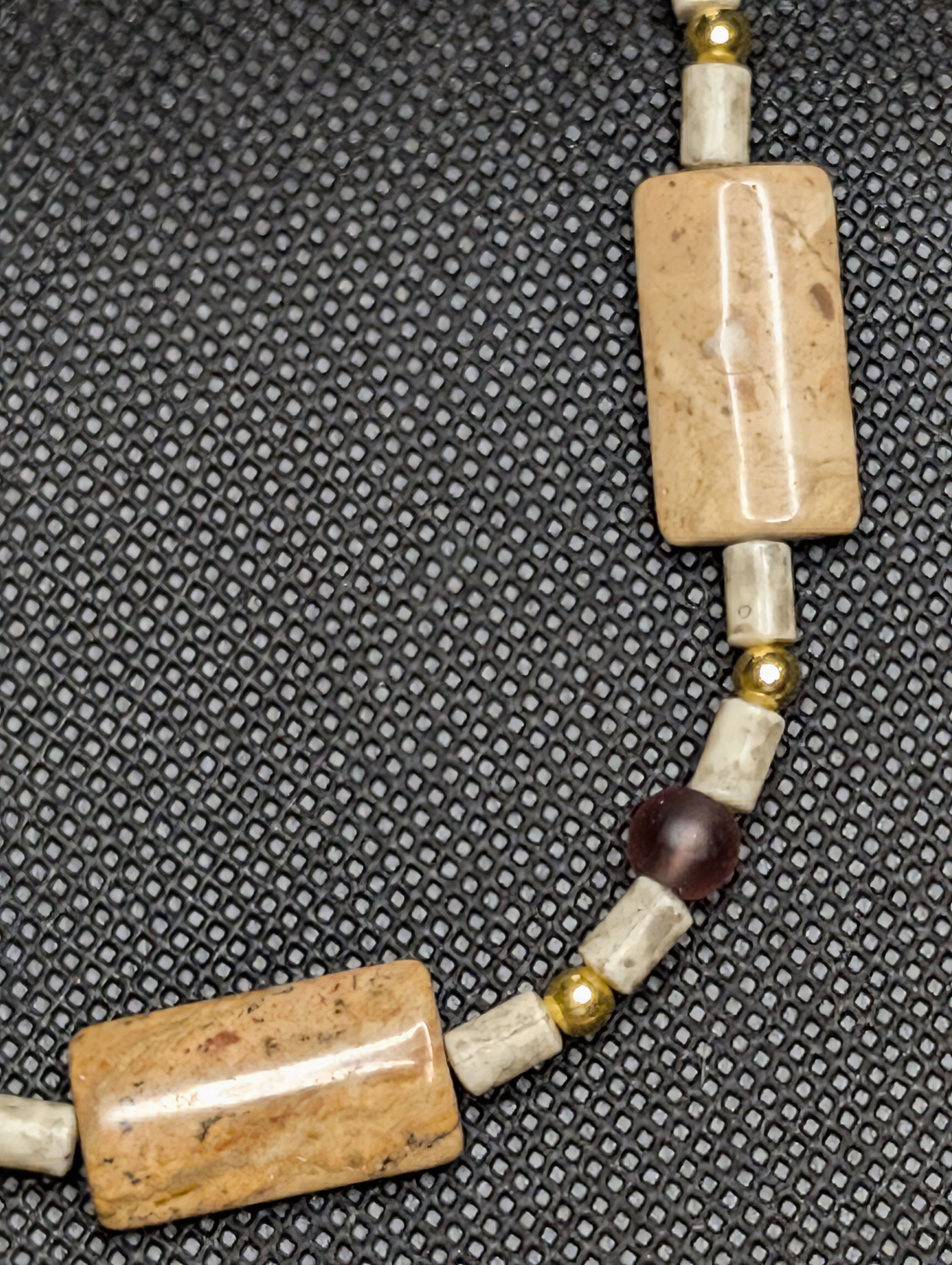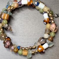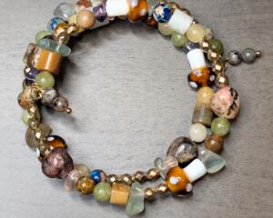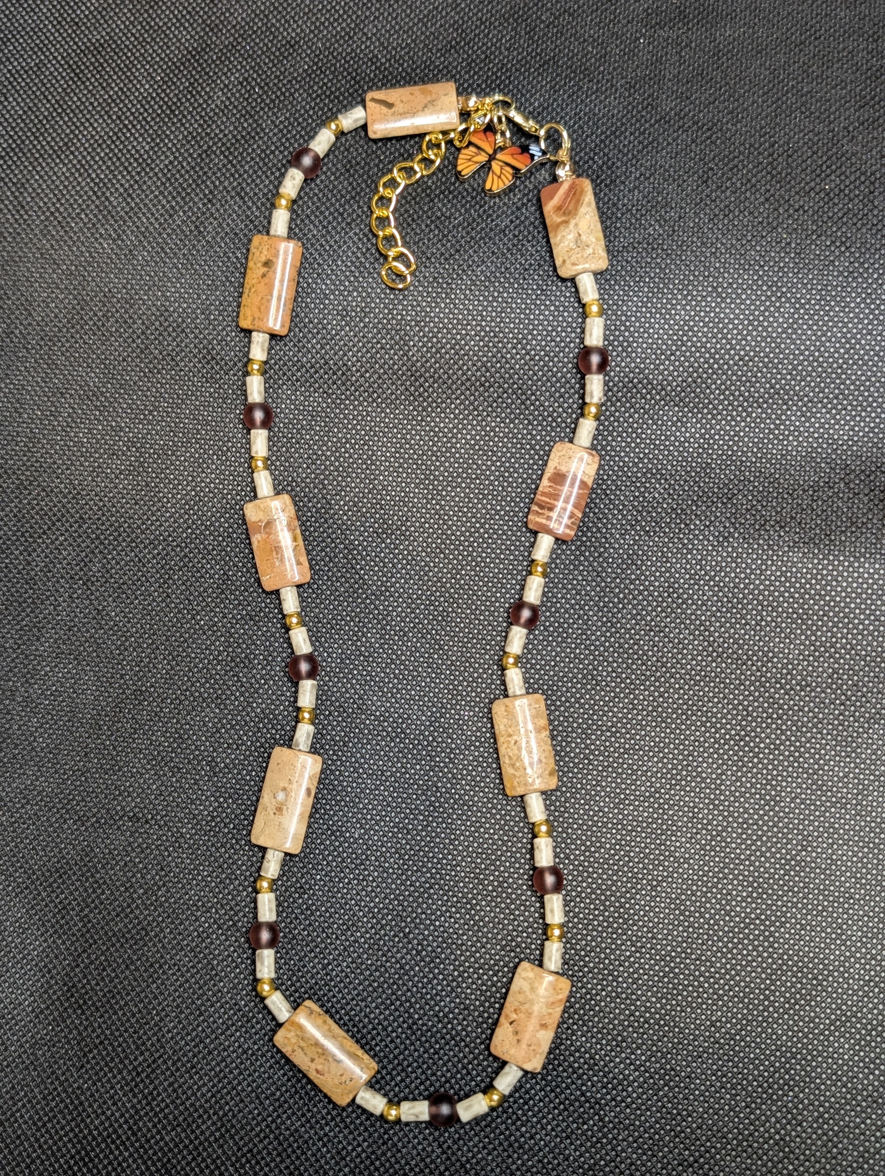 A blend of rectangular brown stone-like beads and smaller tan beads, beautifully accented with shimmering gold round beads were placed onto a 7 strand beading wire. This unique combination creates a sophisticated yet earthy look, perfect for both casual outings and elegant occasions. For the closure, a gold lobster clasp was used with a gold extension chain. An orange (monarch) butterfly charm was added.
