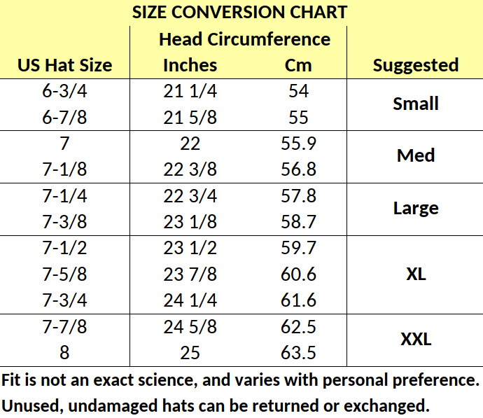 REMEMBER: Fitting your head isn’t an exact science, so we accept returns or exchanges on unused, undamaged hats.