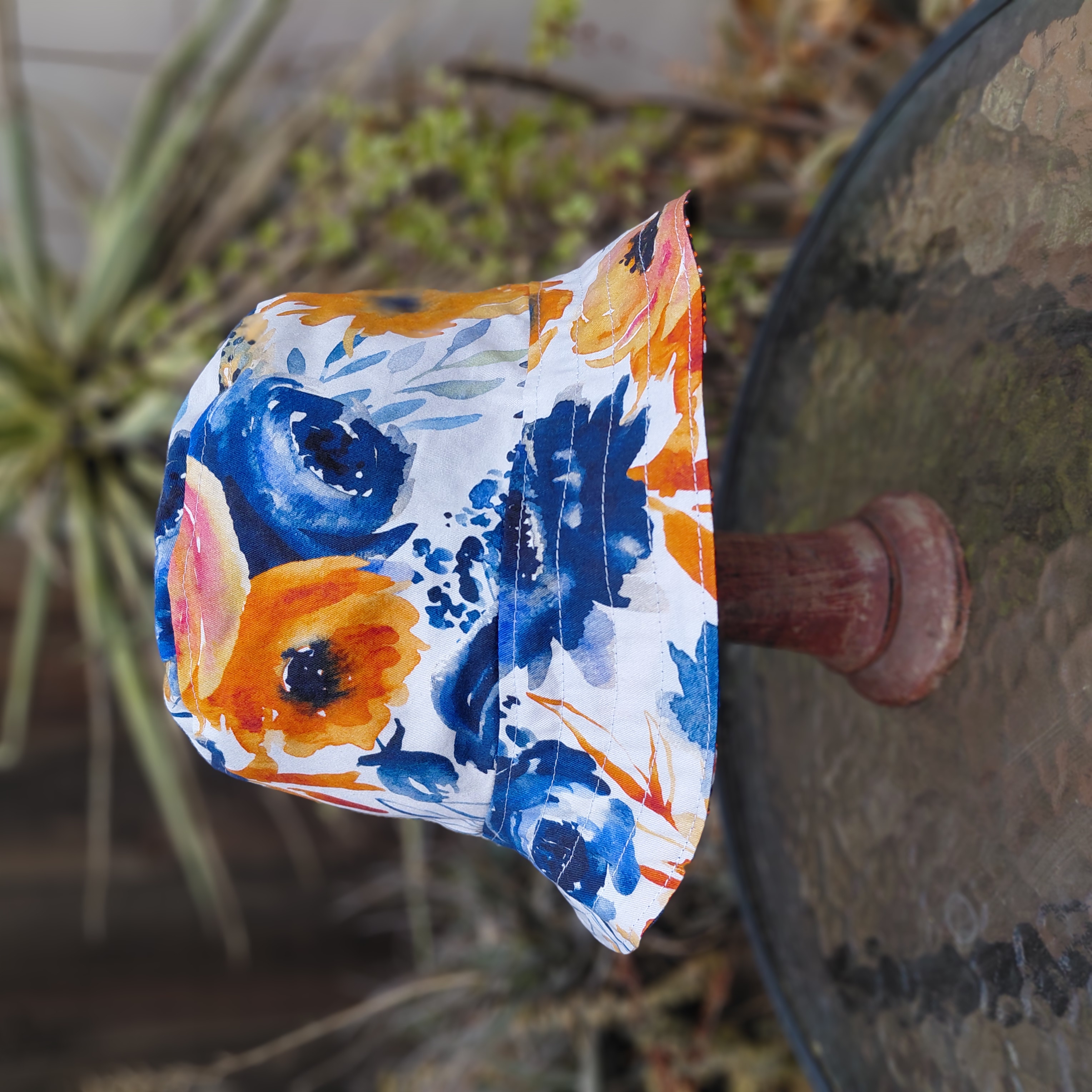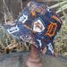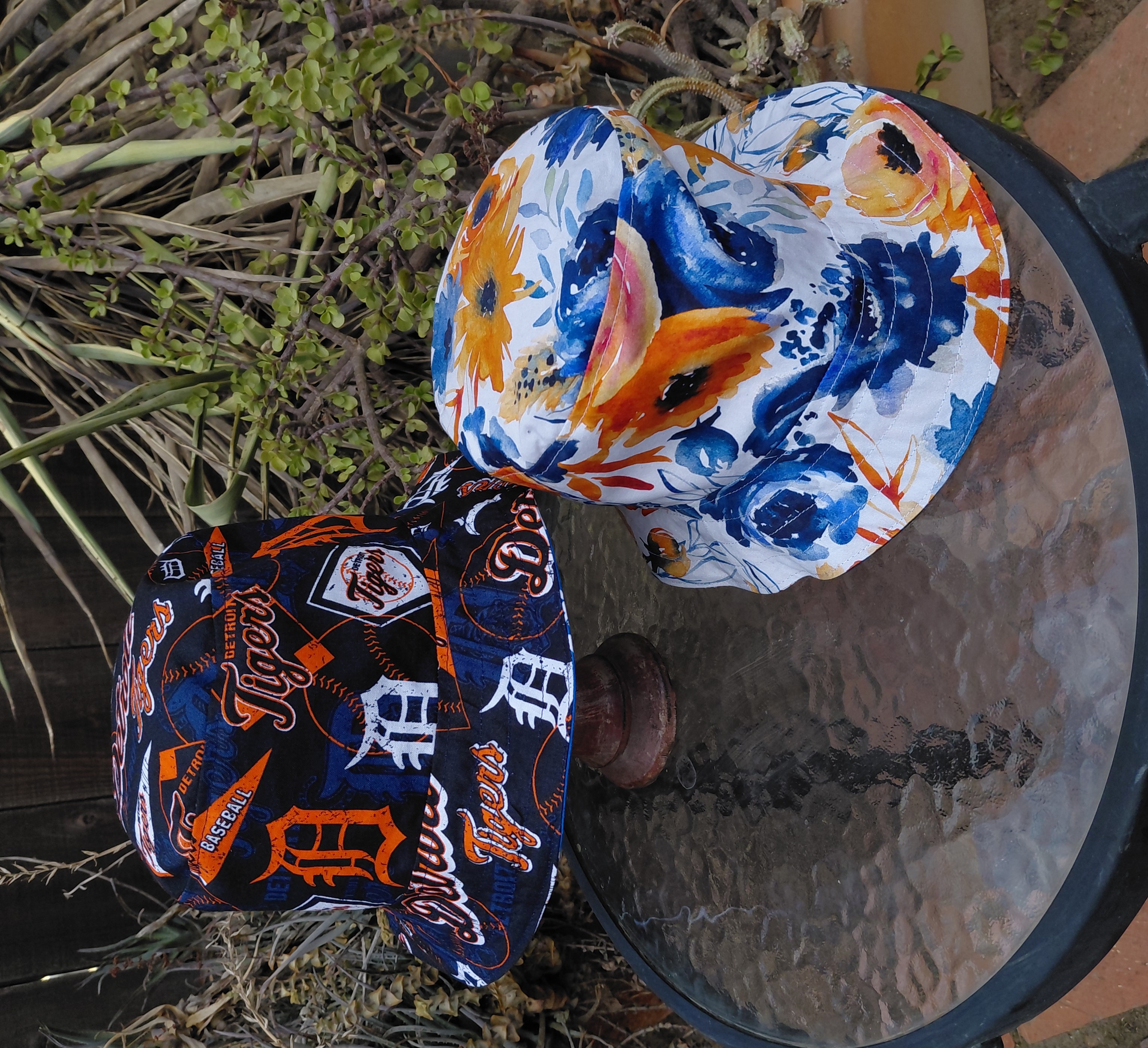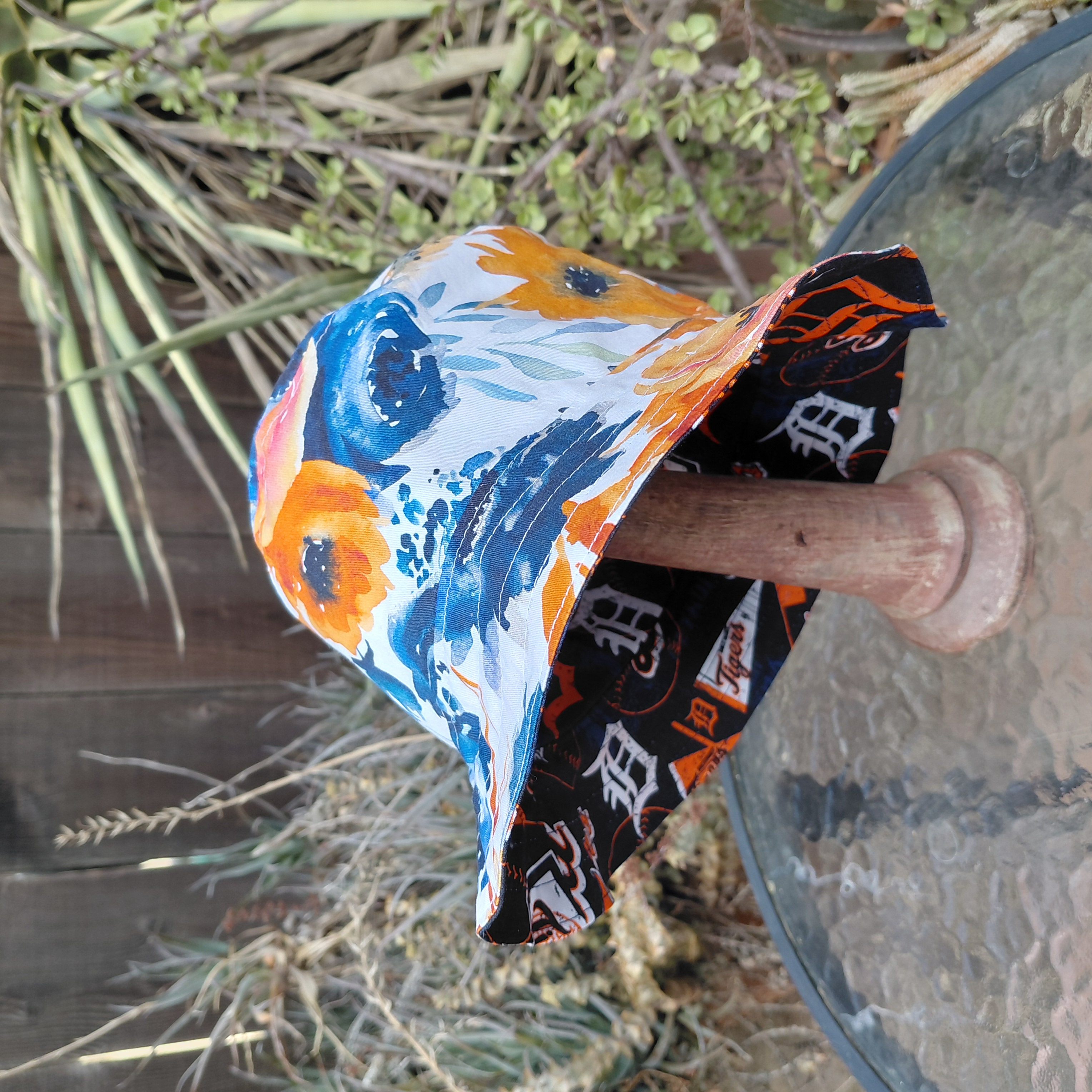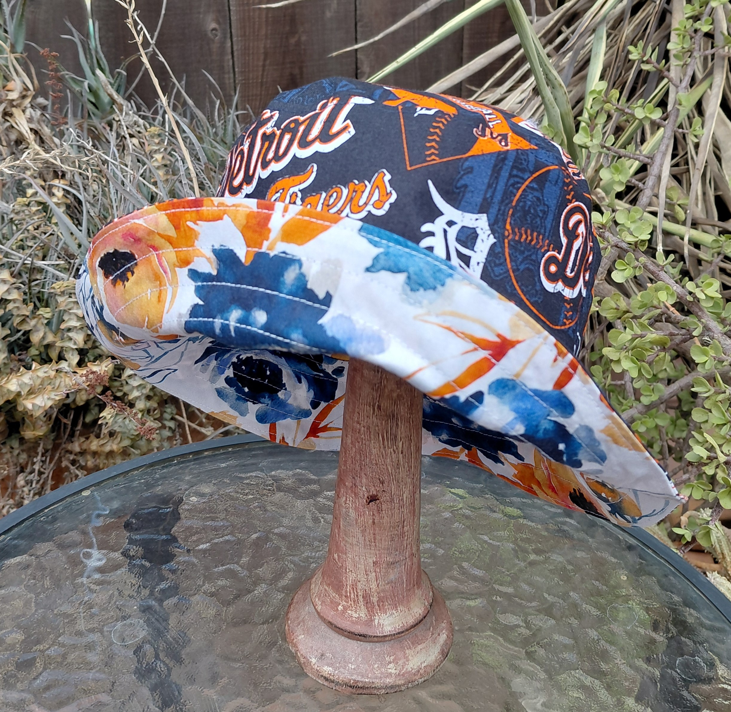 A reversible Detroit Tigers bucket hat featuring a Tigers logo fabric on one side, with a pretty blue and orange floral print on the other. Great gift for Michigan baseball fans! Not affiliated with the team or MLB in any way.