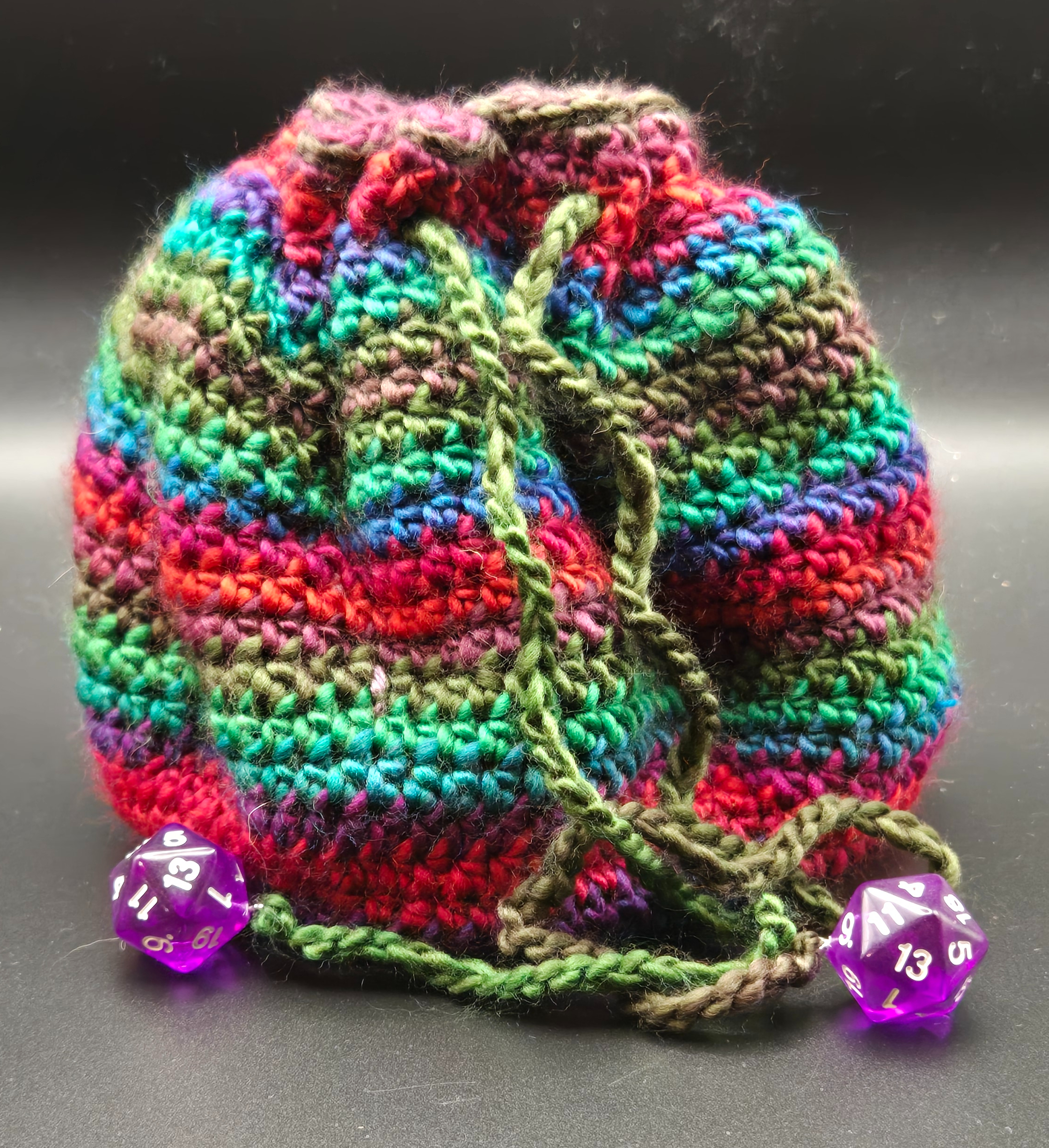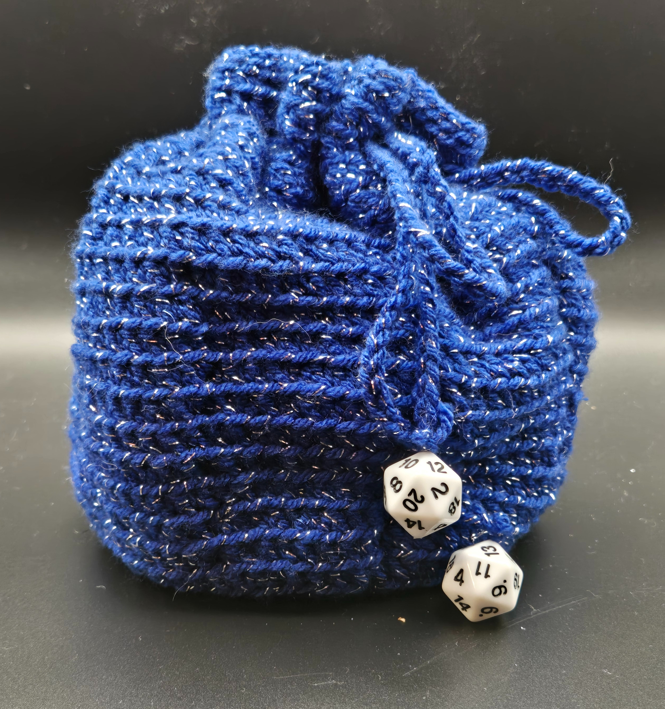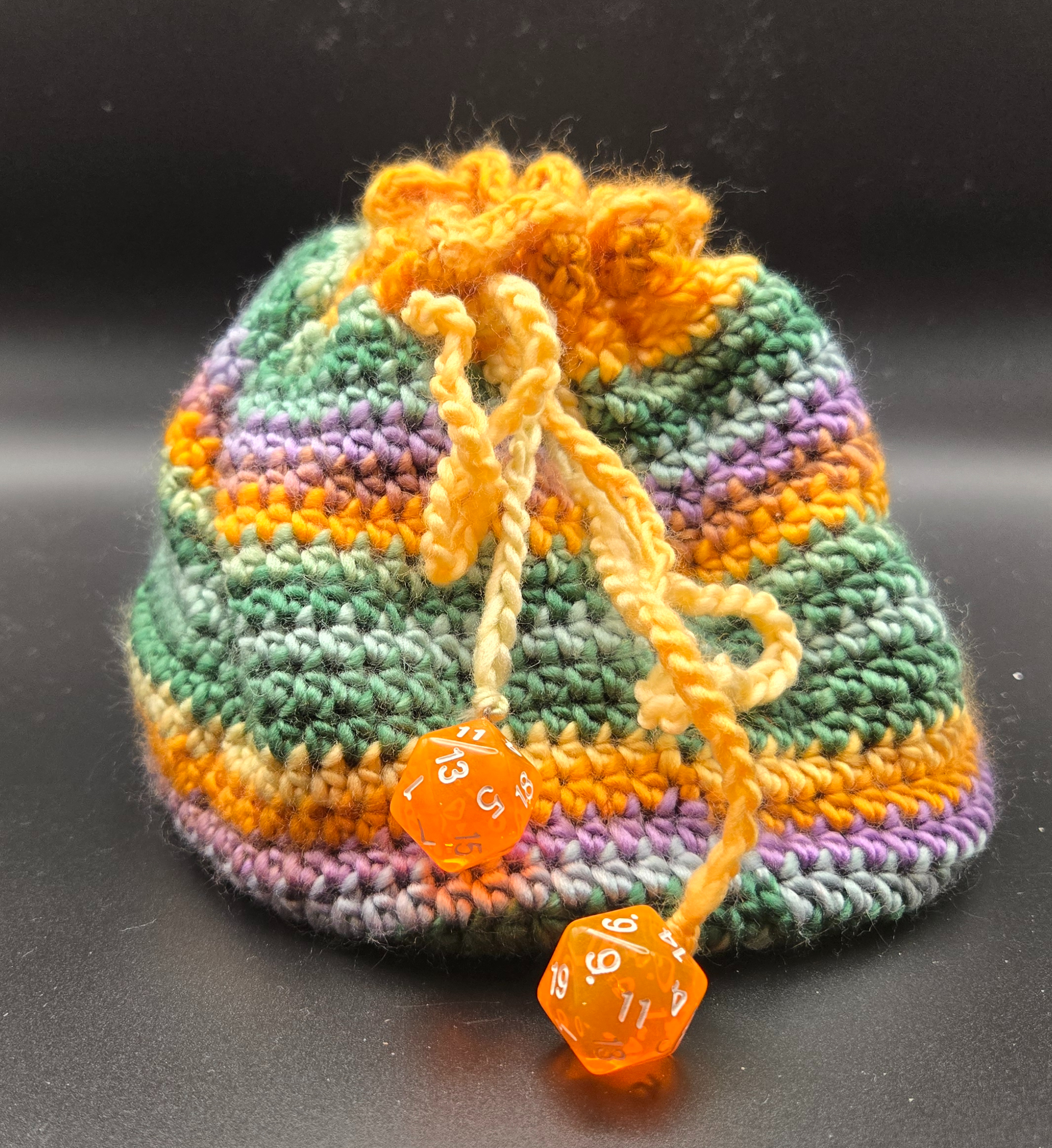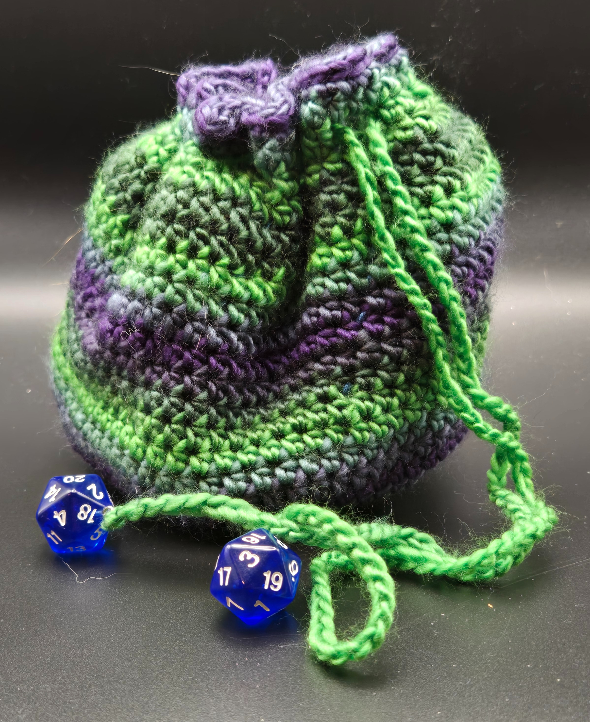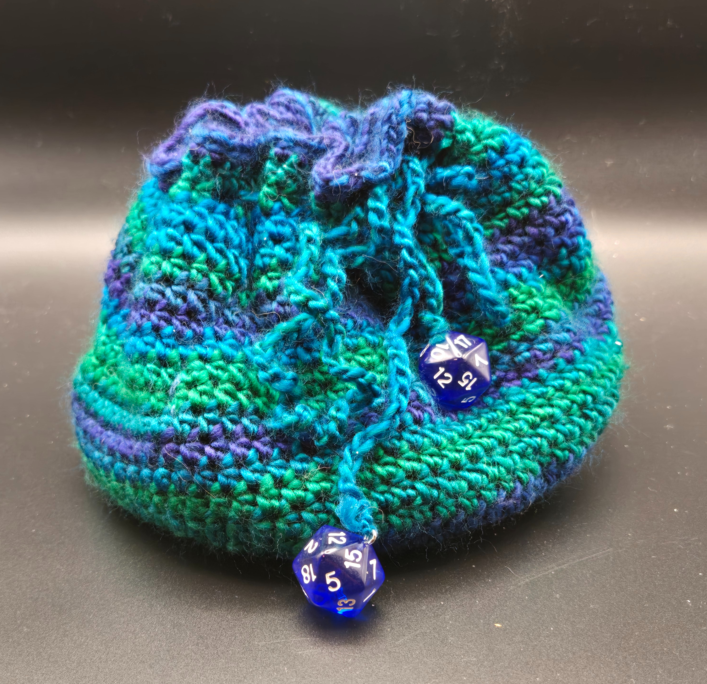 Crochet dice bags made by the Baroness. Measure approximately 8.5" long and 18" around. Inside has pocket organizers for all your many sets of Dice and the tie closure is decorated with D20 dice charms.