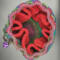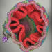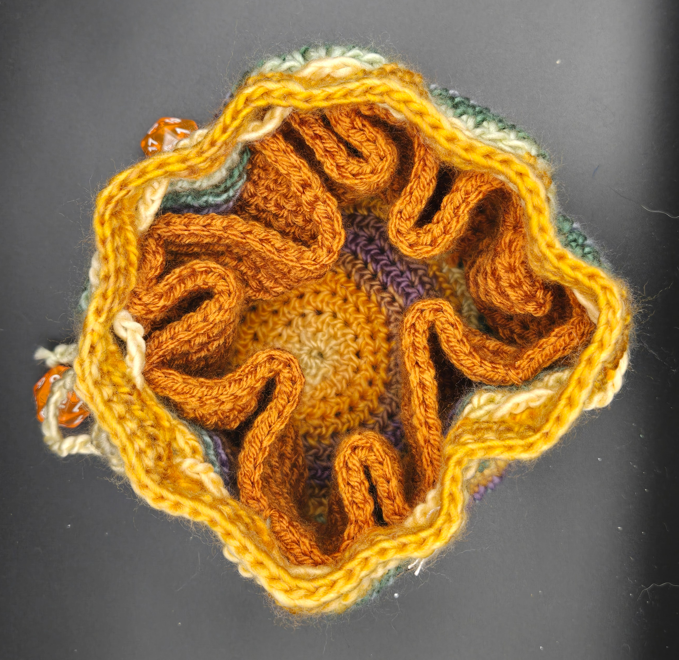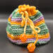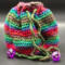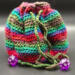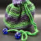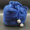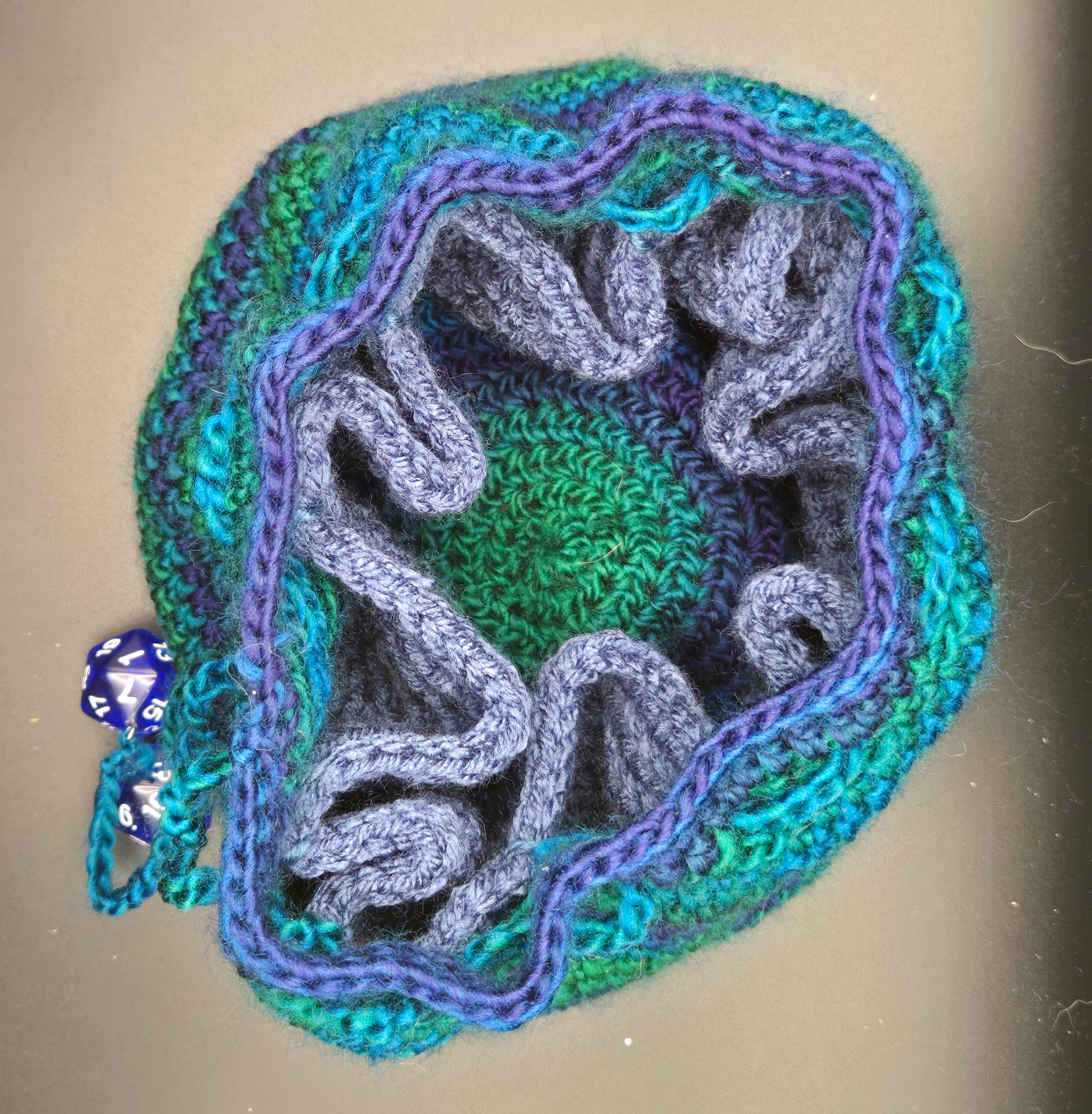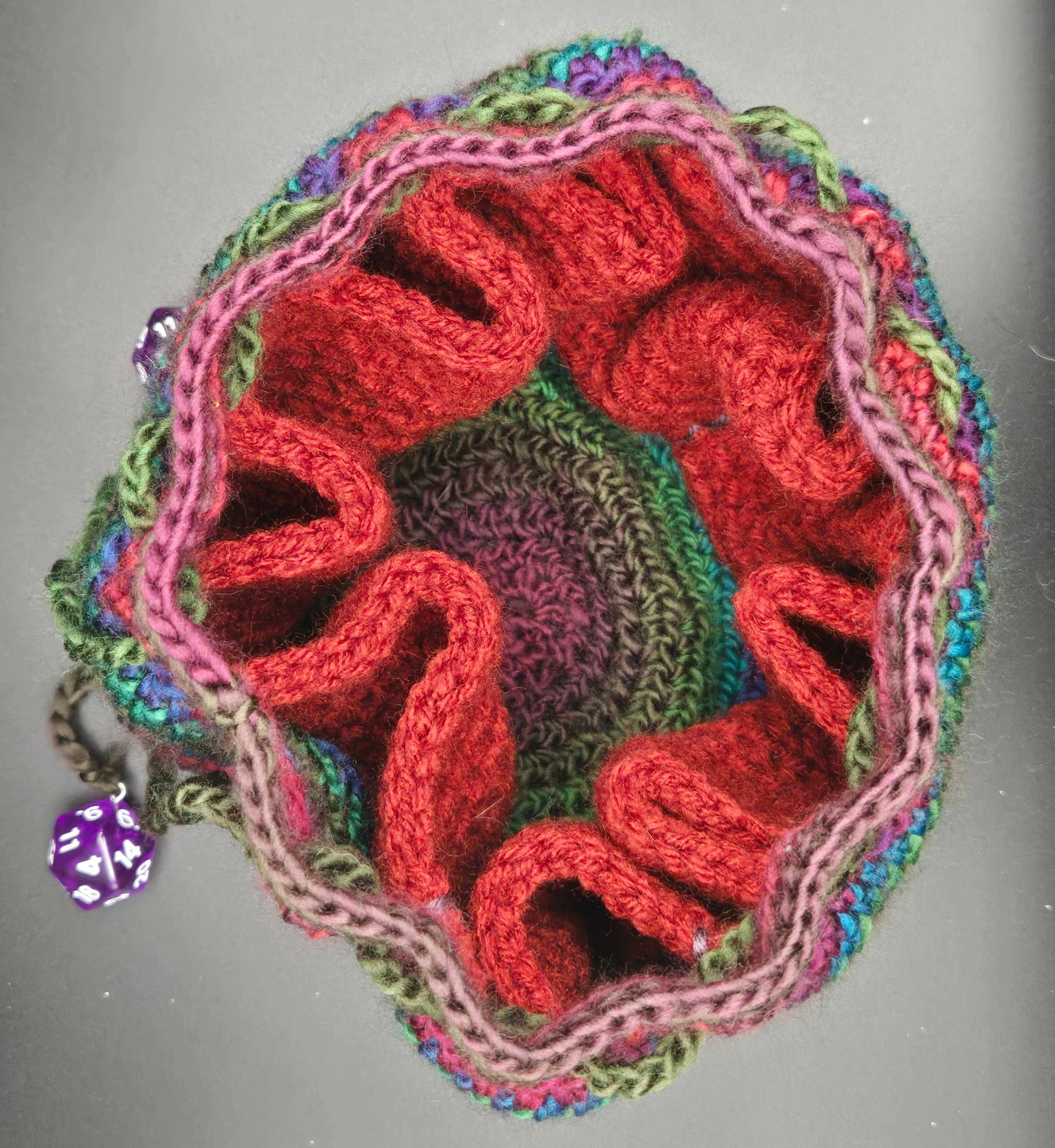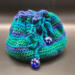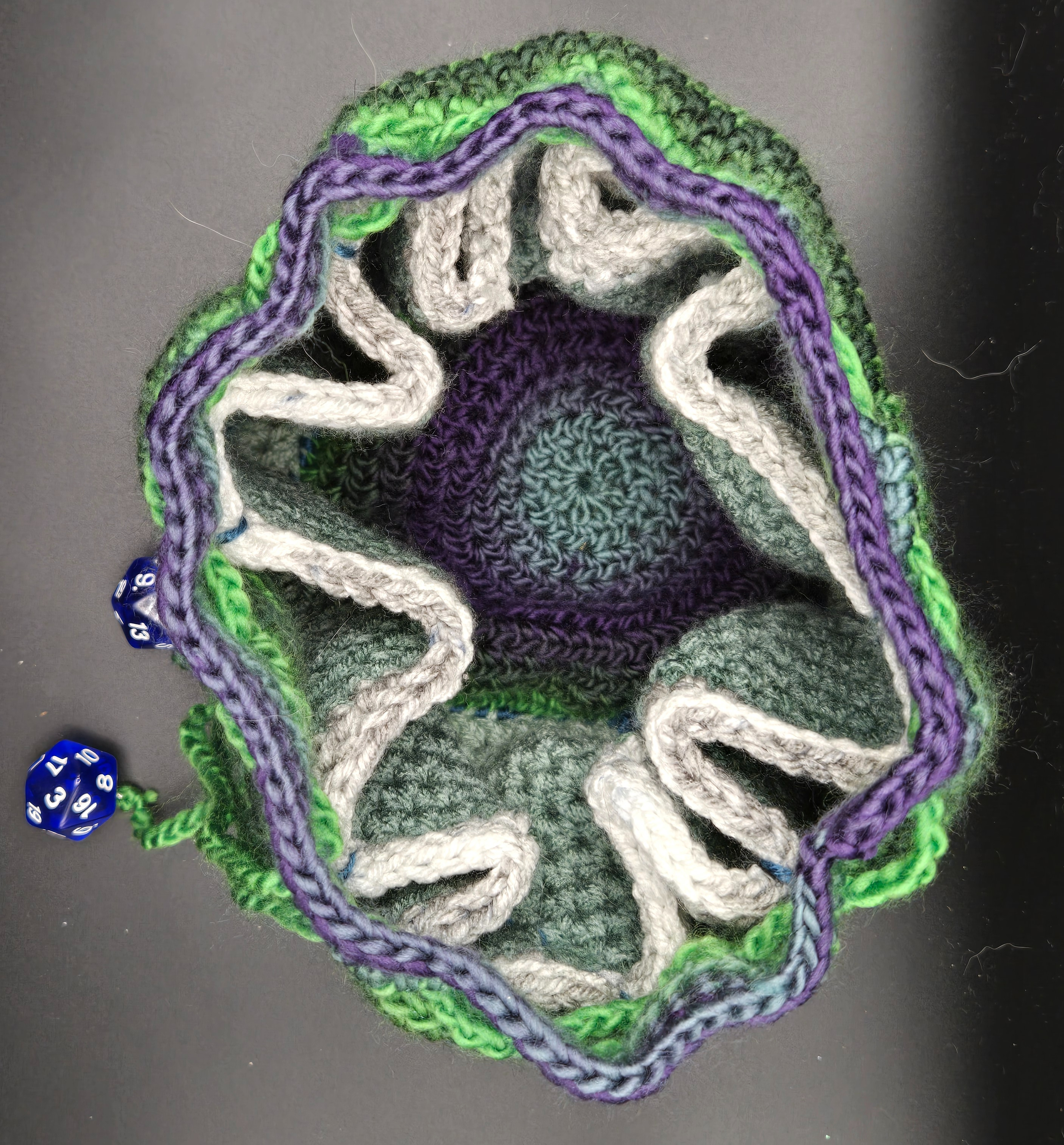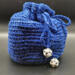 Crochet dice bags made by the Baroness. Measure approximately 8.5" long and 18" around. Inside has pocket organizers for all your many sets of Dice and the tie closure is decorated with D20 dice charms.