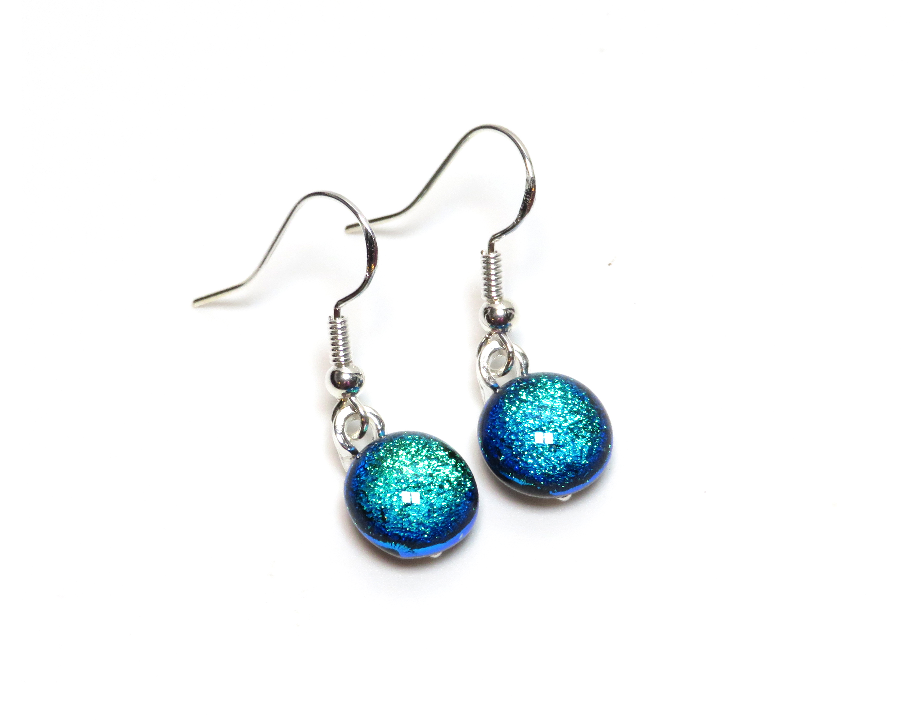 These blue dichroic glass dangle earrings are handcrafted adding a unique and colorful touch to any outfit. The dichroic glass is known for its shimmering, multi-colored appearance. The earrings are held in place by French hook ear wires made of sterling silver, adding a touch of luxury to the design. These earrings are proudly handmade in the USA and are perfect for adding a statement piece to your jewelry collection.