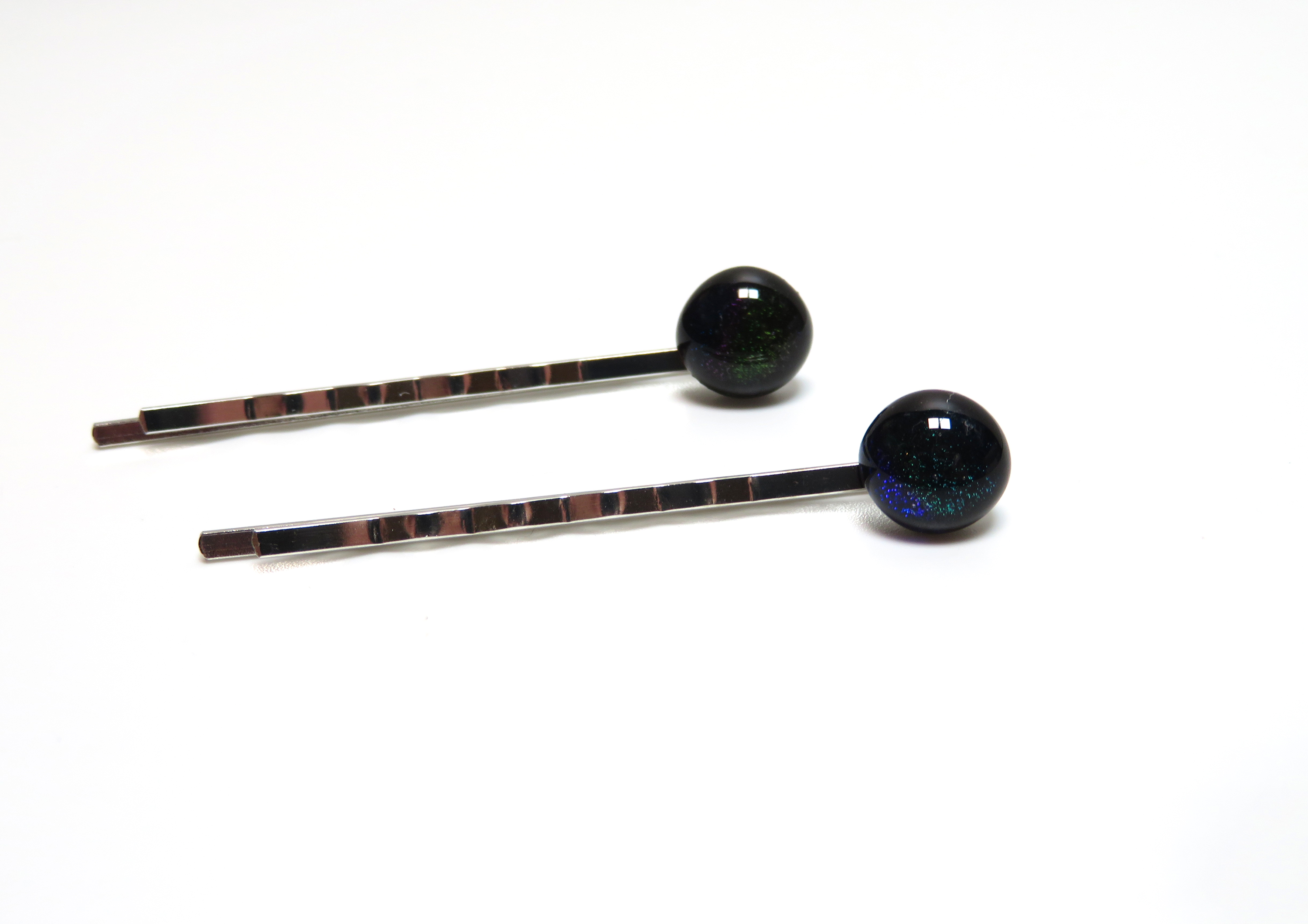 These dark purple handmade dichroic glass bobby pins are a unique and stylish way to add a touch of color and elegance to your hair. The bobby pins are made with dichroic glass, which is known for its shimmering, multi-colored appearance. They can be used to hold hair in place or as a decorative hair accessory.