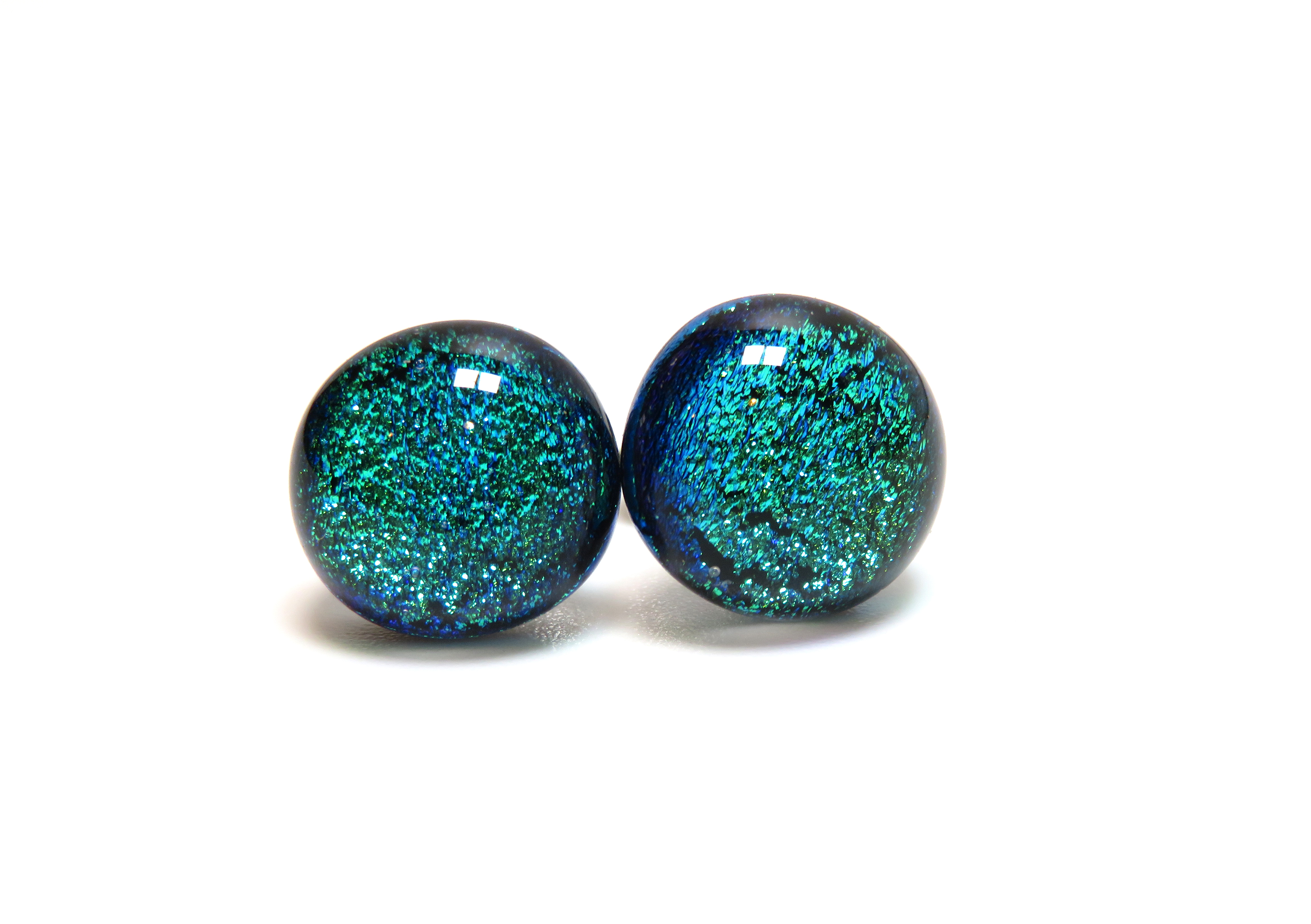These stunning dichroic glass stud earrings are a perfect accessory for any occasion. The earrings feature stunning, iridescent dichroic glass cabochons that shimmer and shine in the light, catching the eye with their beautiful rainbow hues. The cabochons are set on top of titanium posts, providing a durable and hypoallergenic base for the earrings.
