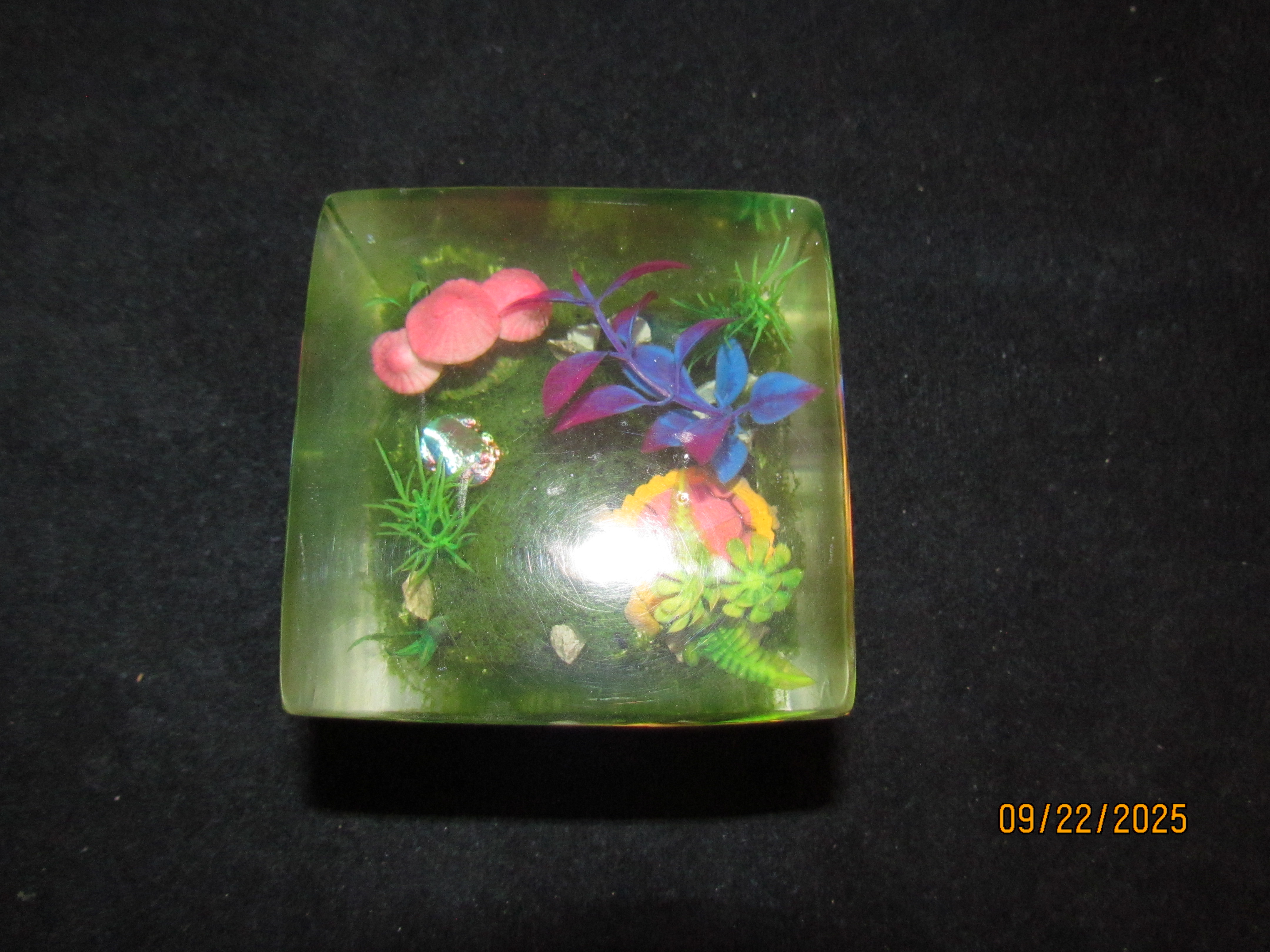 this piece has a black/white turtle, pink frog, dark red mushrooms, green plants