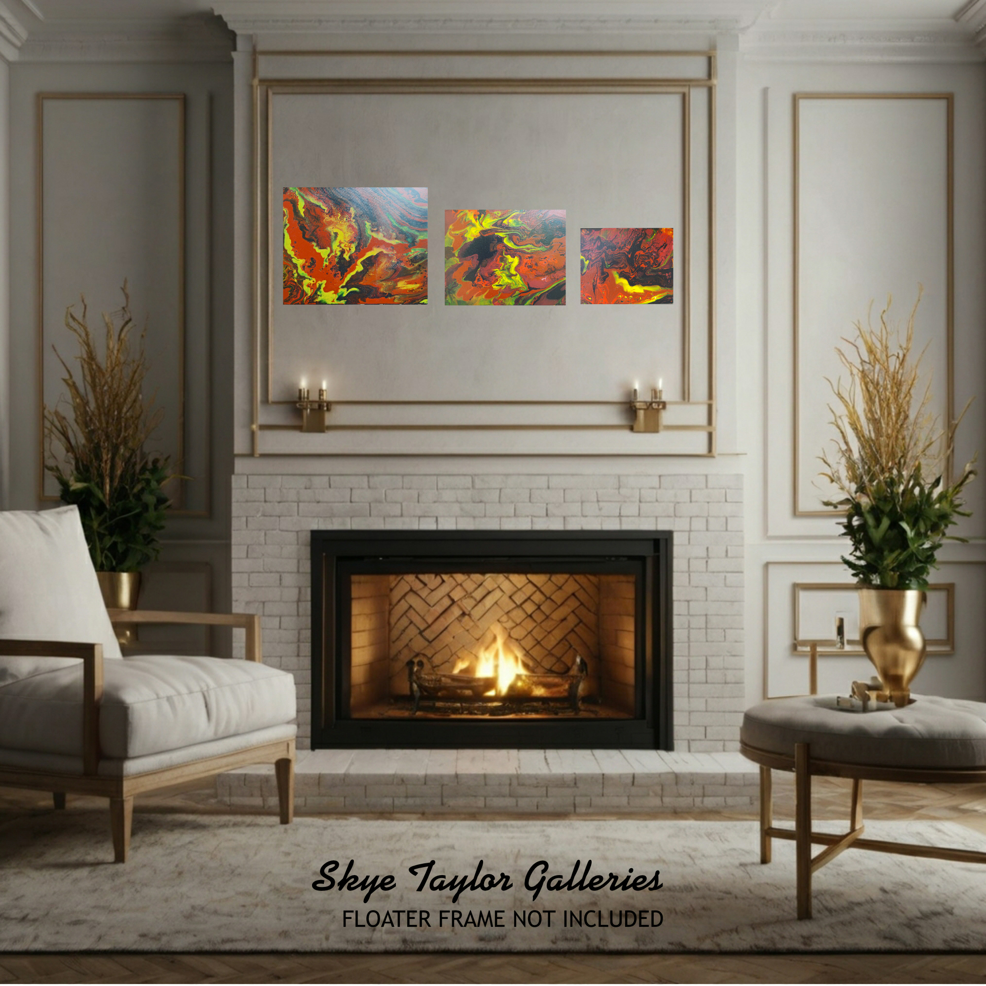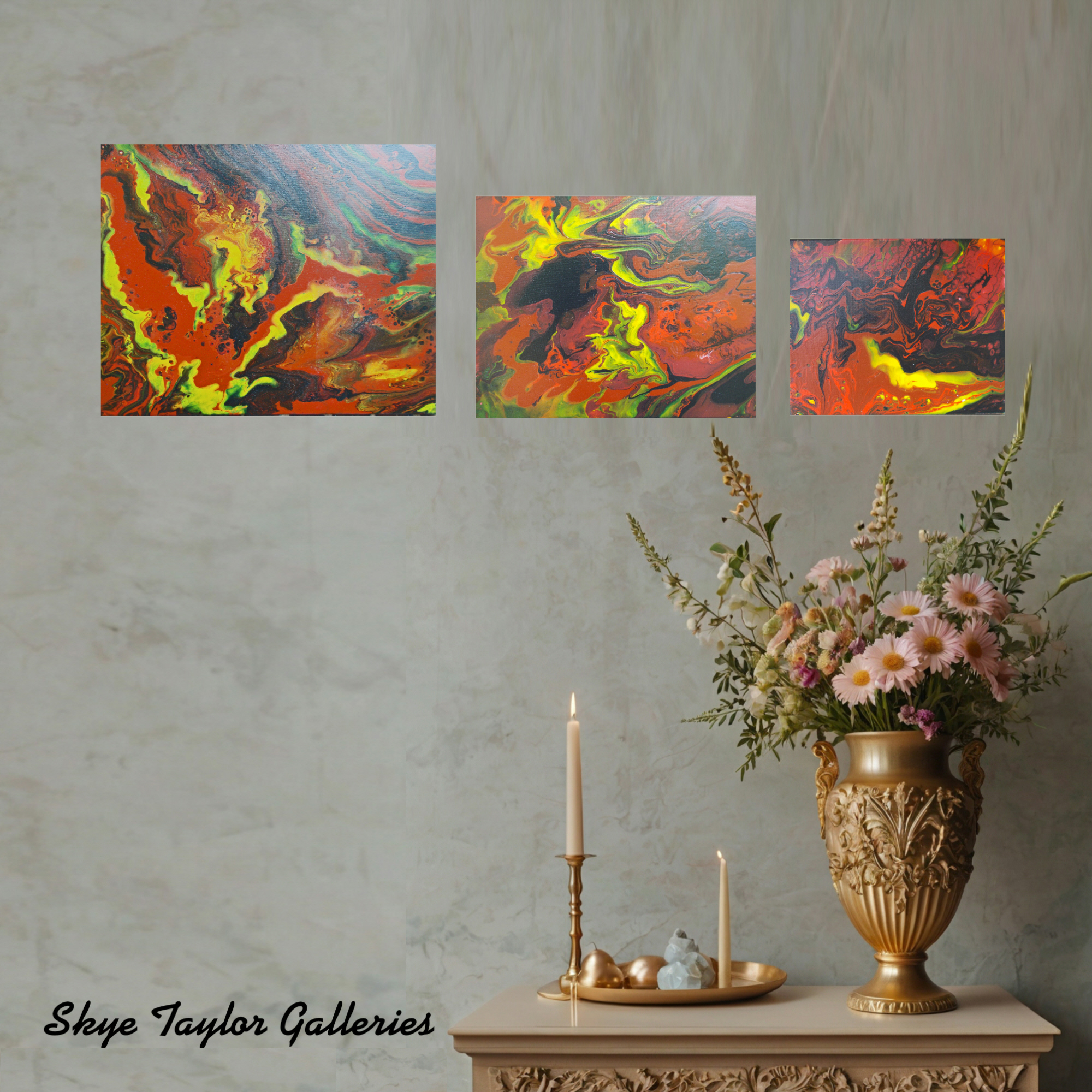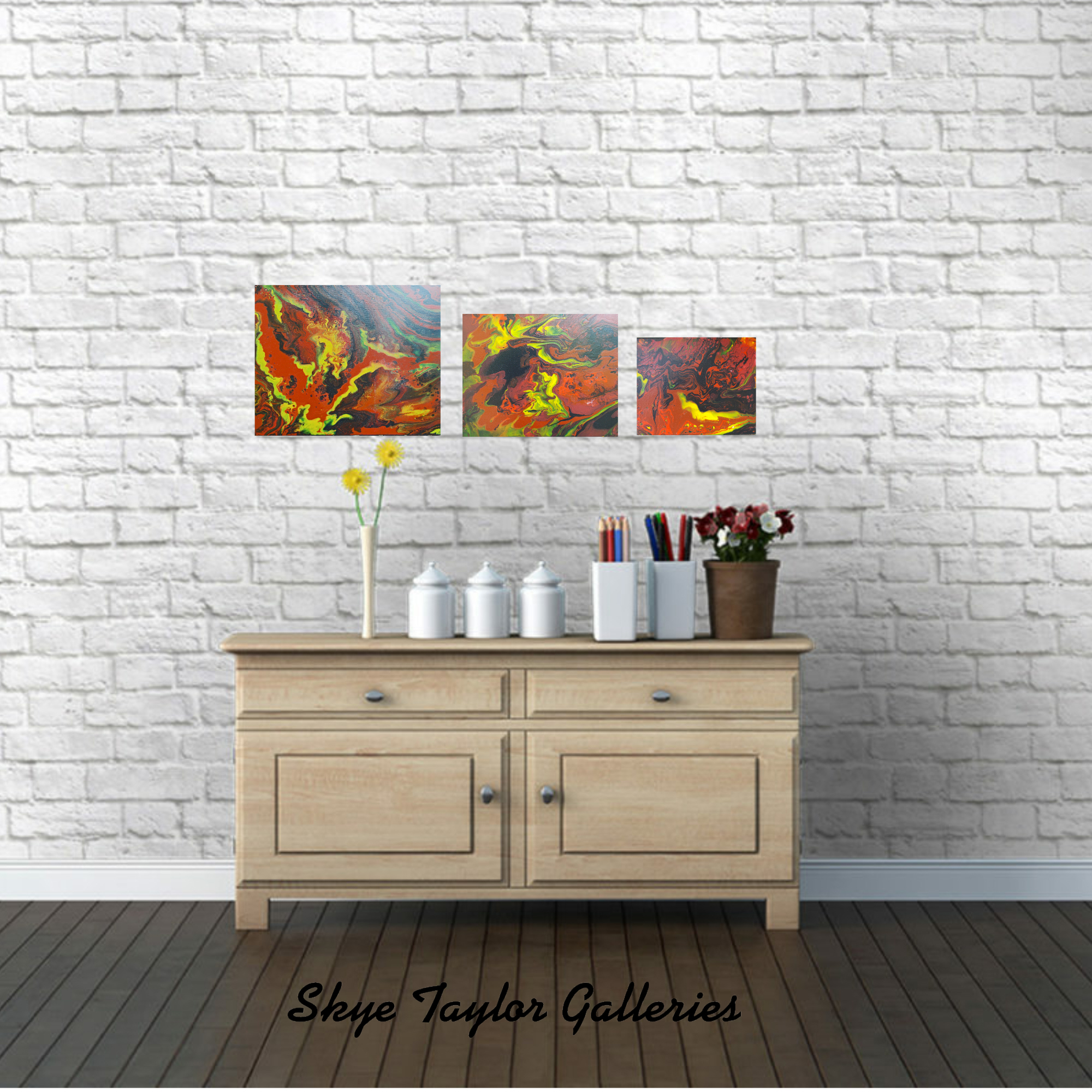 Unleash the bold energy of contemporary expression with this captivating 3-piece Red Abstract Triptych by renowned artist Skye Taylor. This collection of assorted-size pour paintings commands attention with fiery reds, molten oranges, electric yellows, and deep blacks—all fluidly dancing across each canvas in a vivid, dynamic display. Taylor’s signature technique of acrylic pouring allows colors to merge organically, creating depth and movement that shifts with the light. Perfect for modern interiors or bold, eclectic spaces, this triptych brings both warmth and powerful emotion to any wall it graces.