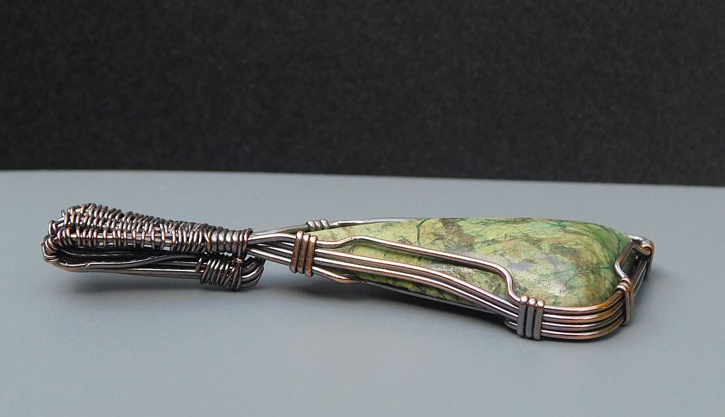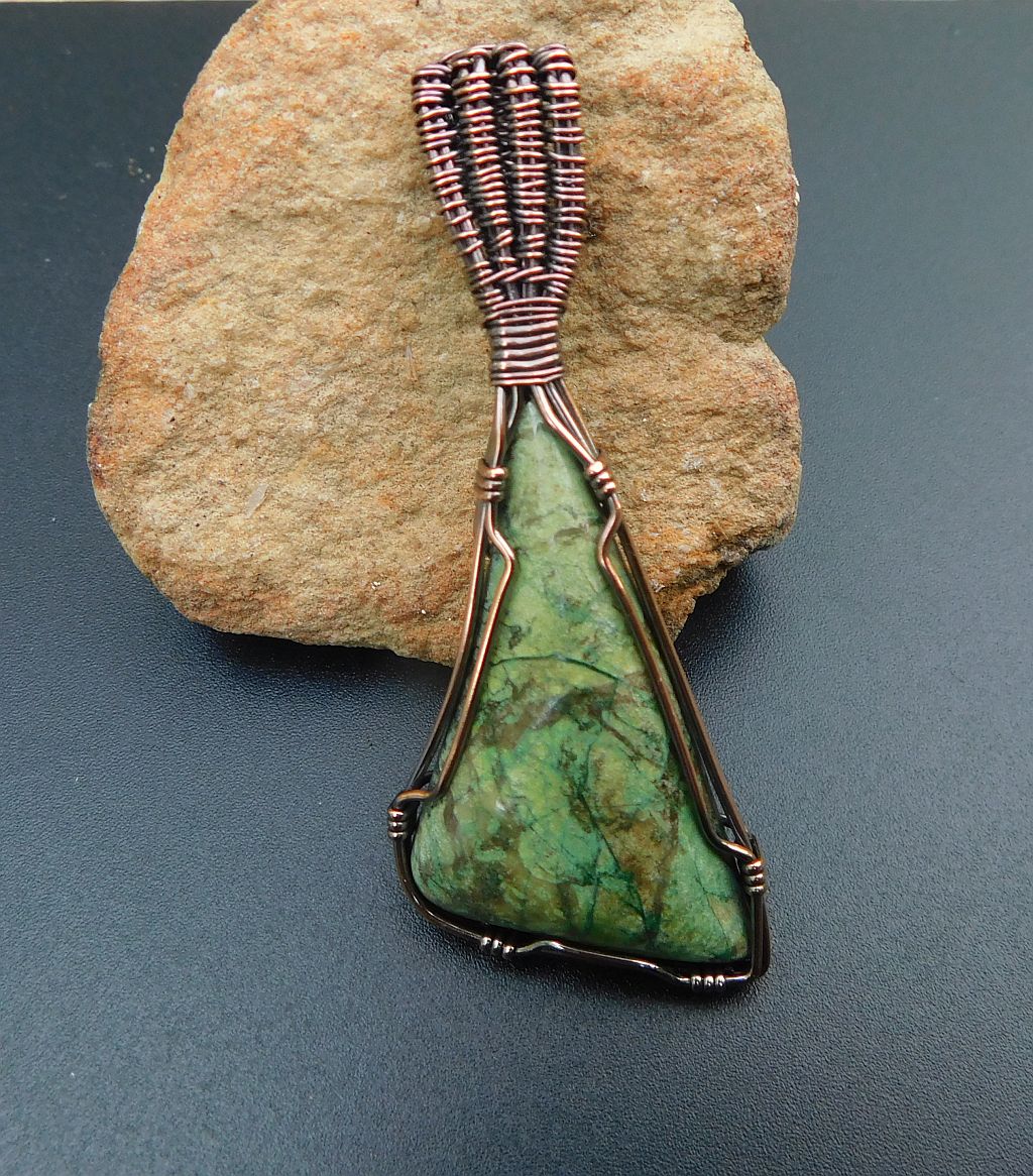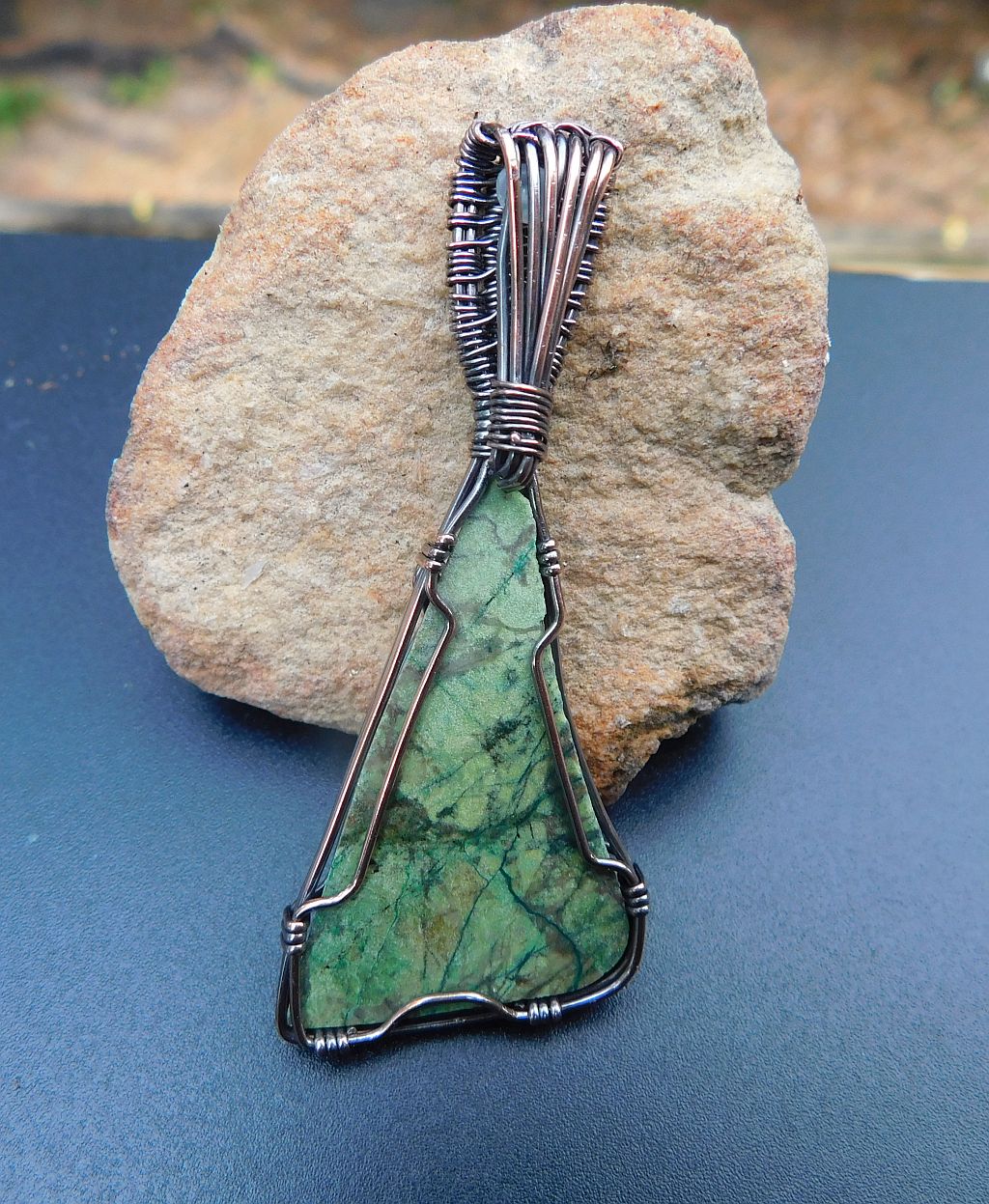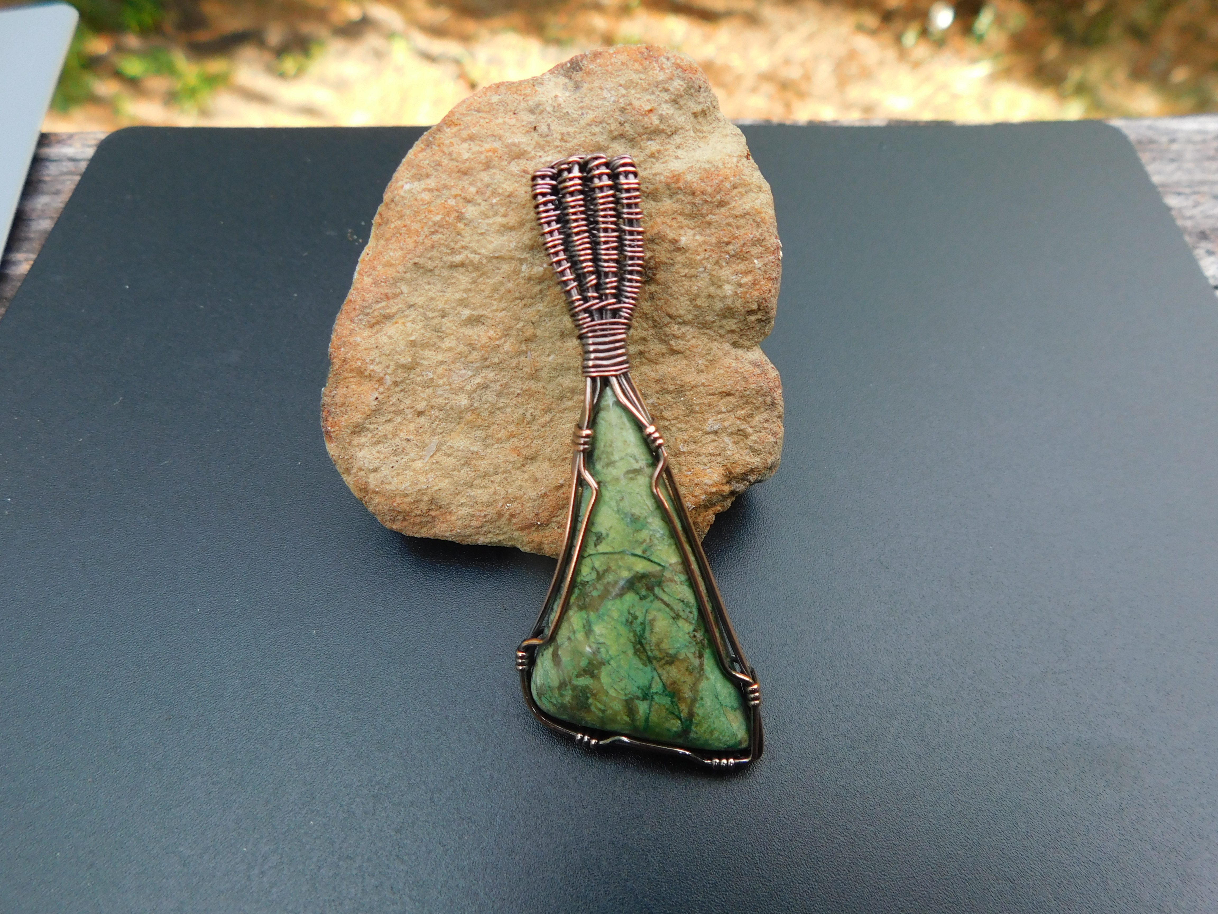 Make a statement with this graceful yet bold copper wrapped chrysocolla pendant.