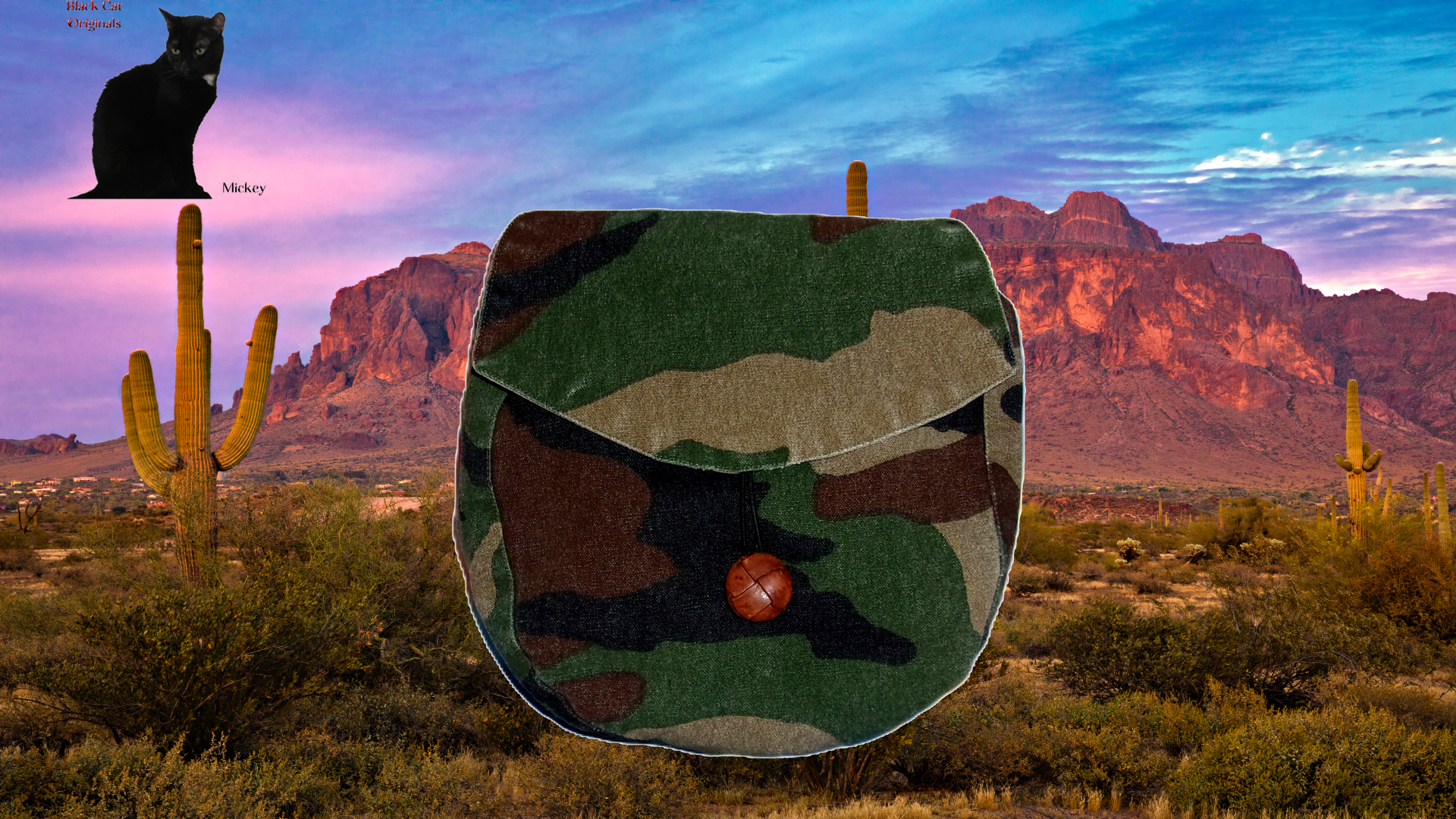 Machine and hand stitching. Waterproofed polyester canvas "distressed" camouflage. Cotton twill interior.
