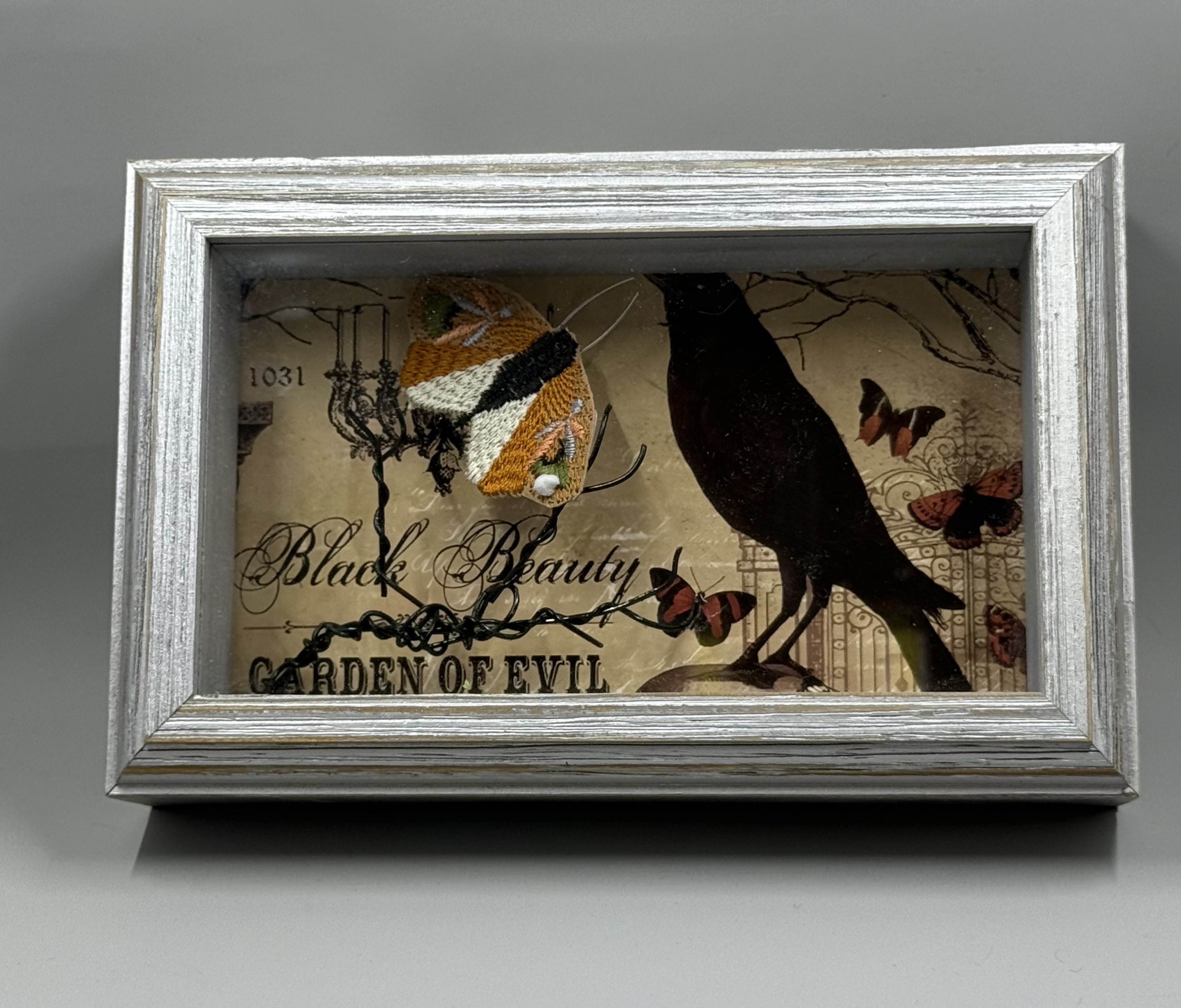 This mix media sculpture is in a 7 x 4 1/2” distressed wood frame. We have a vintage style backdrop with an embroidered moth resting on a wire sculptured tree, one of a kind