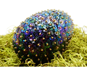 Each of my ornaments and decorative eggs are meticulously hand crafted - one tiny bead at a time - by me. There isn't a factory involved. Is it time-consuming, yes. But I really enjoy the tactile process of creating each ornament. So whether I'm using carefully curated ribbons & adorable toppers, or individually placed Czech glass beads with color coordinated sequins on a satin-wrapped foam shape, each is truly unique. My decorative eggs are versatile, either displayed in groupings in a bowl as though a very glam Easter bunny left them for you, or as an ornament for an Easter Tree. These sparkling beauties could also double as a Christmas ornament sparkling from the lights of your tree.